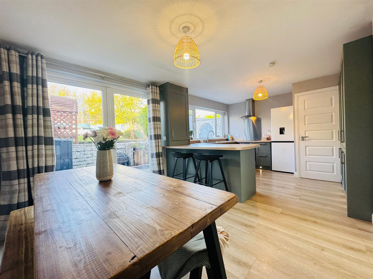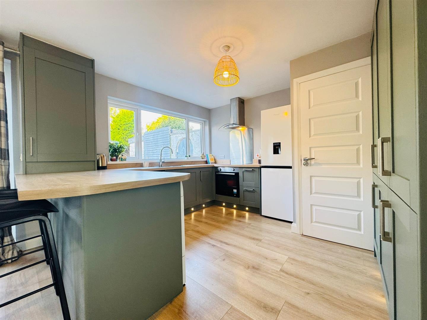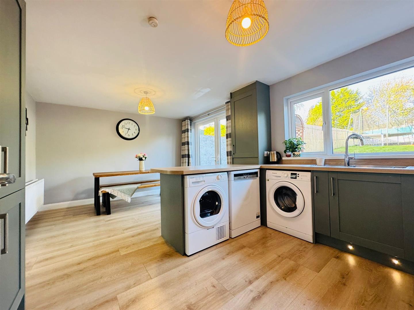 Modern range of high and low level units, worktop, single drainer sink unit, built in stainless steel under oven, ceramic hob, stainless steel extractor fan, fridge / freezer space, plumbed for washing machine & dishwasher, breakfast bar, gas boiler, radiator, pvc double glazed double doors to rear