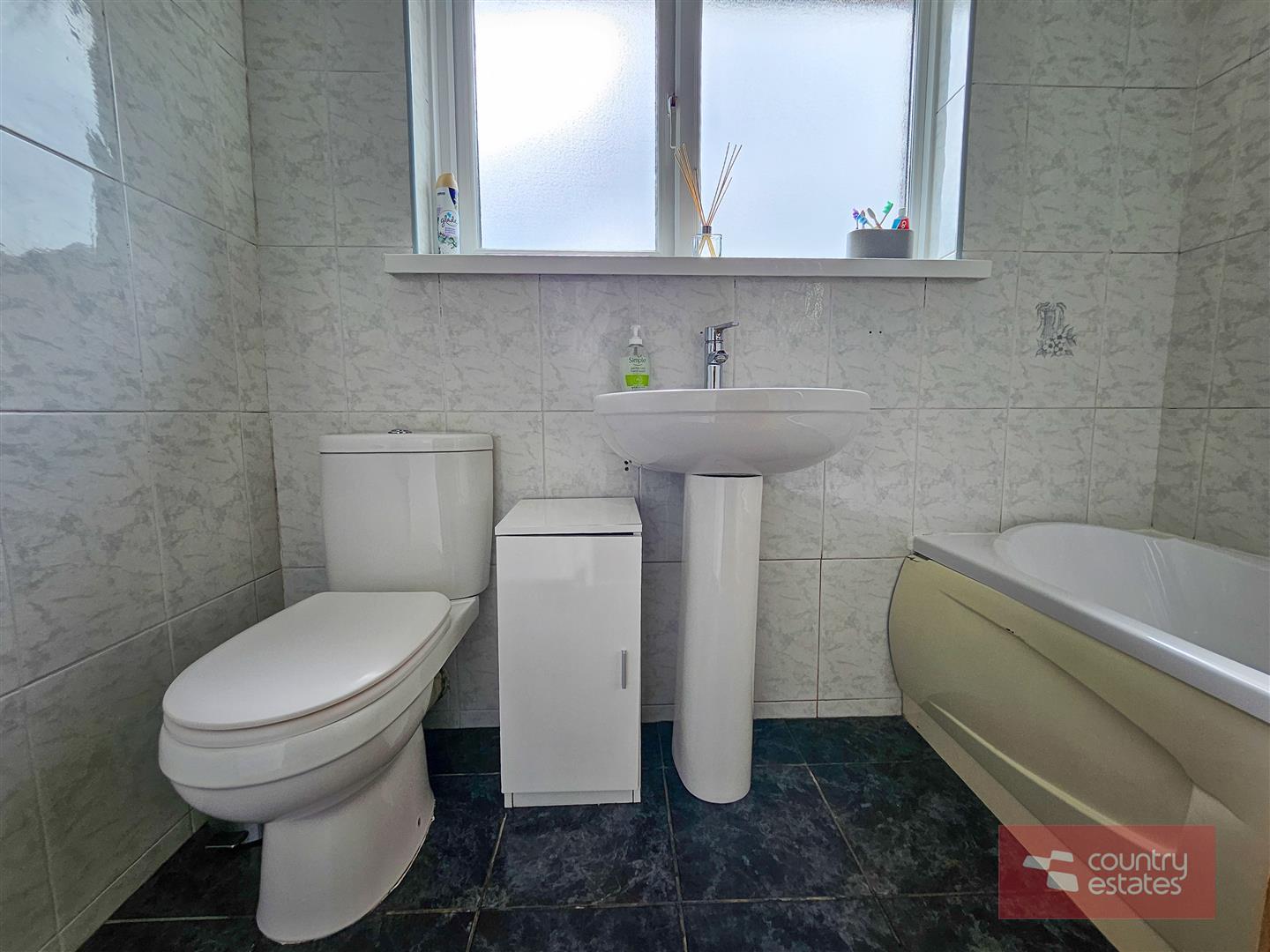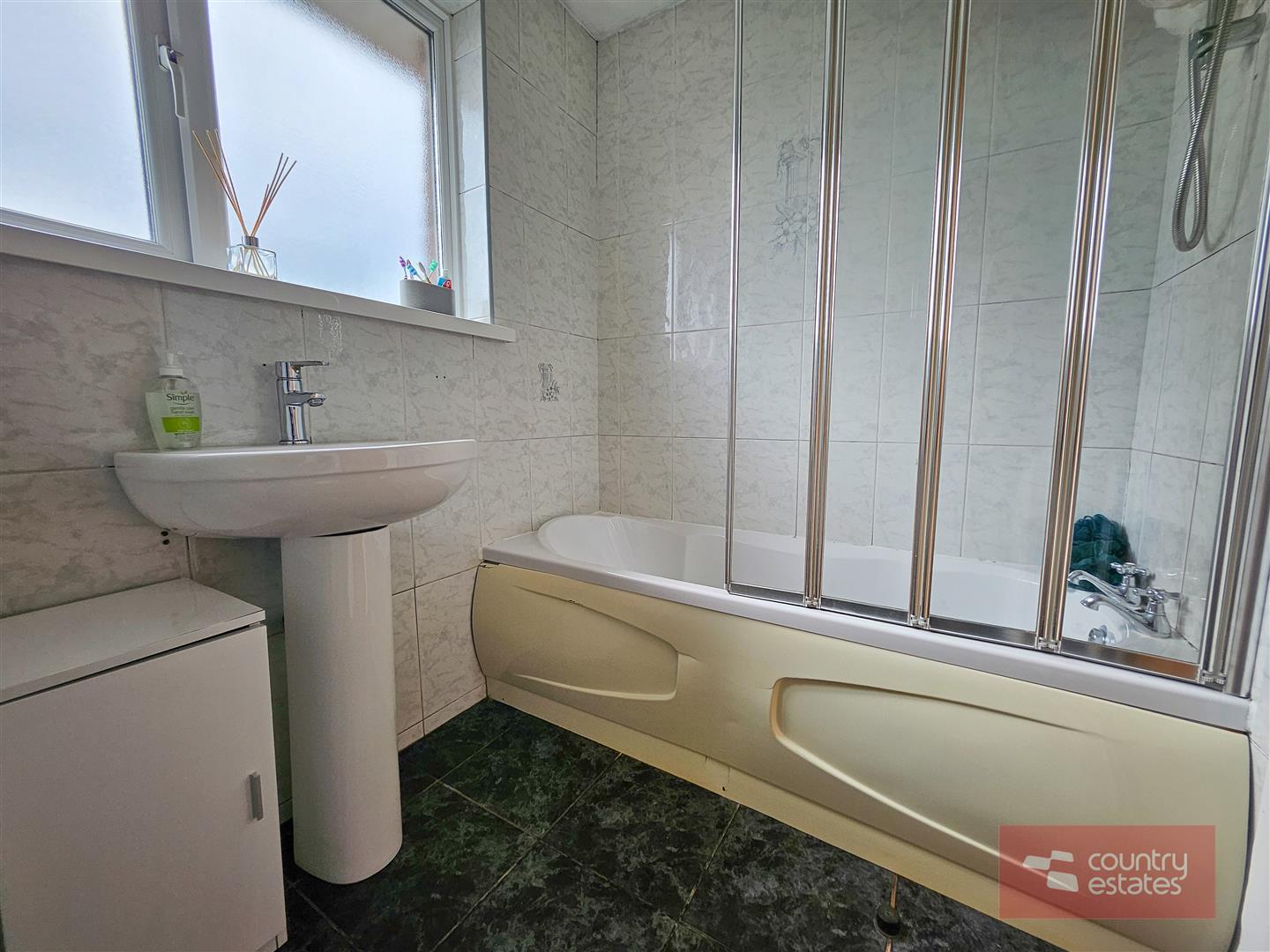 Comprising panel bath with glazed shower screen and electric shower unit, pedestal wash hand basin with monobloc tap and button flush WC. Tiled walls and tiled floor.