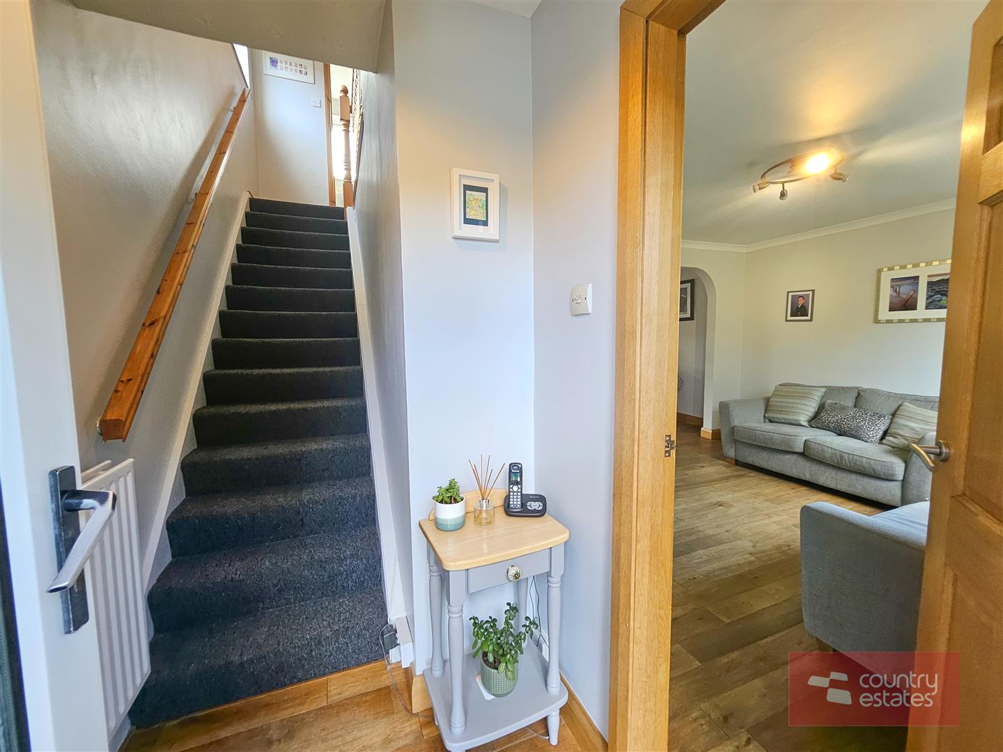 PVC double glazed front door with matching side screens into entrance hall with hard wood effect laminate flooring extending throughout.