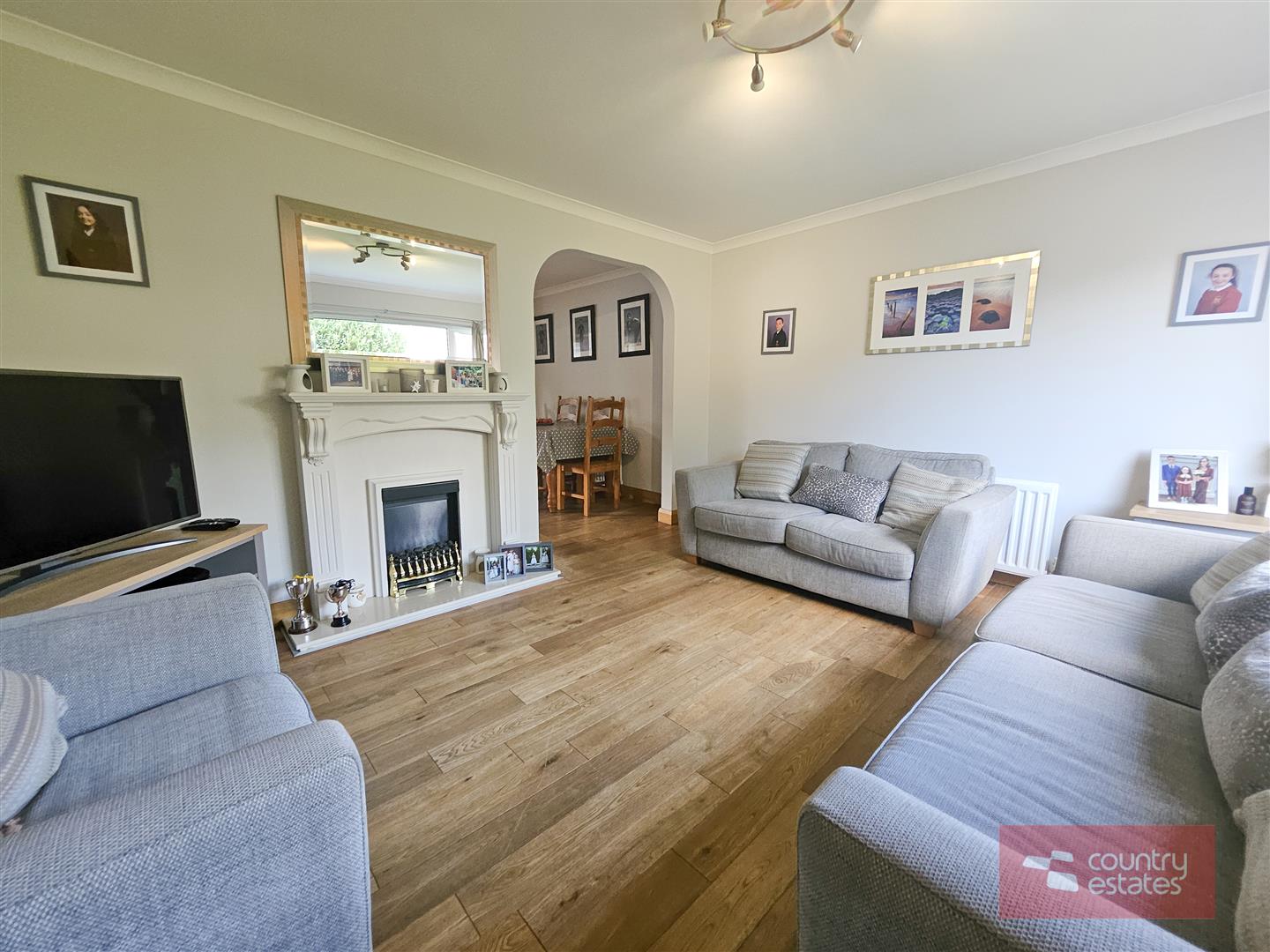 Neat well maintained garden to front, laid in lawn. Private driveway to side, accessed via twin gate, leading to detached garage.