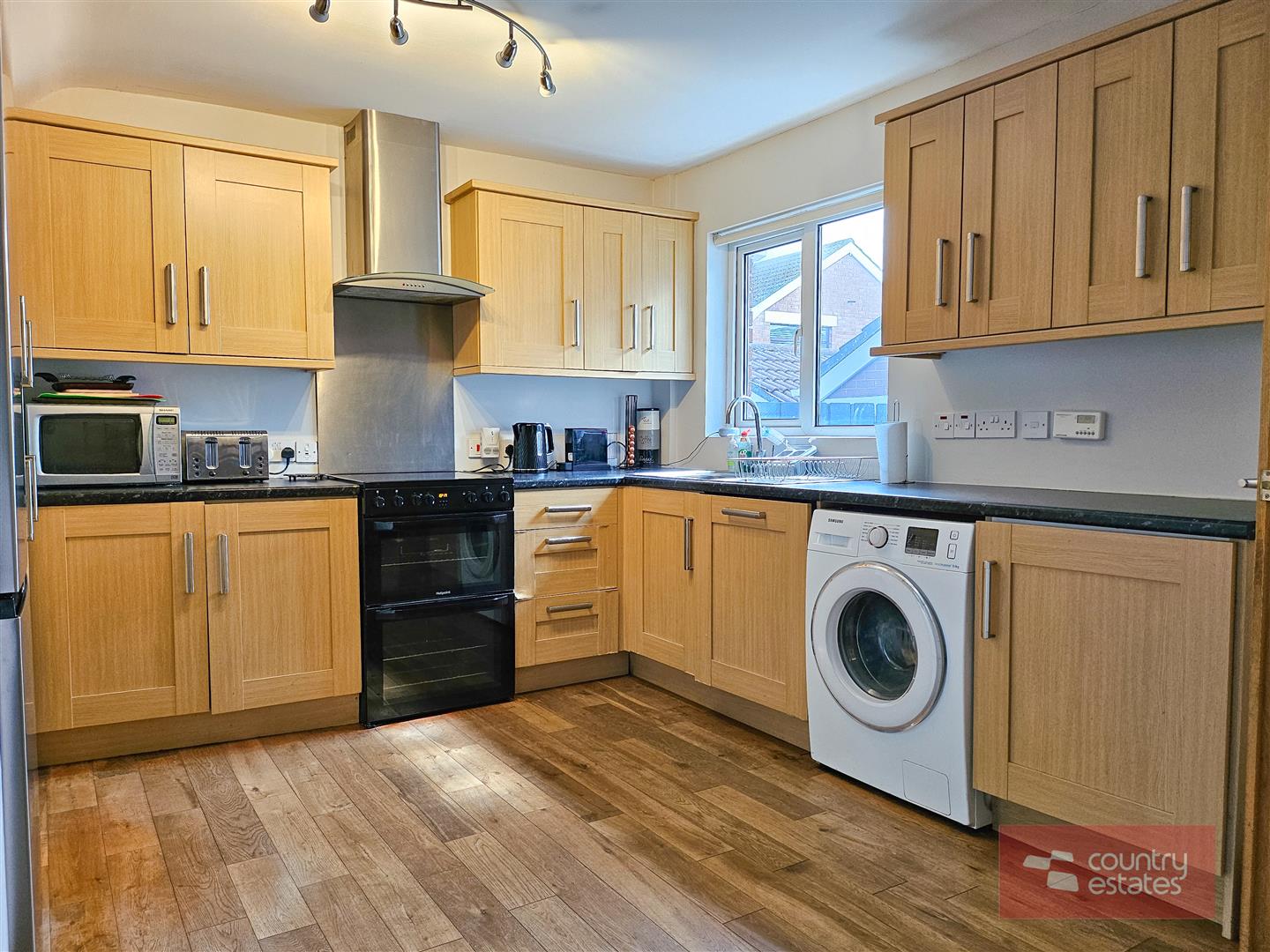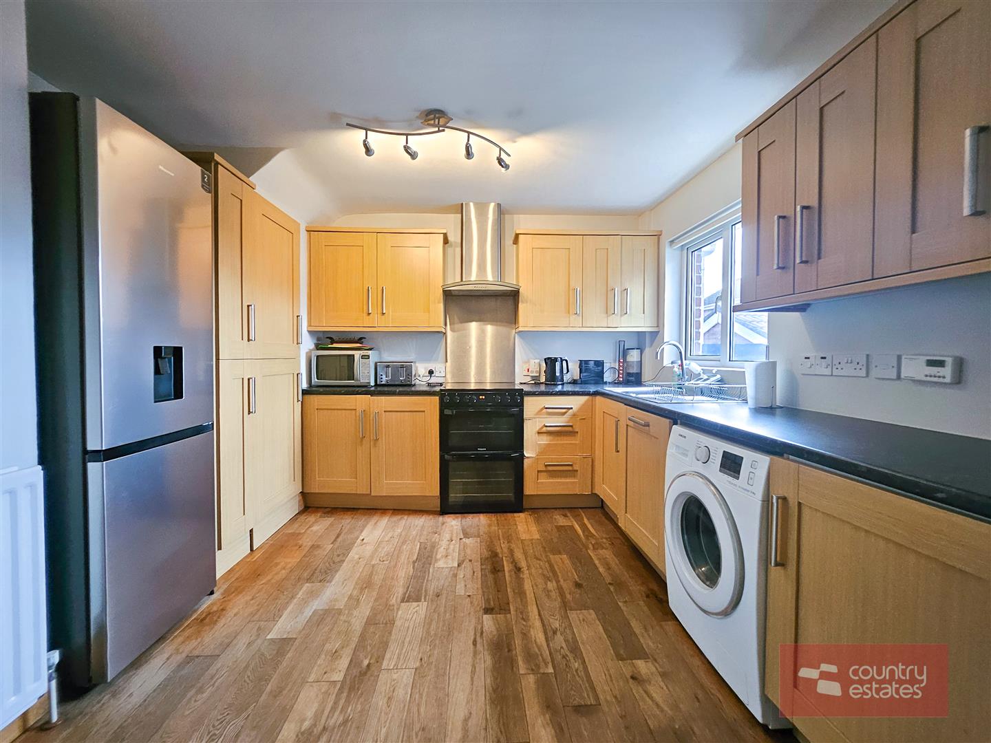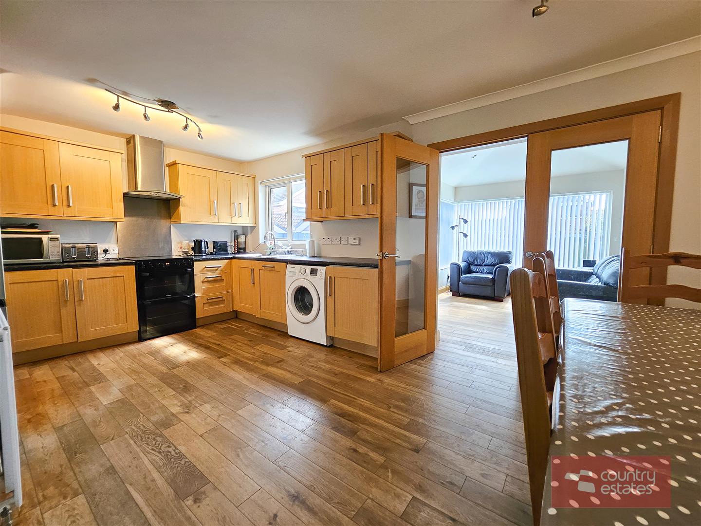 Equipped with a comprehensive range of high and low level shaker style fitted units and contrasting work surfaces. One and a half bowl single drainer stainless steel sink unit with swan neck mixer tap. Space for free standing cooker. Over head extractor fan housed in stainless steel chimney with glass hood. Integrated dish washer. Plumbed for washing machine. Space for free standing fridge freezer. French doors into: