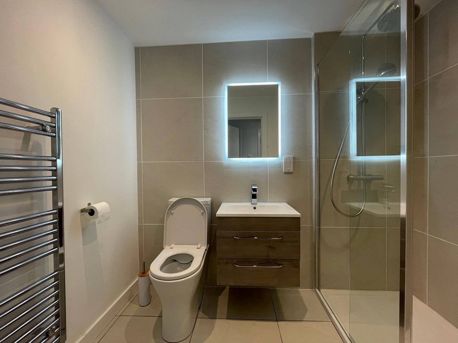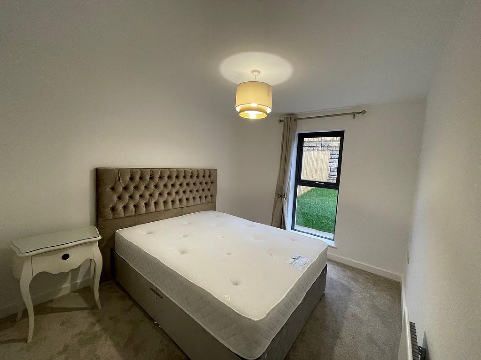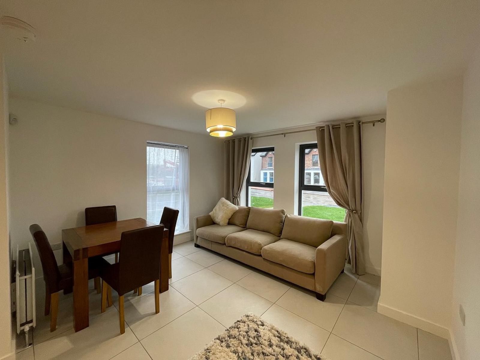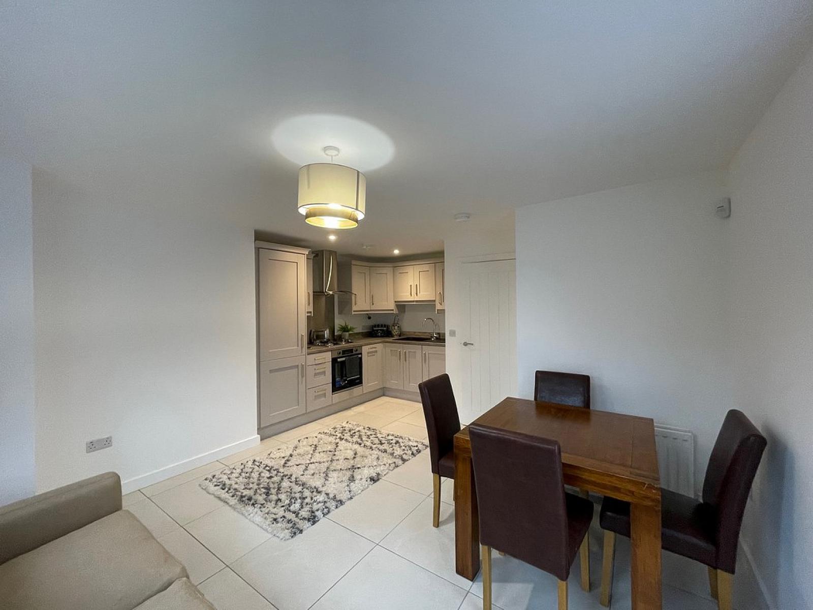 Inside, the property features a welcoming entrance hall with luxury tiled flooring, leading to a bright and spacious open-plan kitchen, living, and dining area. The apartment also boasts a stylish shower room with a modern vanity unit and WC, along with two generously sized double bedrooms finished with high-quality carpet for added comfort.