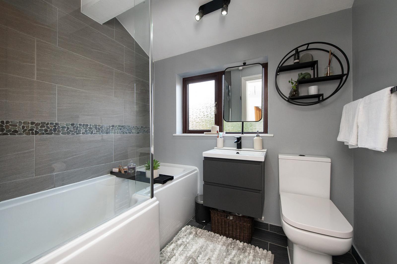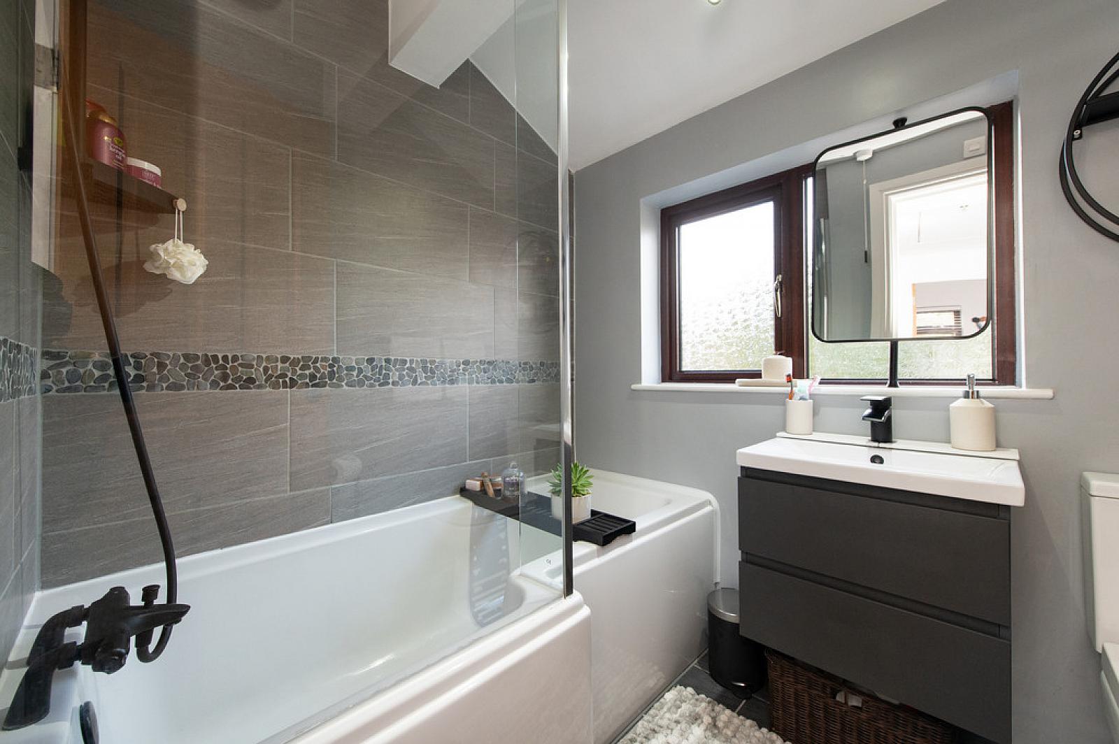 BATHROOM Panelled bath with modern shower attachment. Shower screen. Wall hung vanity unit. Low flush WC. Extractor fan. Tiling. Tiled floor.
