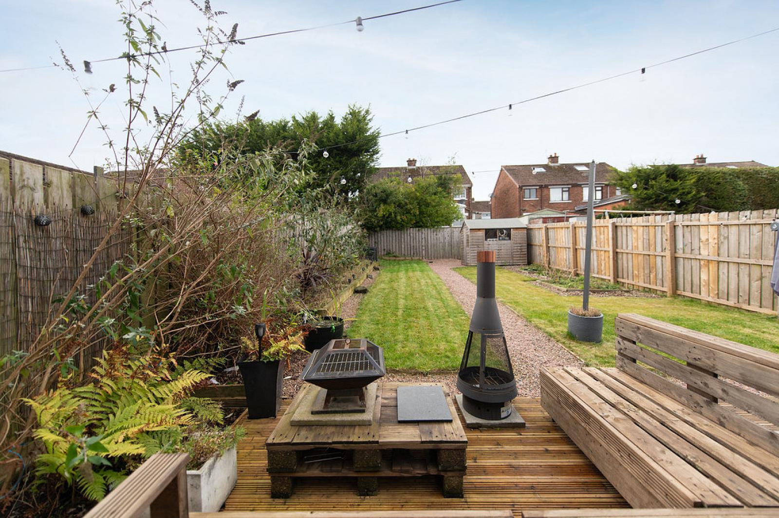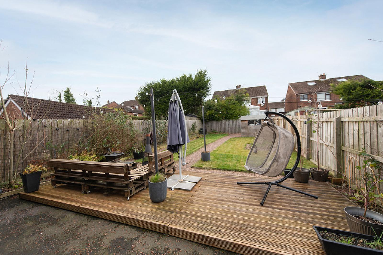 Rear garden with extensive decking, Fuel store, outside light and tap.