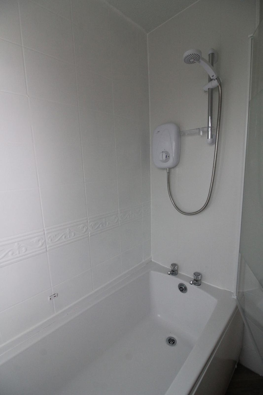 Modern white bathroom suite with electric shower