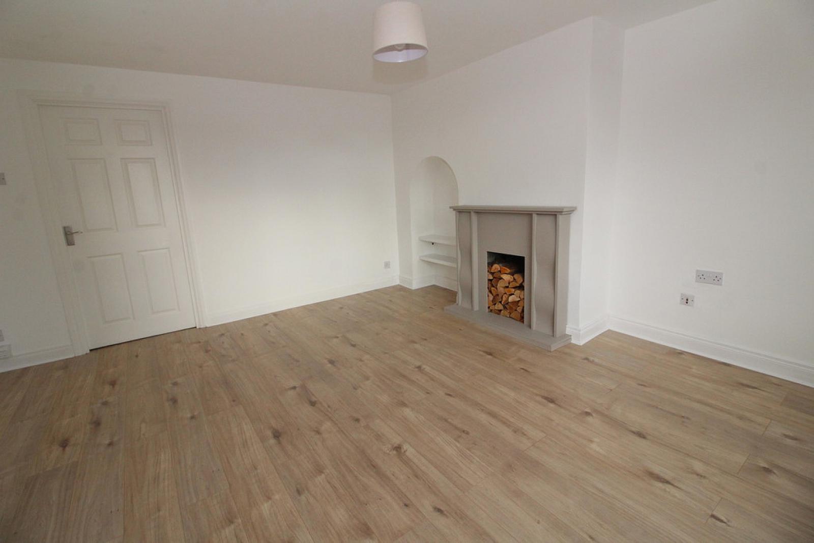 Spacious lounge with laminate wood flooring and feature fireplace