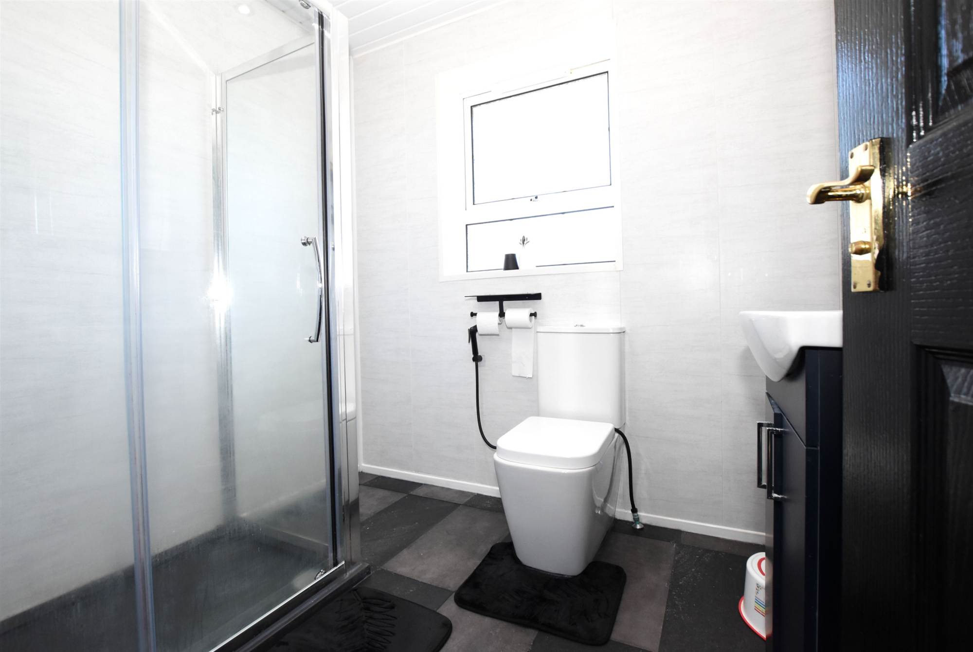 White suite comprising shower cubicle with oversized shower head, vanity unit, low flush WC, heated chrome towel rail, extractor fan, recessed spotlighting.