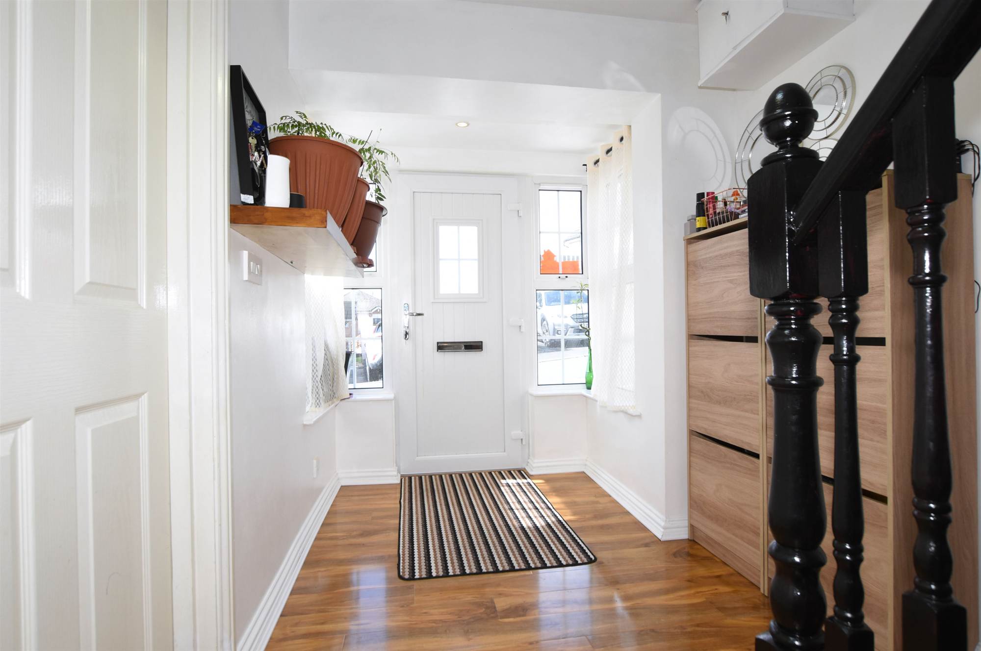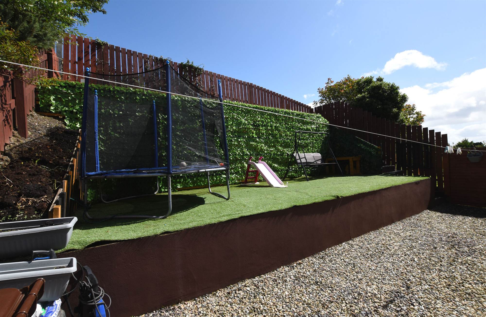 Gardens to front and rear in artificial grass, pebbled area and fencing.