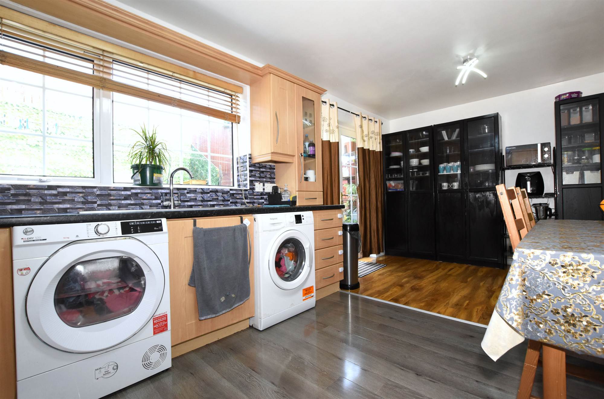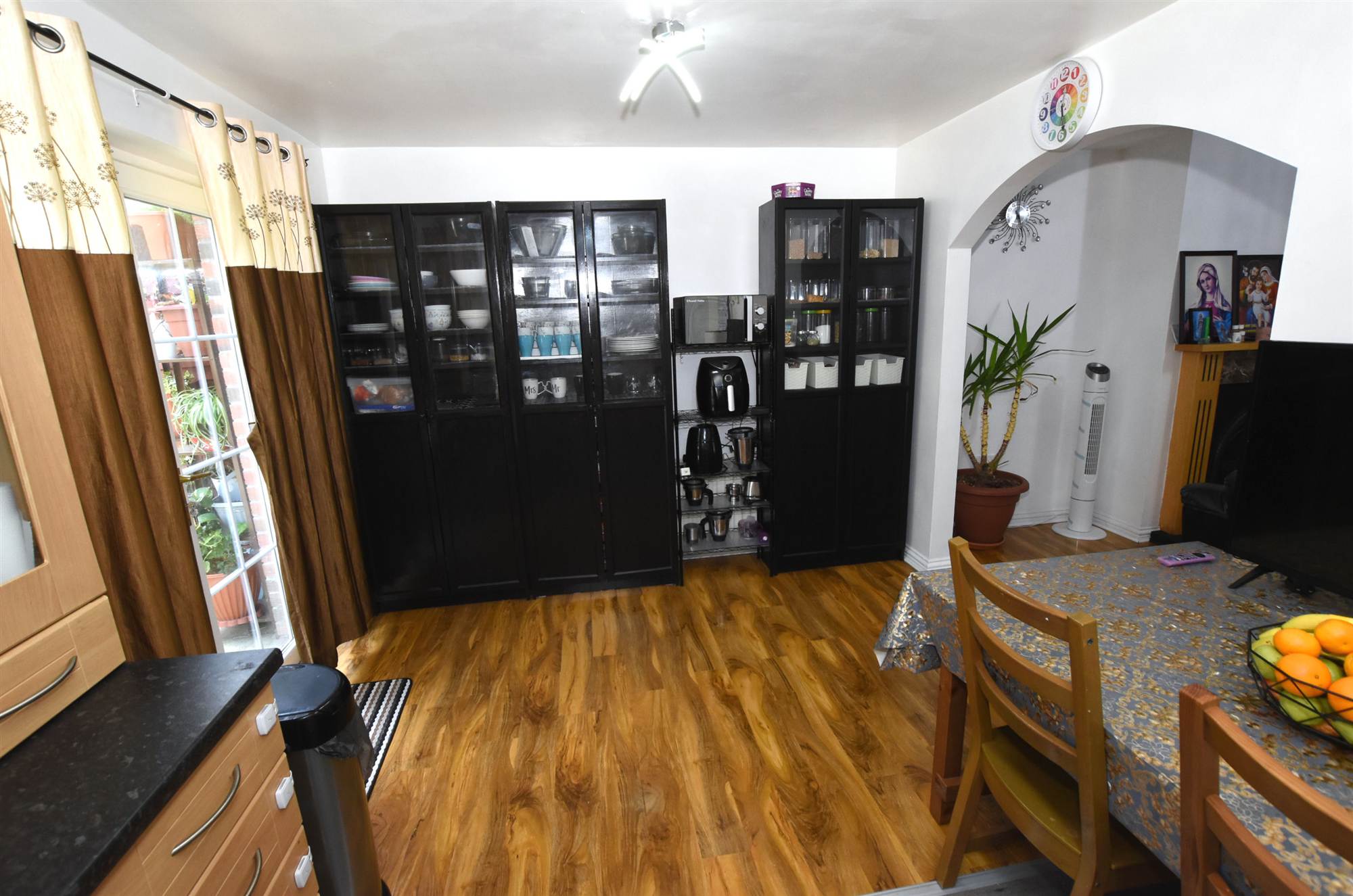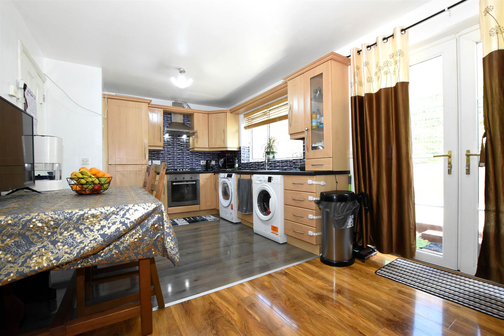 1/12 tub single drainer stainless steel sink unit, mixer taps, range of high and low level units, formica round edged work surfaces, built in oven, four ring hob unit, extractor hood, plumbed for washing machine, integrated fridge/freezer, polished laminate floor, upvc double glazed french doors to rear.