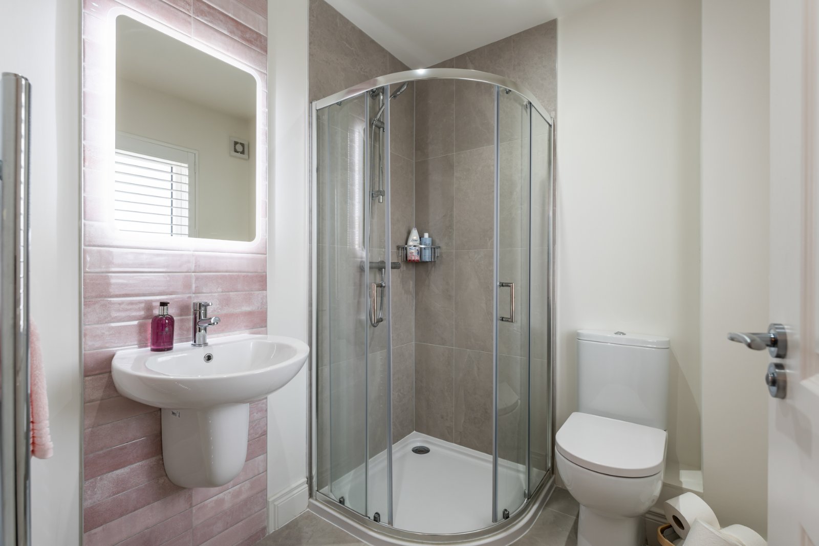 Modern white suite comprising: Separate fully tiled shower cubicle with thermostatically controlled shower, wall mounted wash hand basin with mixer taps, push button WC, feature wall tiling, ceramic tiled floor, chrome towel radiator, LED recessed spotlighting, extractor fan, wired for wall mounted mirror.
