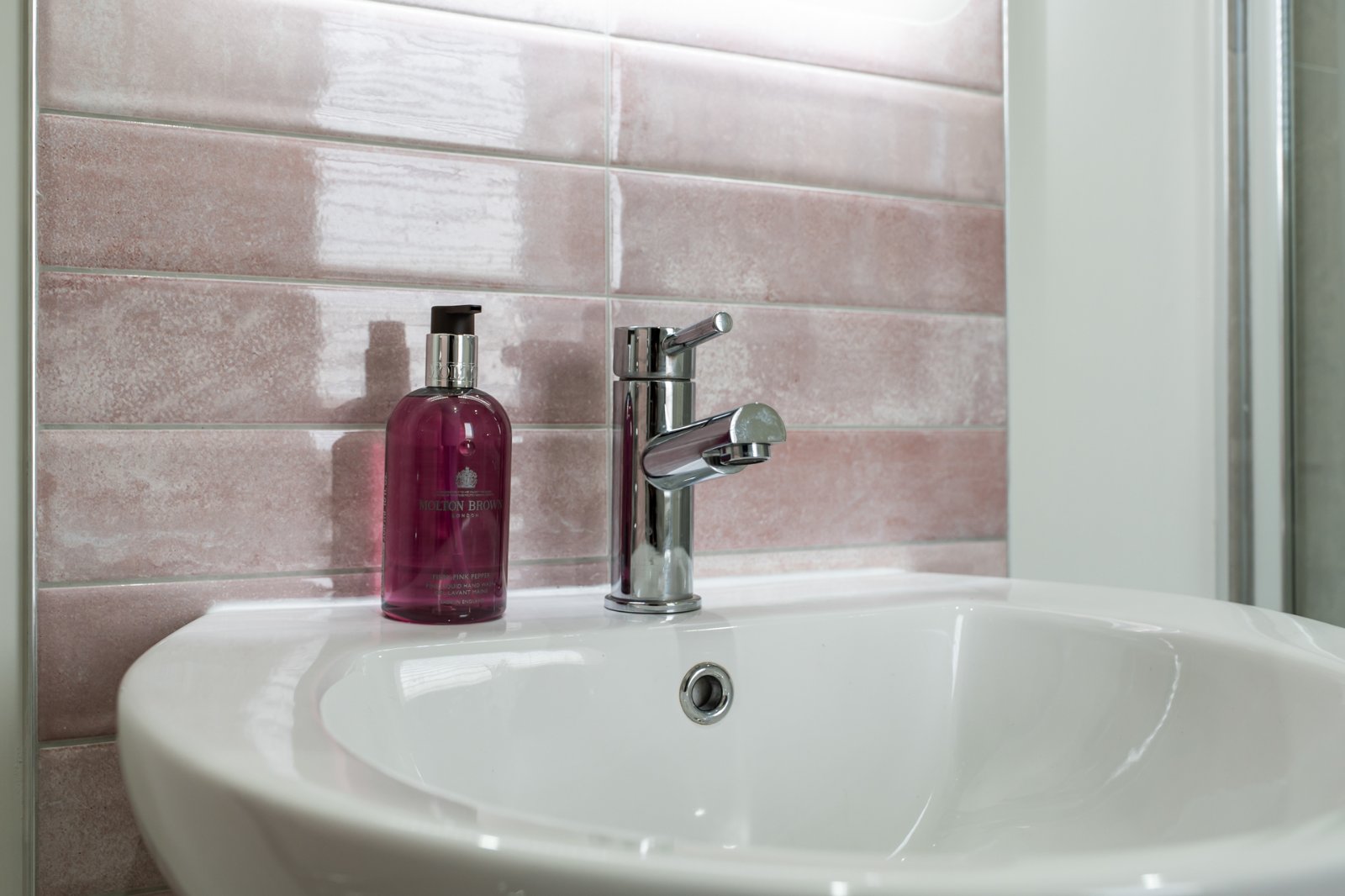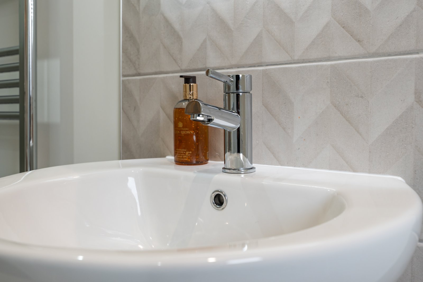Modern white suite comprising: Pedestal wash hand basin with mixer taps, push button WC, marble effect ceramic tiled floor, extractor fan.