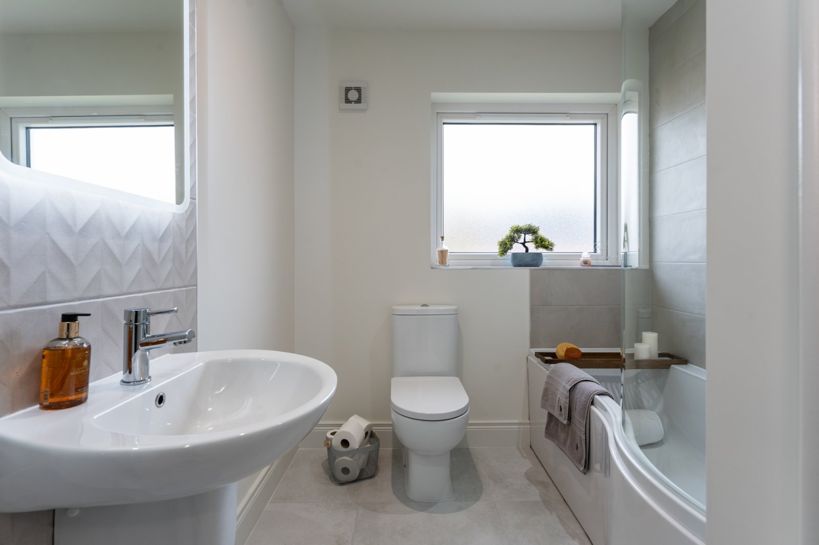 Modern white suite comprising: Panelled shower bath with mixer taps and telephone hand shower over bath, glass shower screen, wall mounted wash hand basin with mixer tap, push button WC, large chrome towel radiator, push button WC, feature wall tiling, ceramic tiled floor, LED recessed spotlighting, extractor fan, wired for wall mounted mirror.
