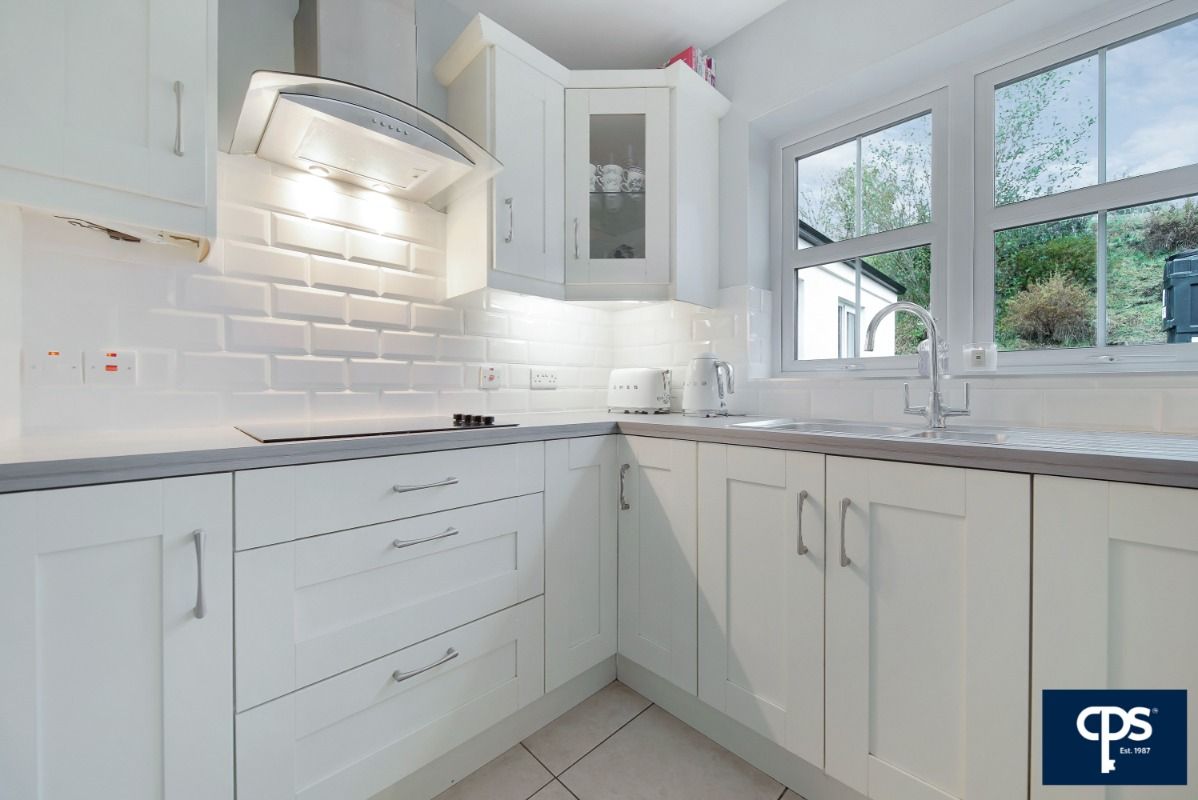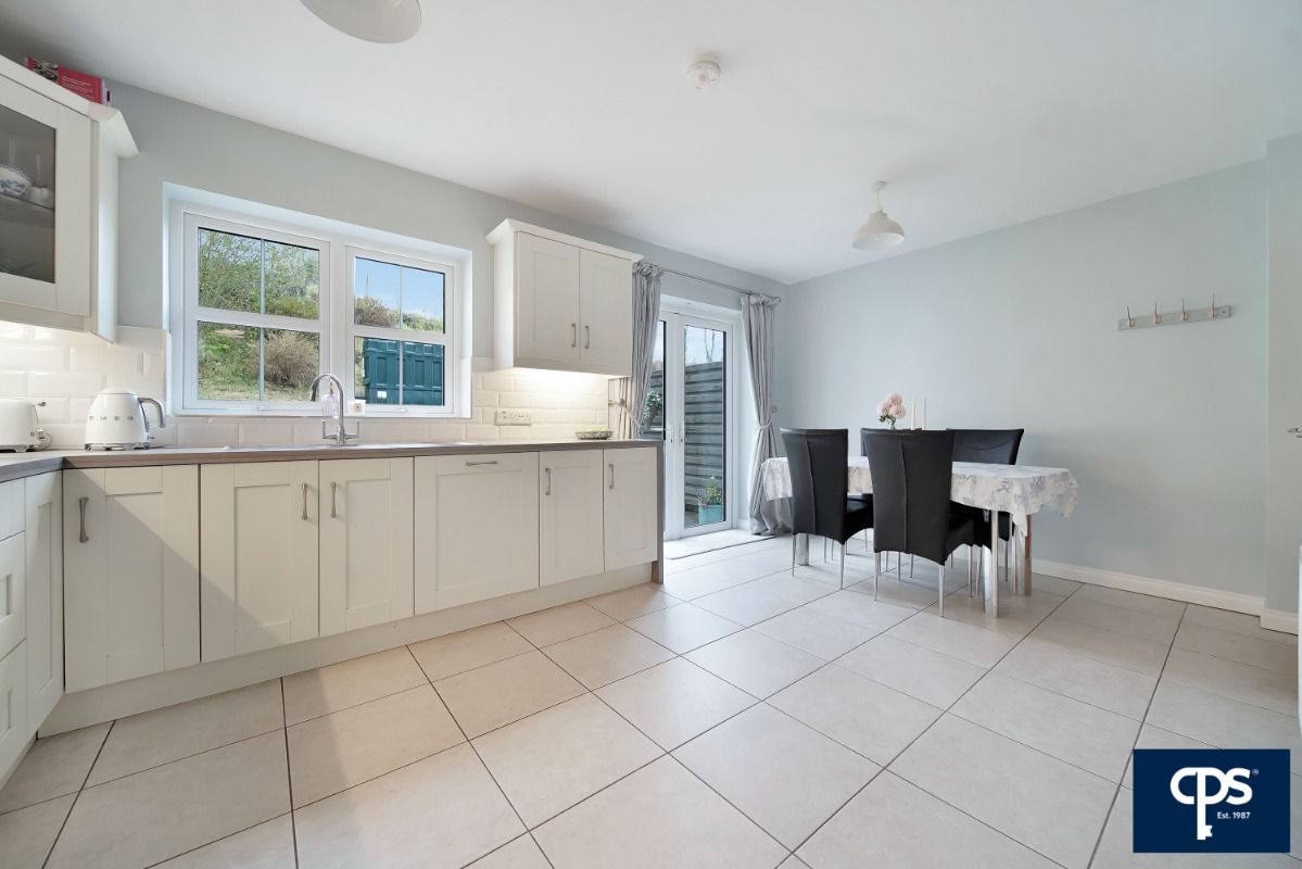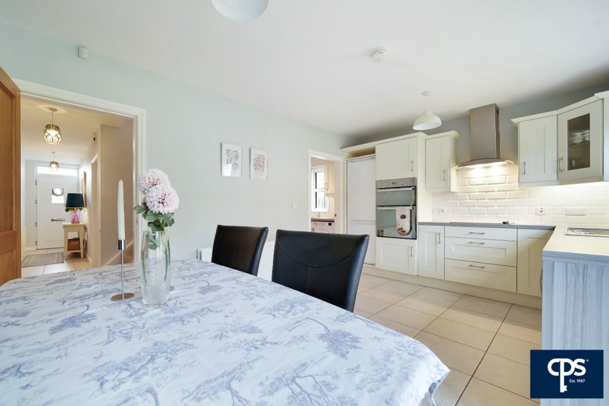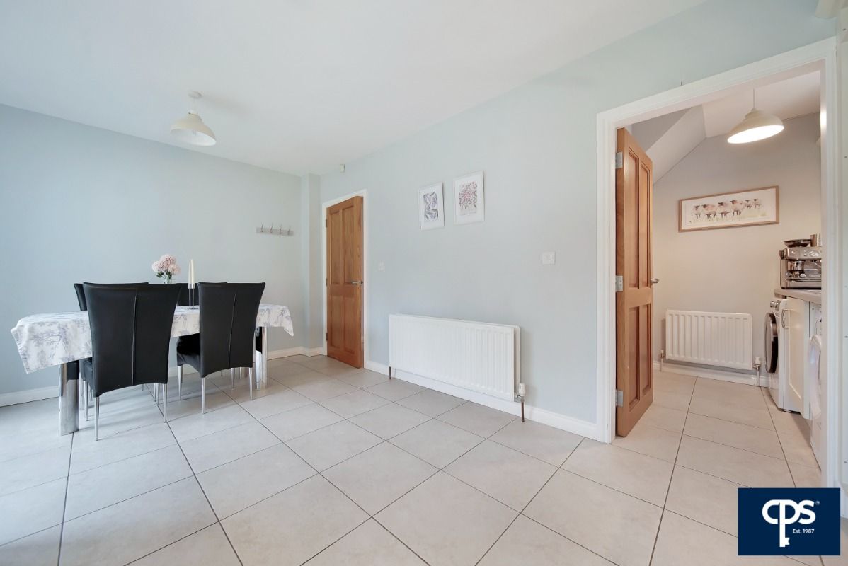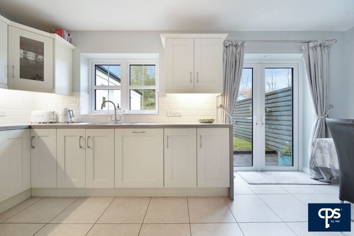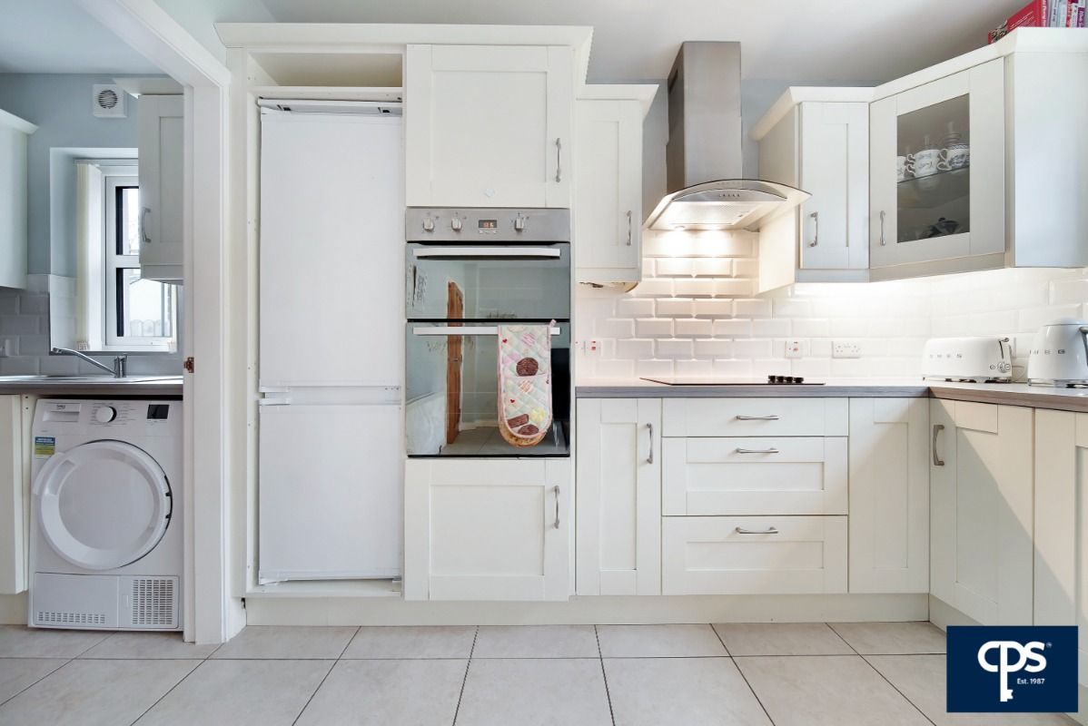 Spacious kitchen with an open-plan dining area, fitted with an excellent range of high and low level units. Includes integrated electric oven, hob, extractor fan and dishwasher. Tiled flooring with part-tiled walls. Double patio doors provide access to the enclosed rear garden.