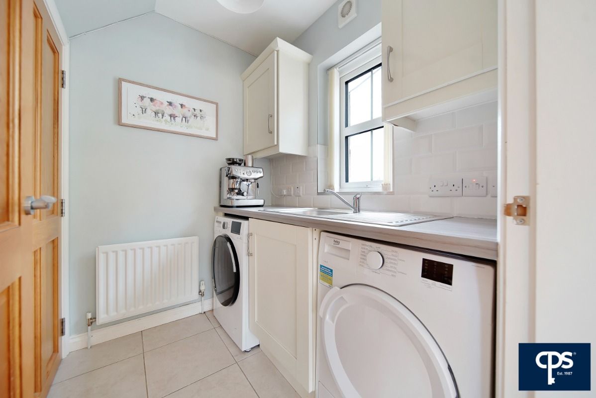 Well-equipped utility room with additional high and low level storage units. Tiled flooring with part-tiled walls.