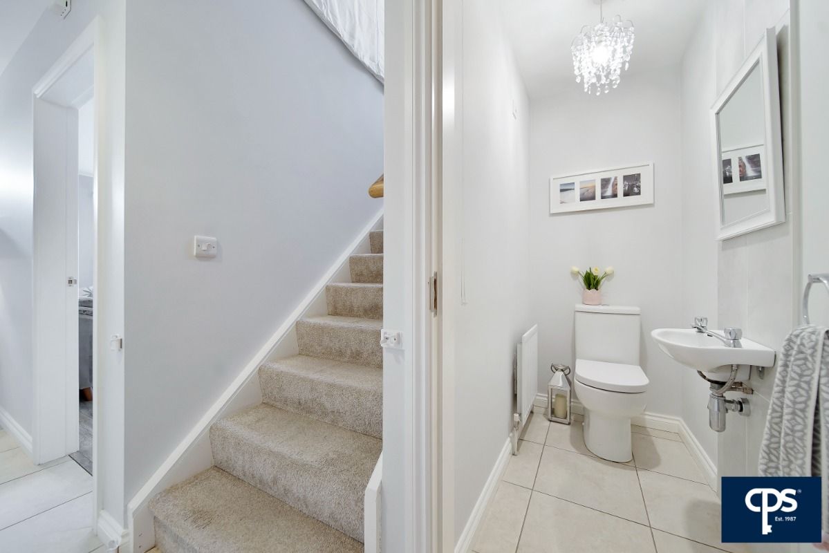 Convenient ground floor WC comprising a pedestal wash hand basin and toilet. Tiled flooring with part-tiled walls.