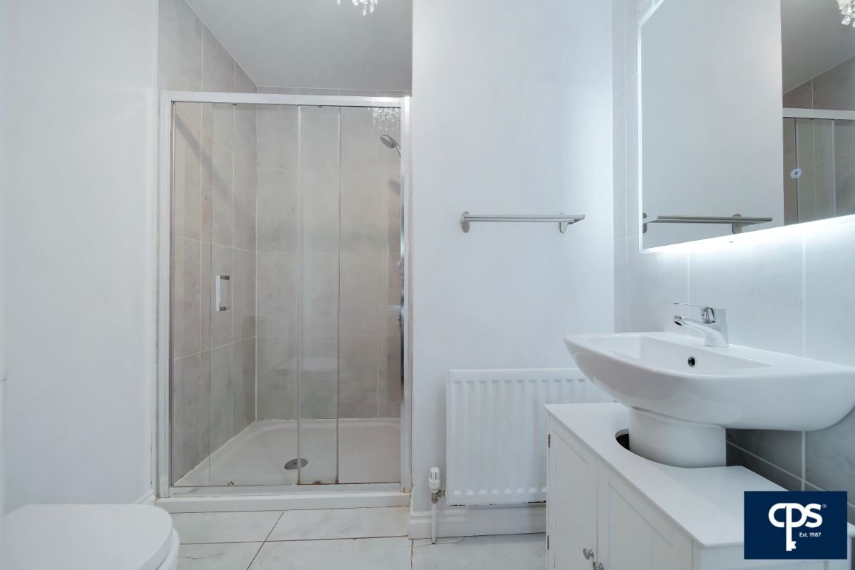 Modern en-suite shower room comprising a pedestal wash hand basin, toilet, and shower. Tiled flooring with part-tiled walls.