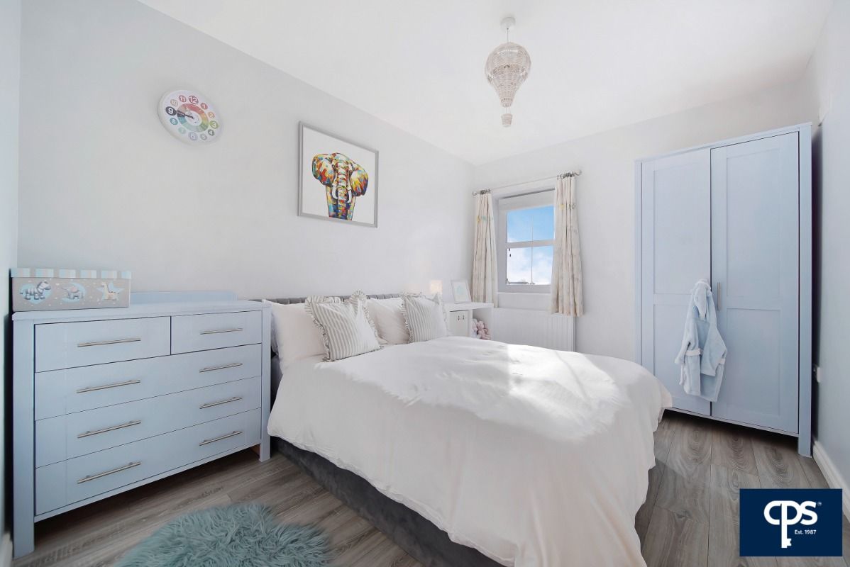 Generous reception room filled with natural light and featuring a solid fuel inset stove. Finished with laminate wooden flooring.