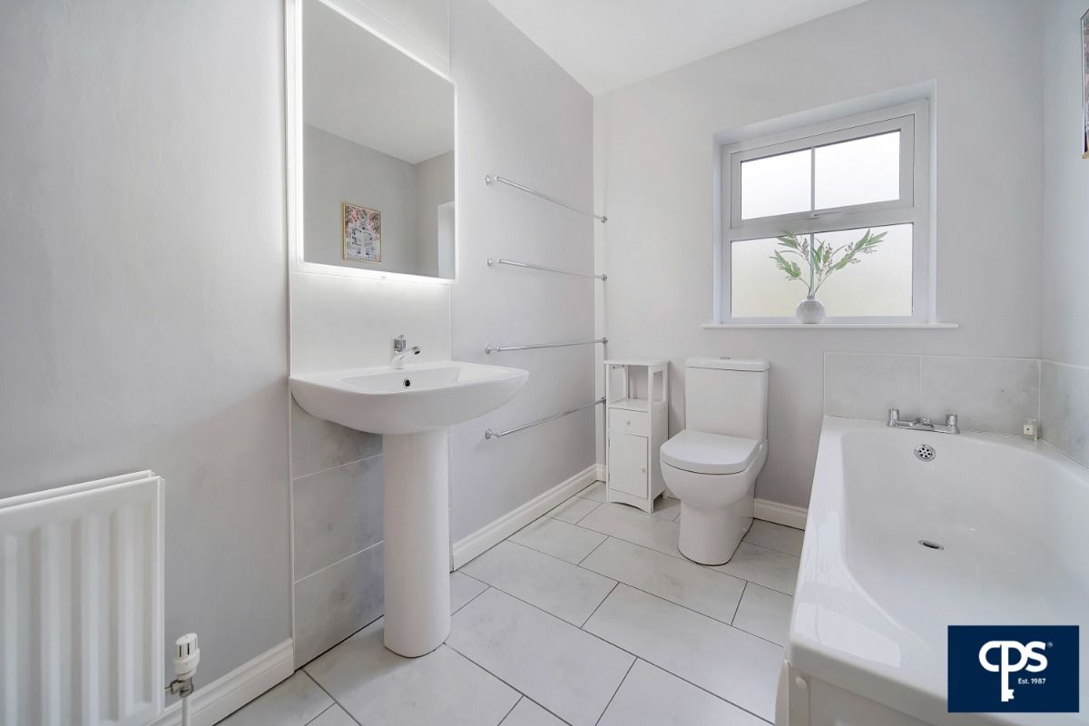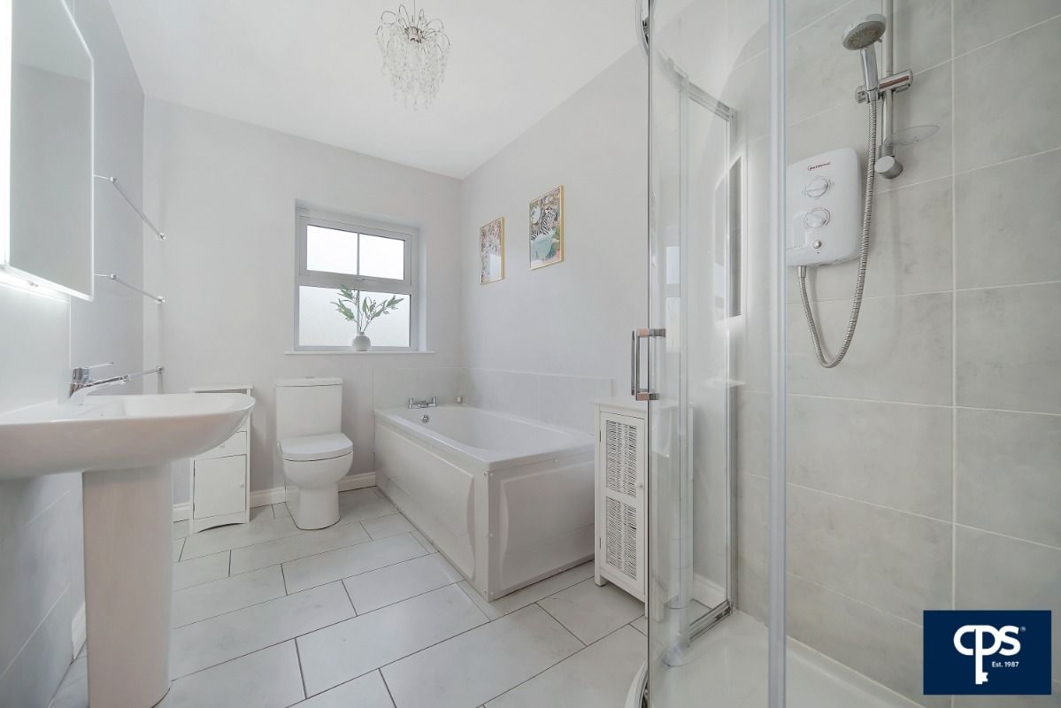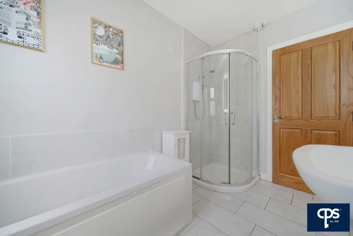 Contemporary family bathroom comprising a panelled bath, pedestal wash hand basin, toilet, and separate corner shower. Tiled flooring with part-tiled walls.