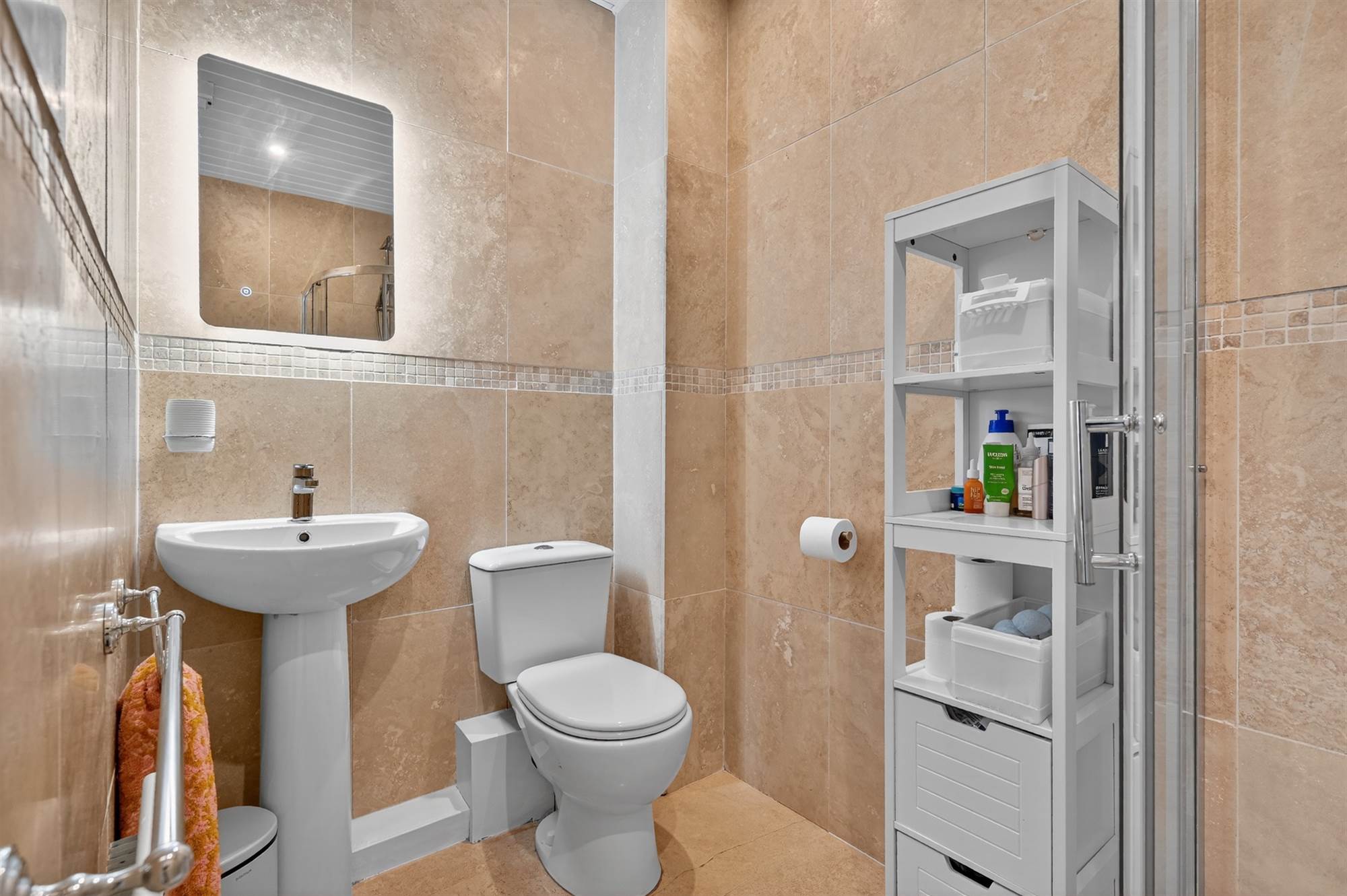 White suite comprising low flush WC, pedestal wash hand basin, shower cubicle, fully tiled walls, tiled floor, low voltage spotlights.