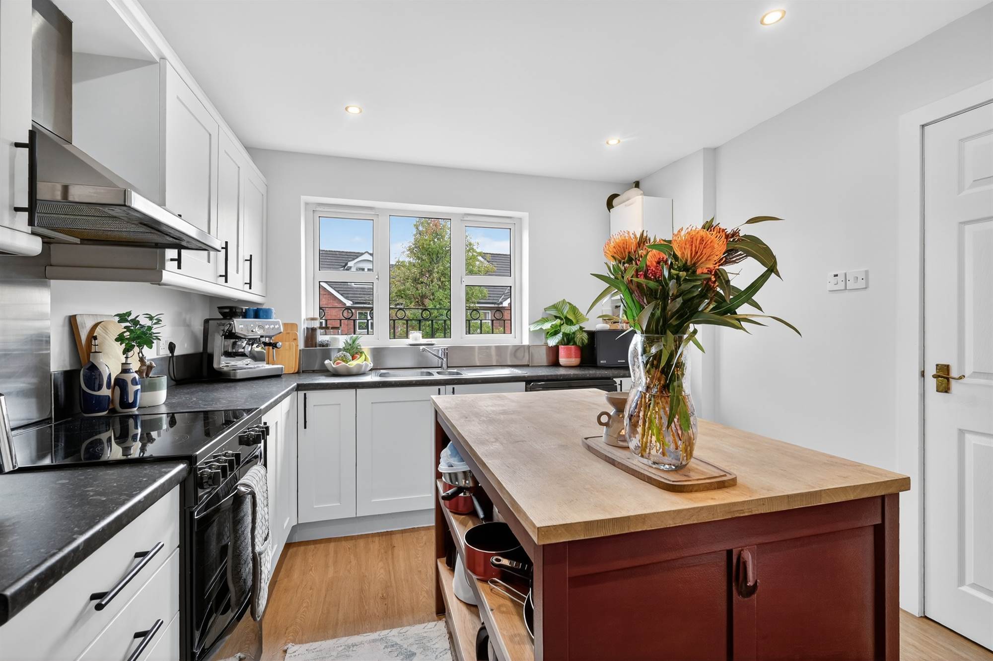 Modern fully fitted kitchen with range of high and low level units, stainless steel 1.5 basin sink unit, double oven with 4 ring electric hob, stainless steel splash back, stainless steel extractor hood, dishwasher, low voltage spotlights, gas boiler, wood effect LVT flooring, central island with breakfast bar area, free standing larder.