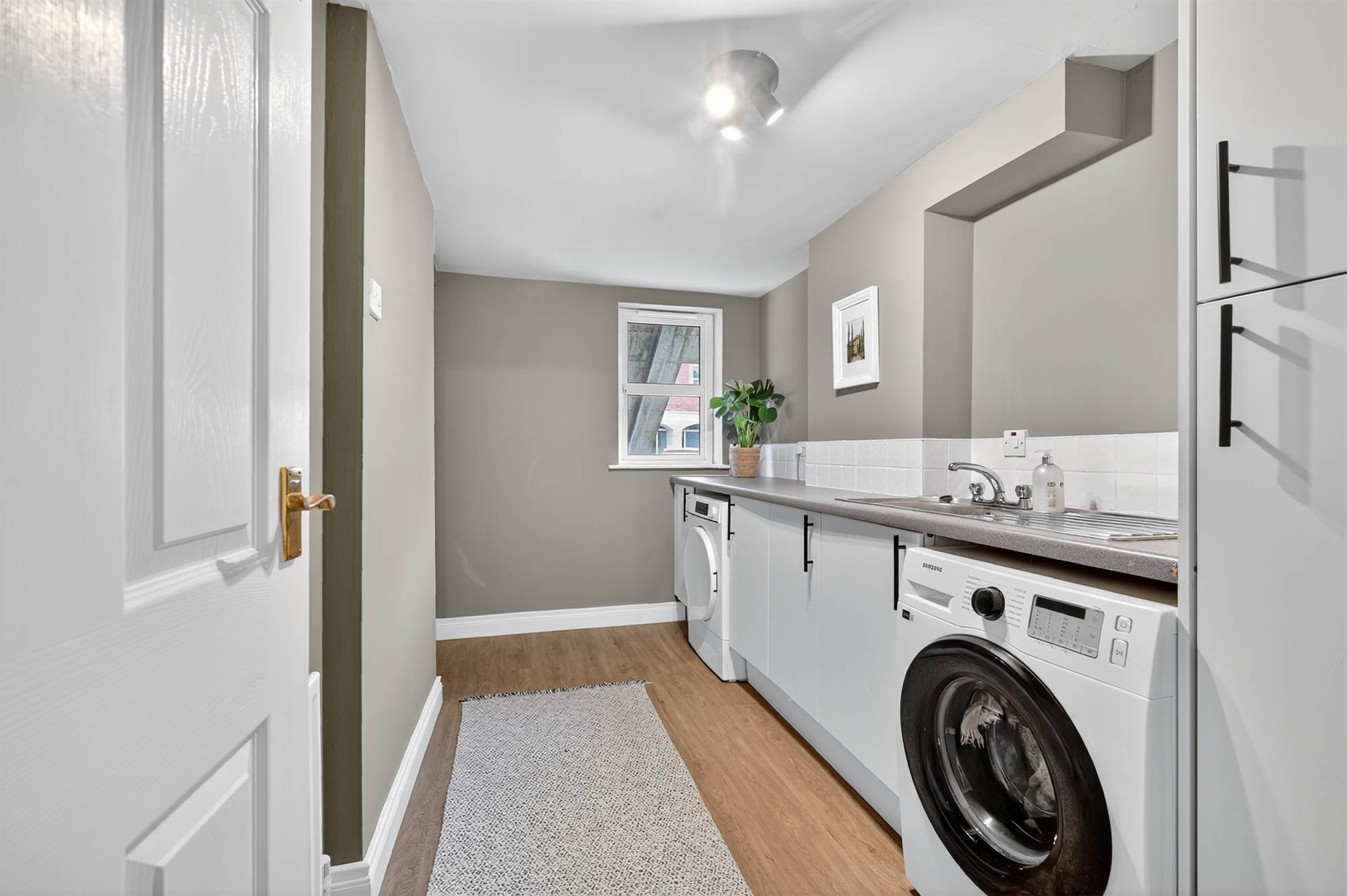 Understair storage cupboard, wood effect LVT flooring, access to garage.