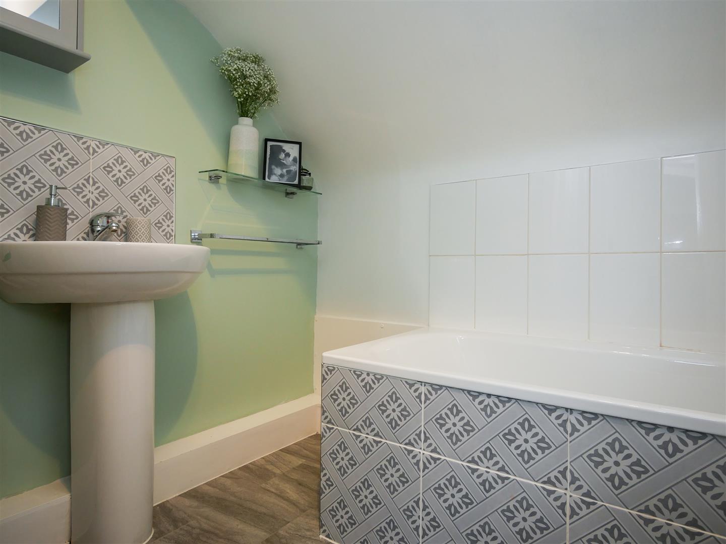 White bathroom suite comprising of panelled bath with mixer taps and hand shower, pedestal wash hand basin and low flush w.c. Part tiled walls.