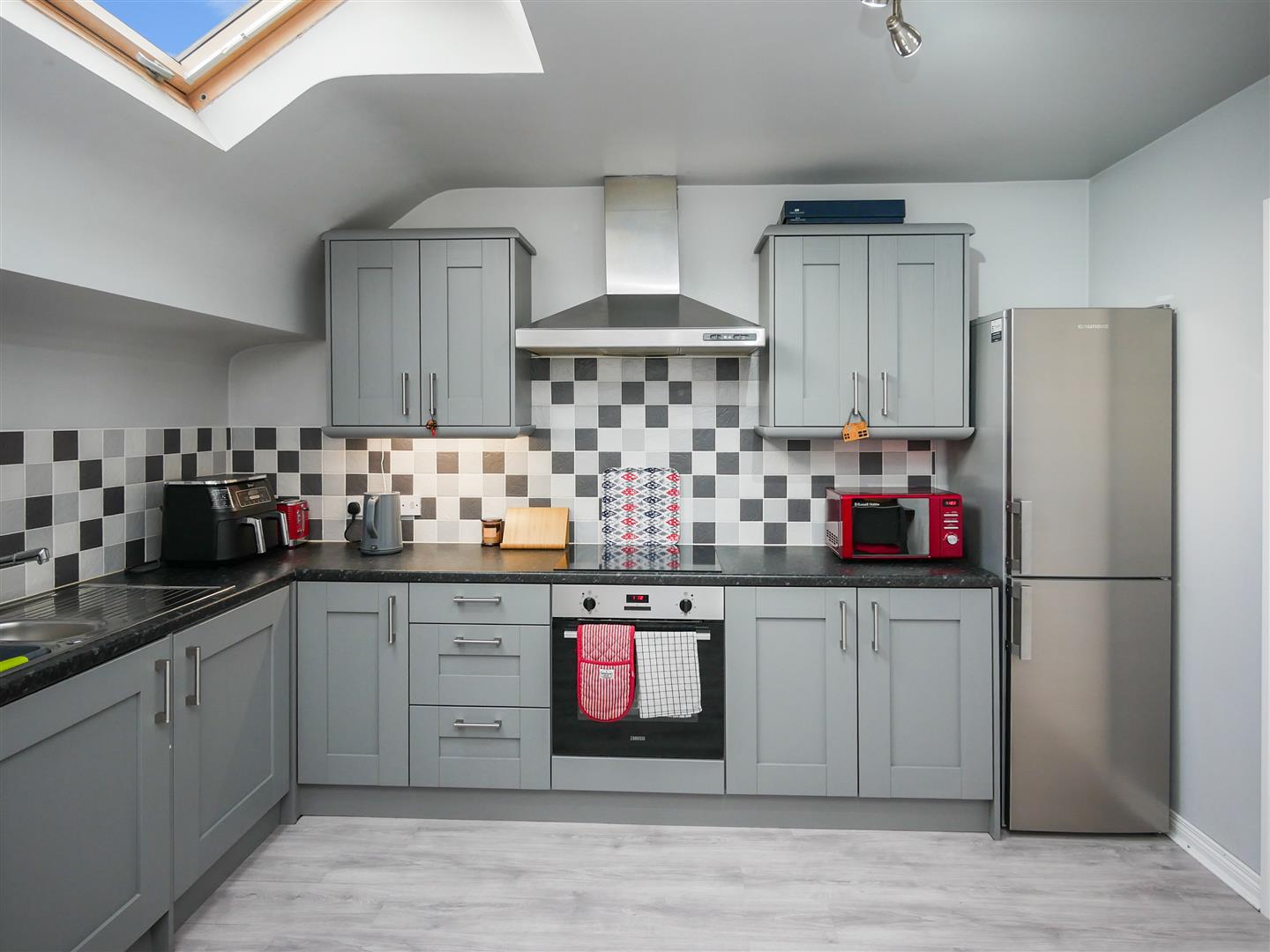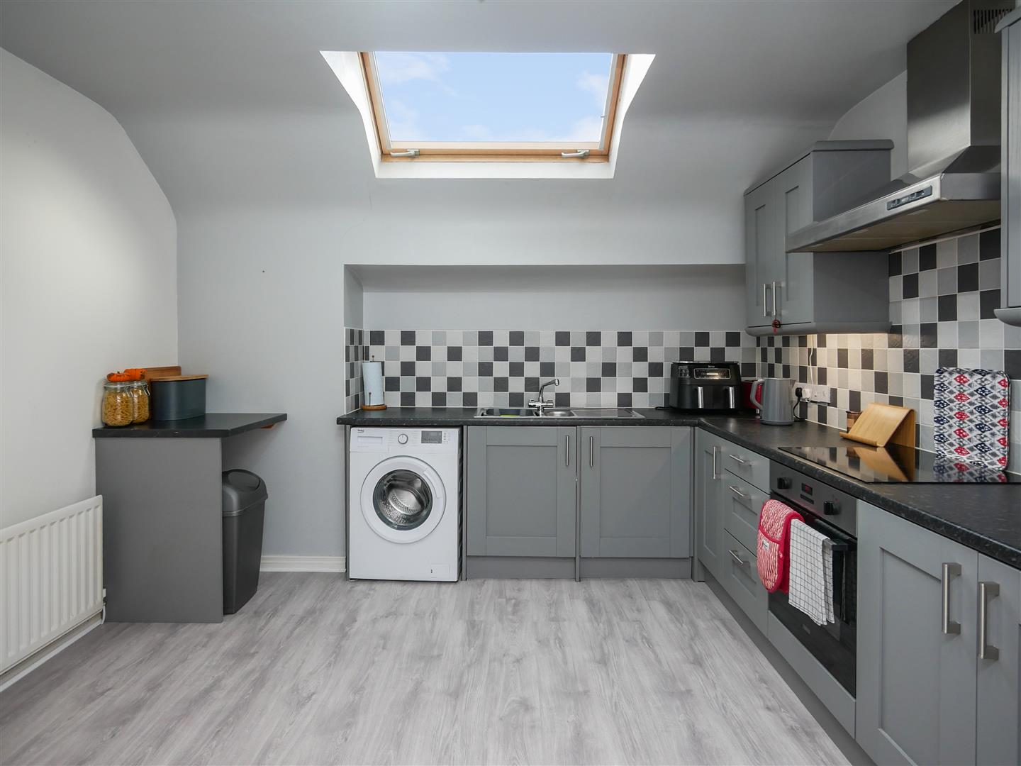 Shaker style fitted kitchen with built in hob and oven. Stainless steel overhead extractor fan. Part tiled walls. Laminate flooring.