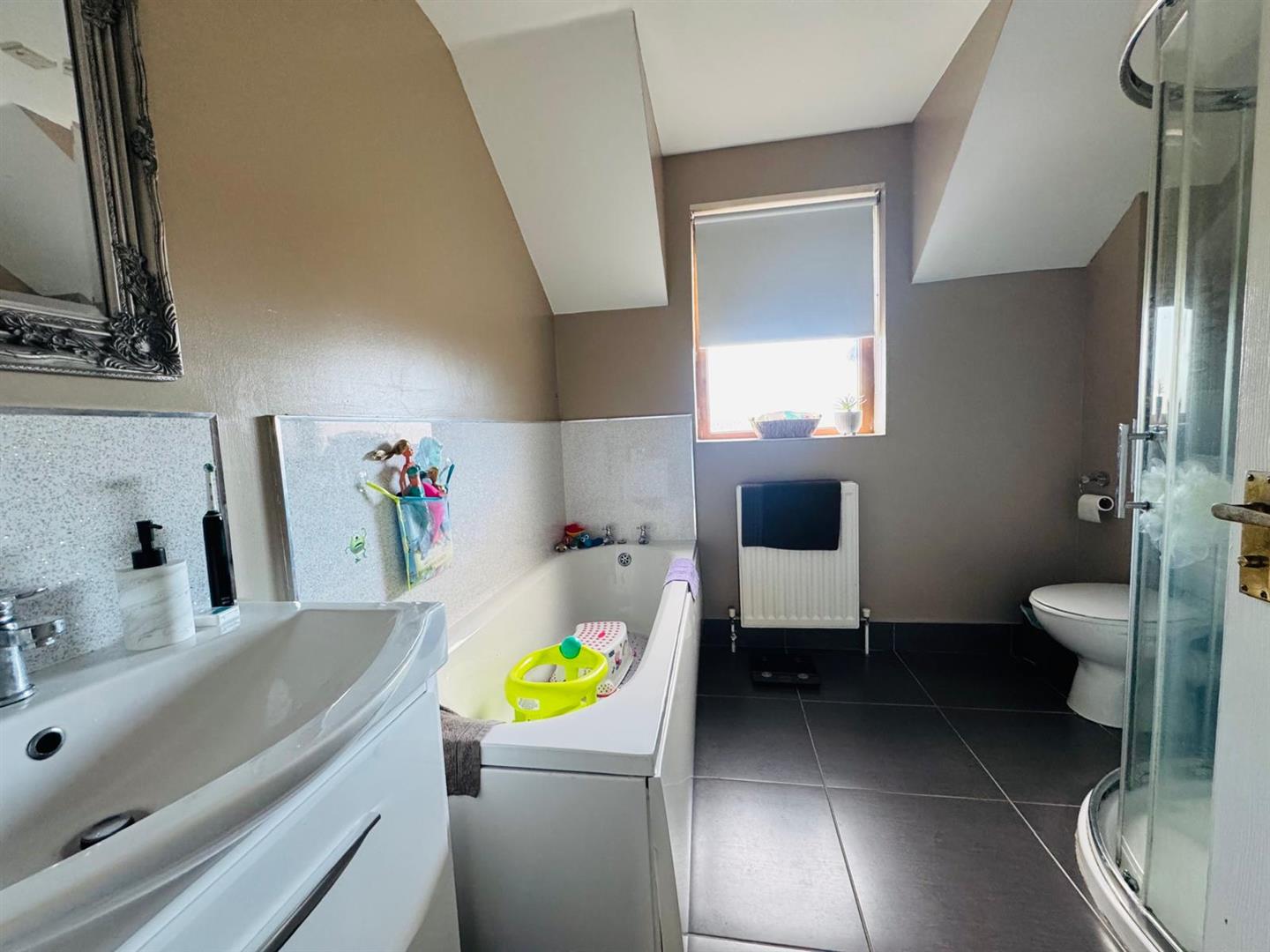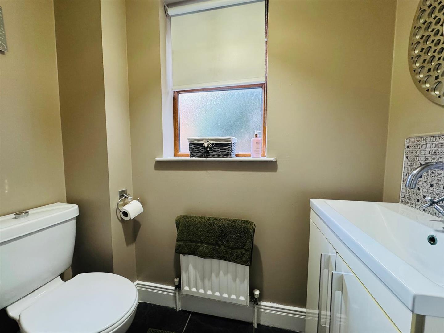 Comprising bath, whb set in vanity unit, wc, walk in electric shower with PVC cladding to walls, tiled floor.