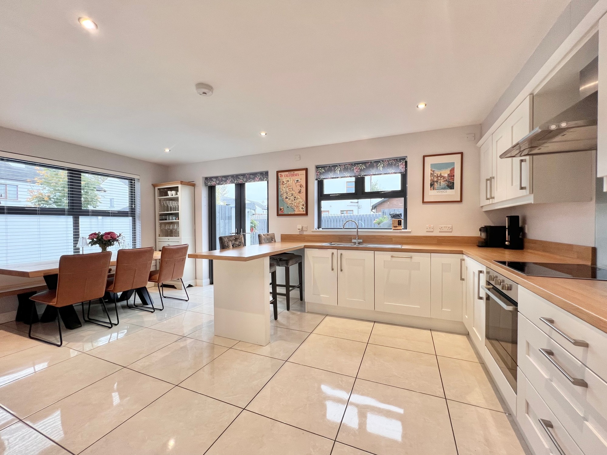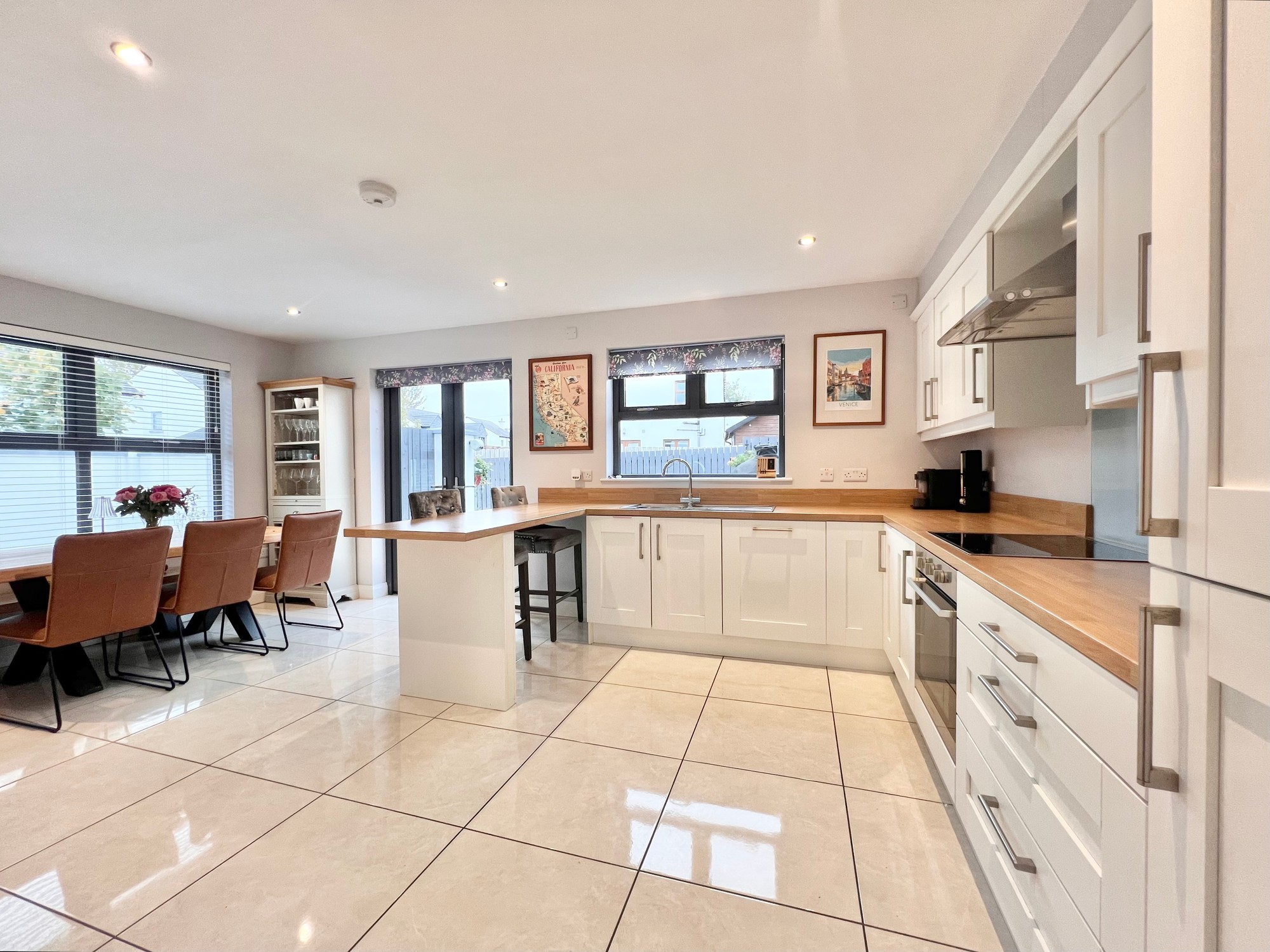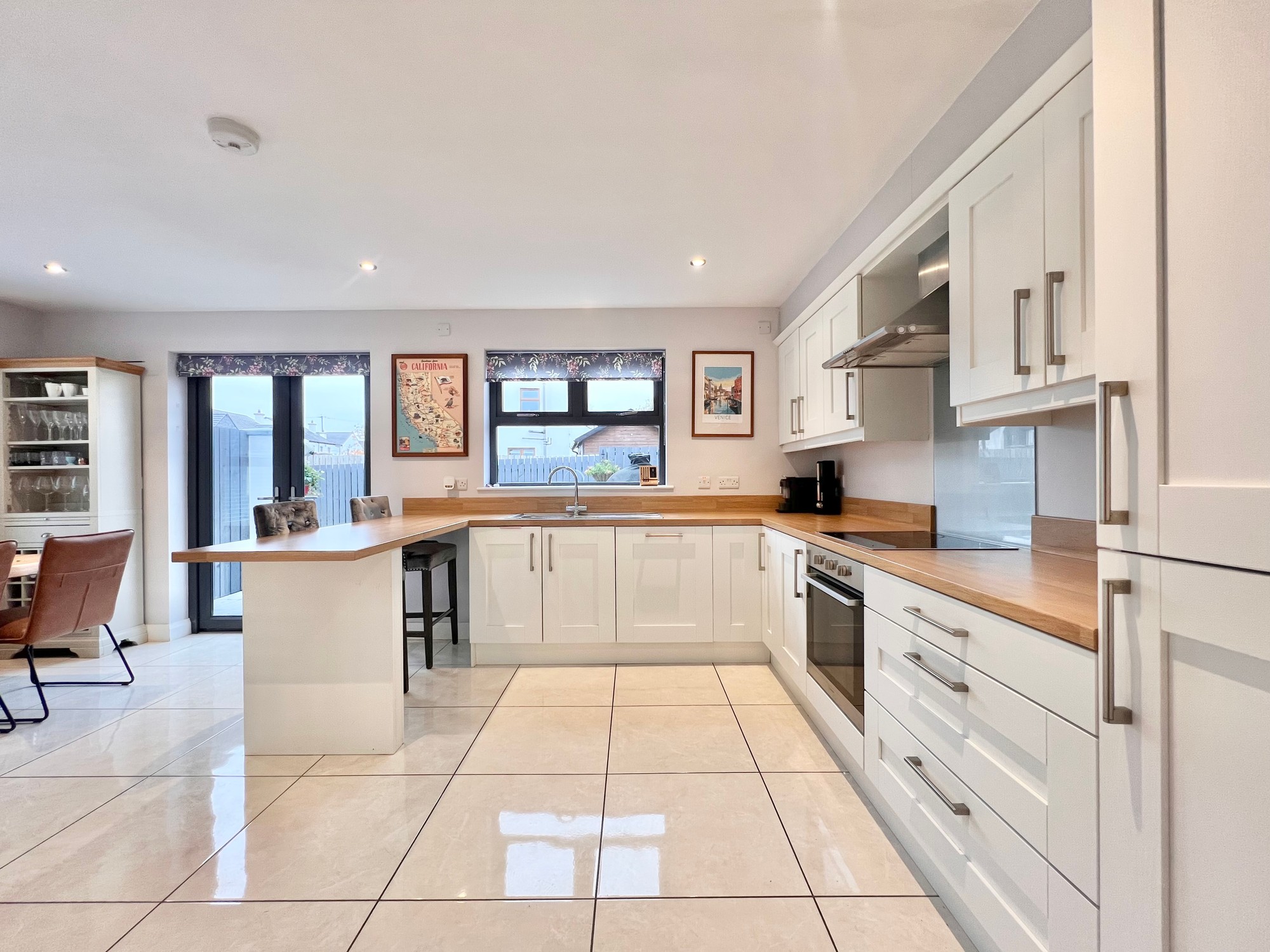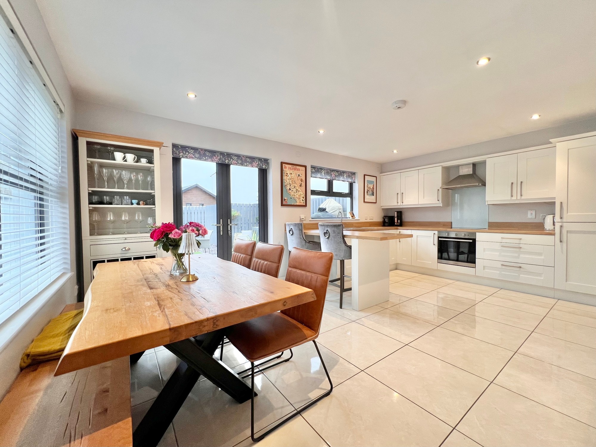 With an excellent range of eye and low level kitchen units, breakfast bar area, stainless steel sink unit, electric hob & electric oven, extractor fan, integrated fridge/freezer, integrated dishwasher, recessed lights, floor fully tiled, dining area, double doors to patio paved area.