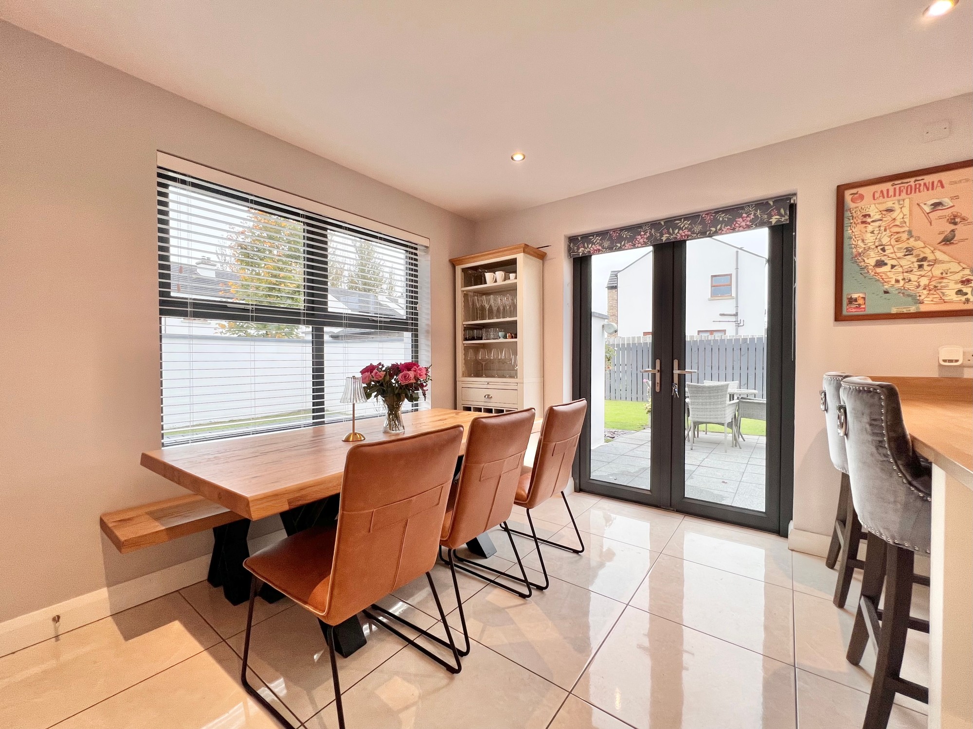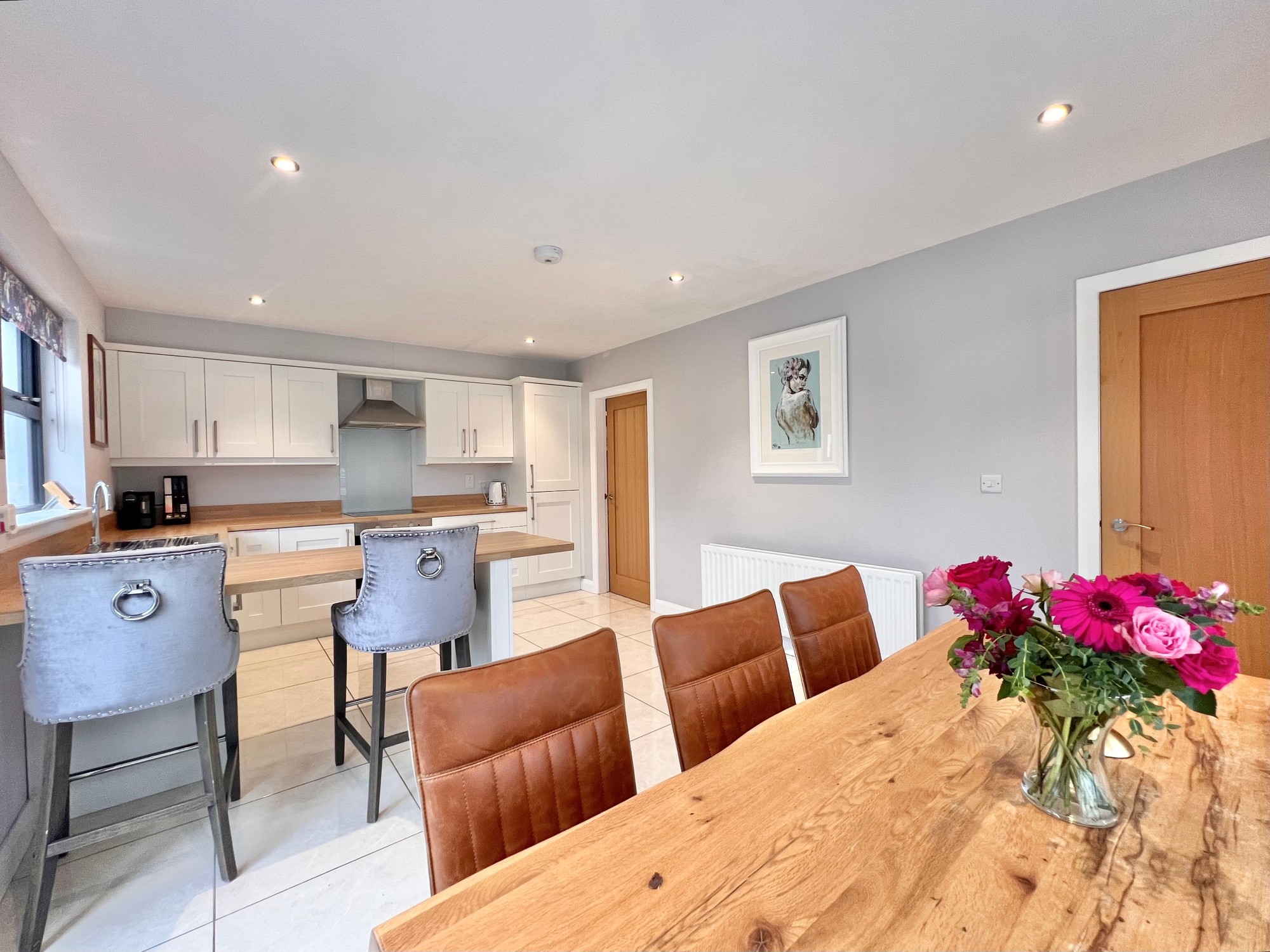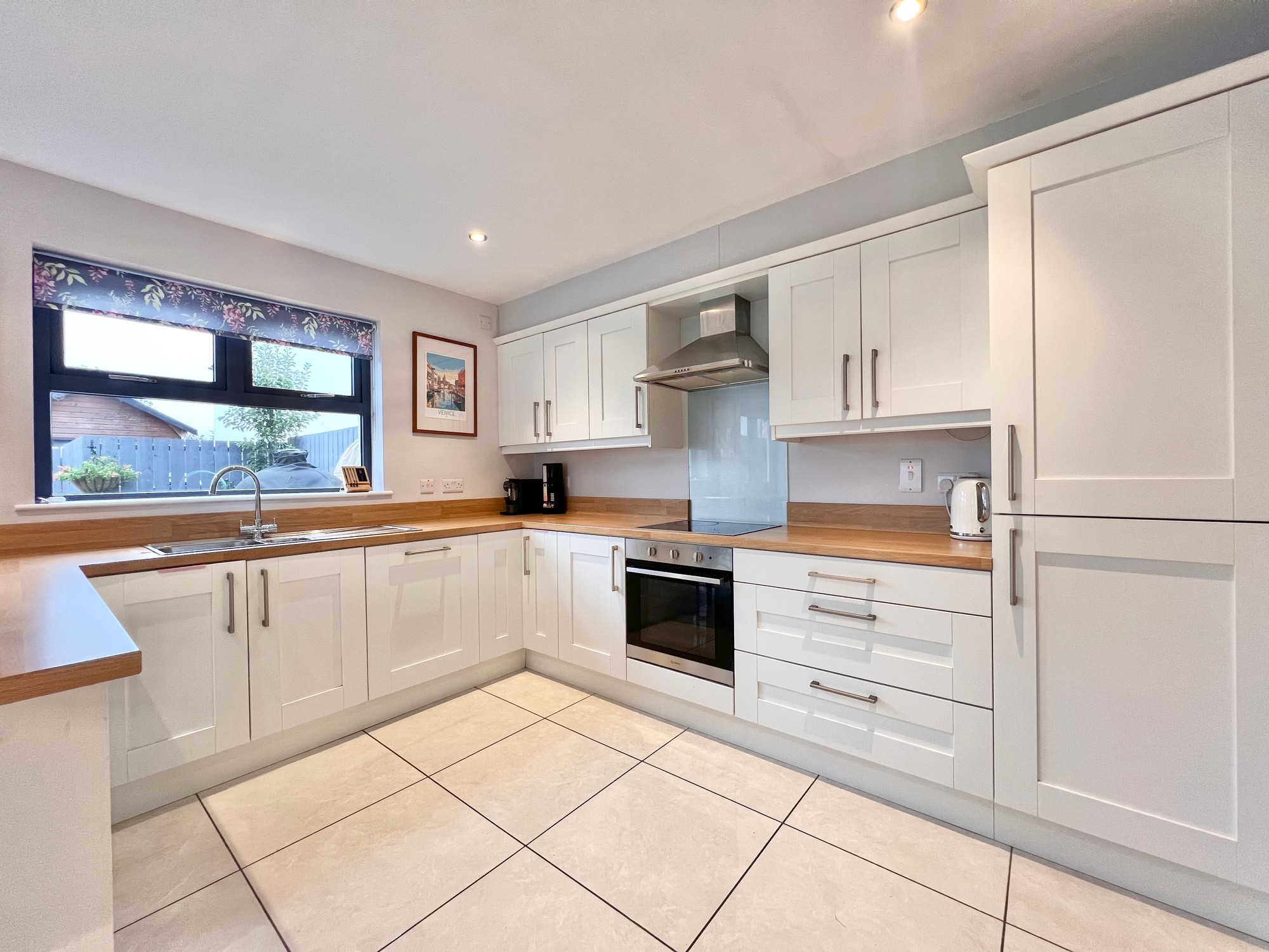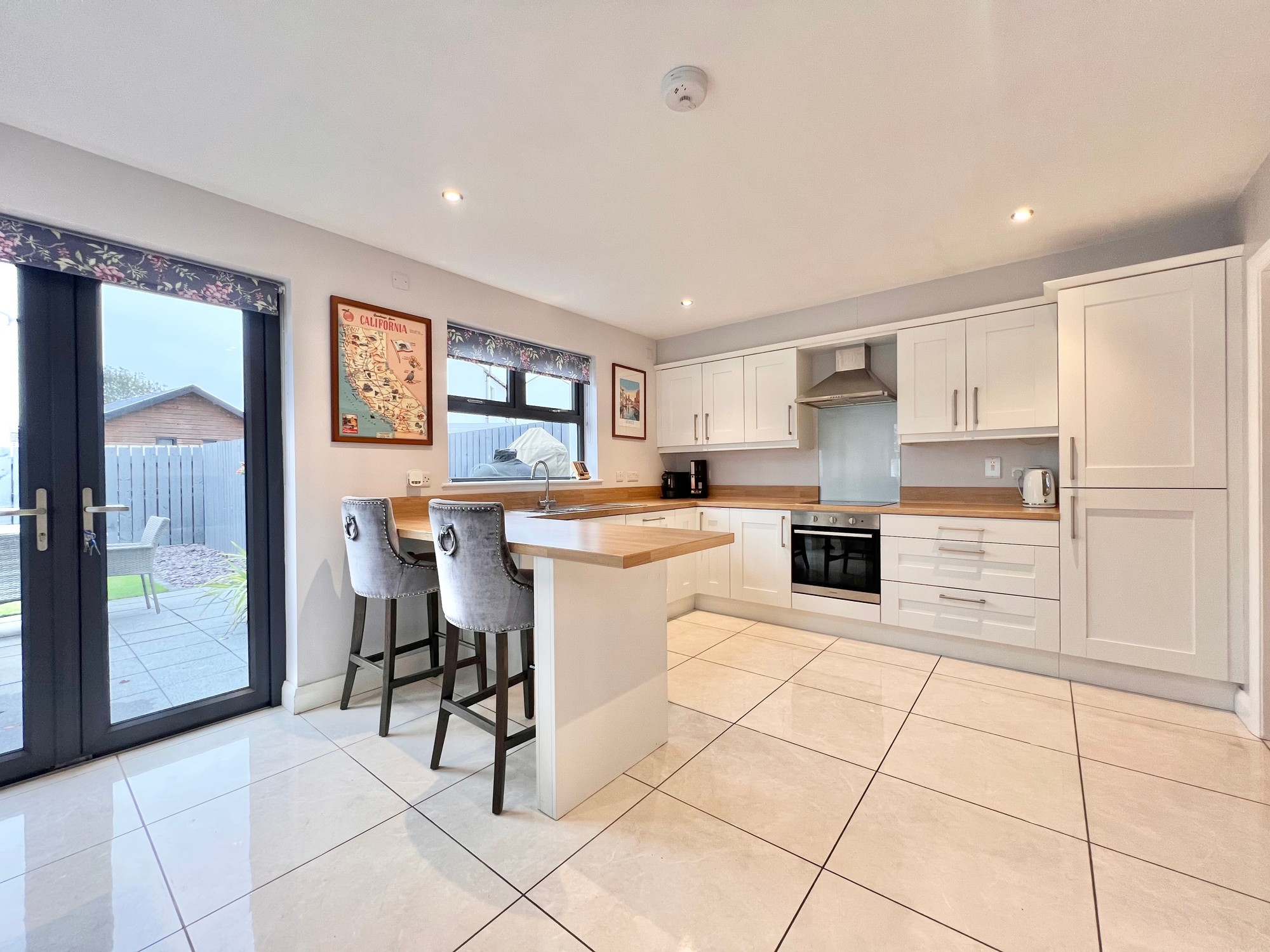 With an excellent range of eye and low level kitchen units, breakfast bar area, stainless steel sink unit, electric hob & electric oven, extractor fan, integrated fridge/freezer, integrated dishwasher, recessed lights, floor fully tiled, dining area, double doors to patio paved area.