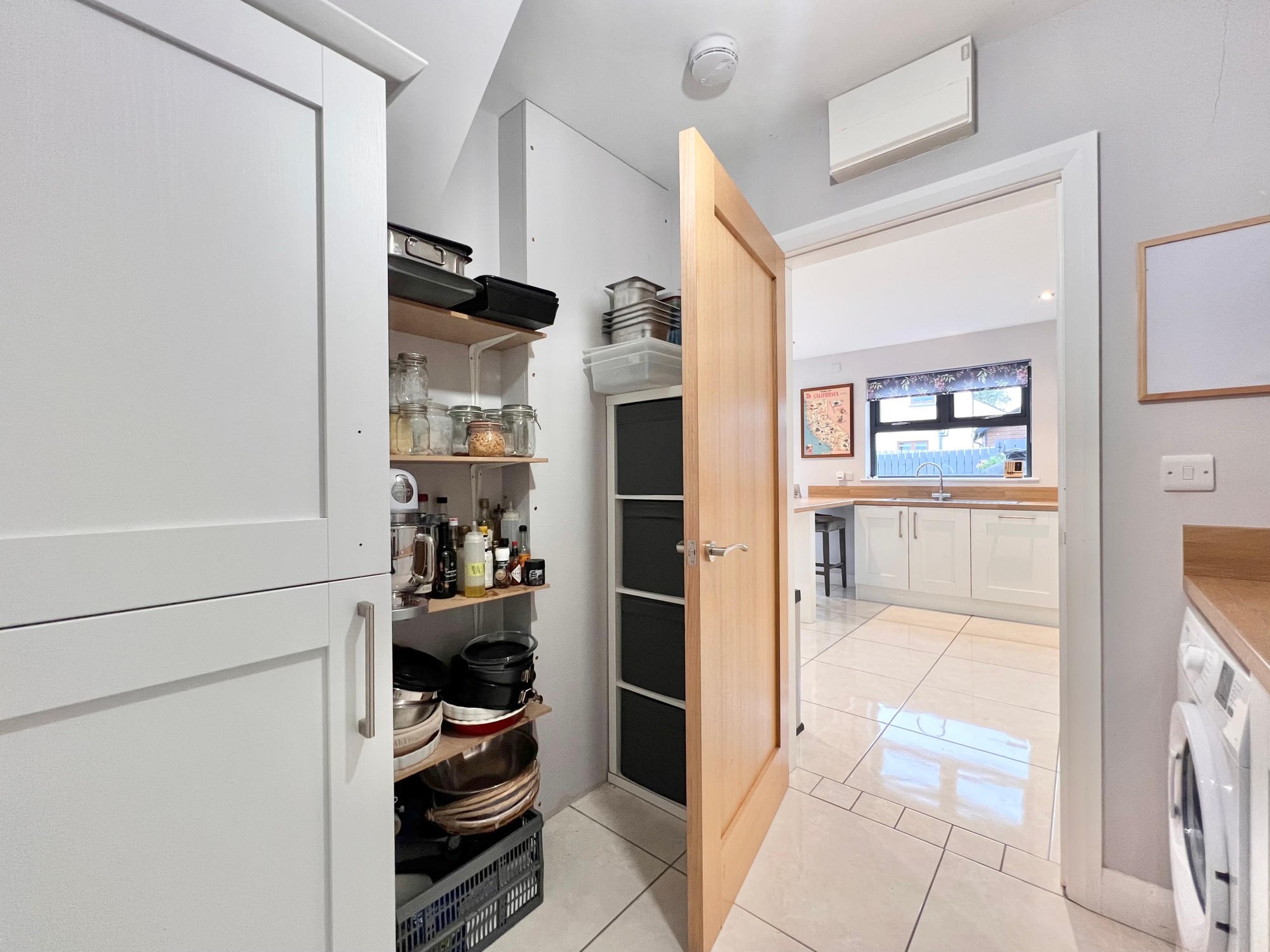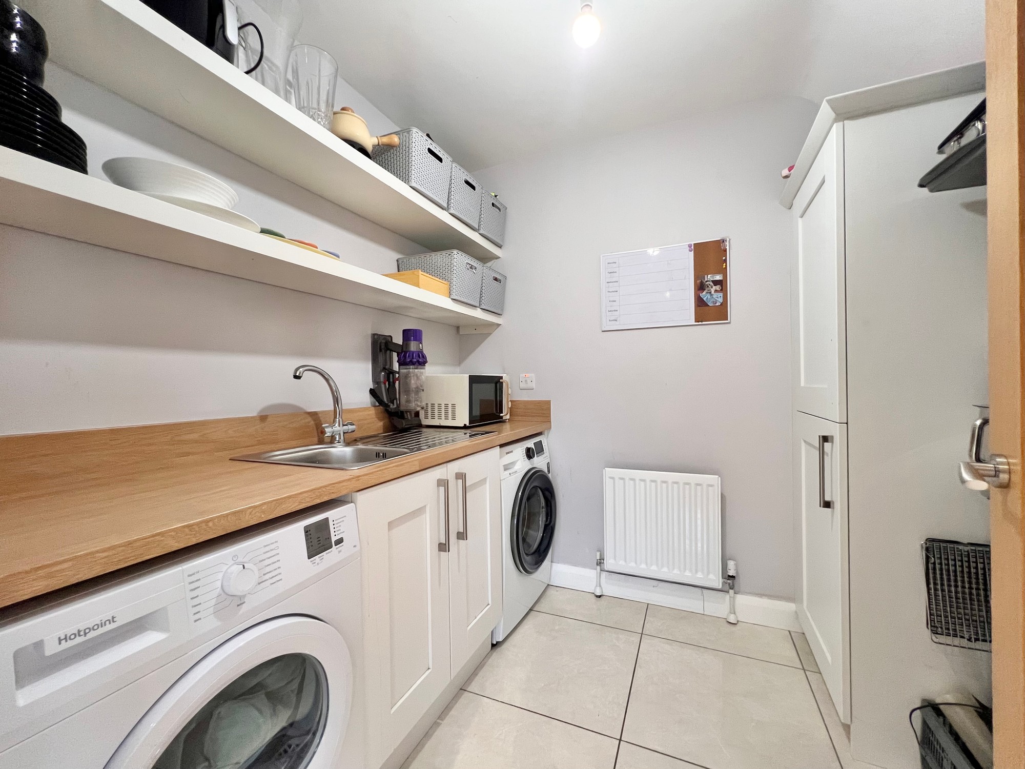With eye and low level units, stainless steel sink unit, plumbed for washing machine, space for tumble dryer, floor fully tiled.