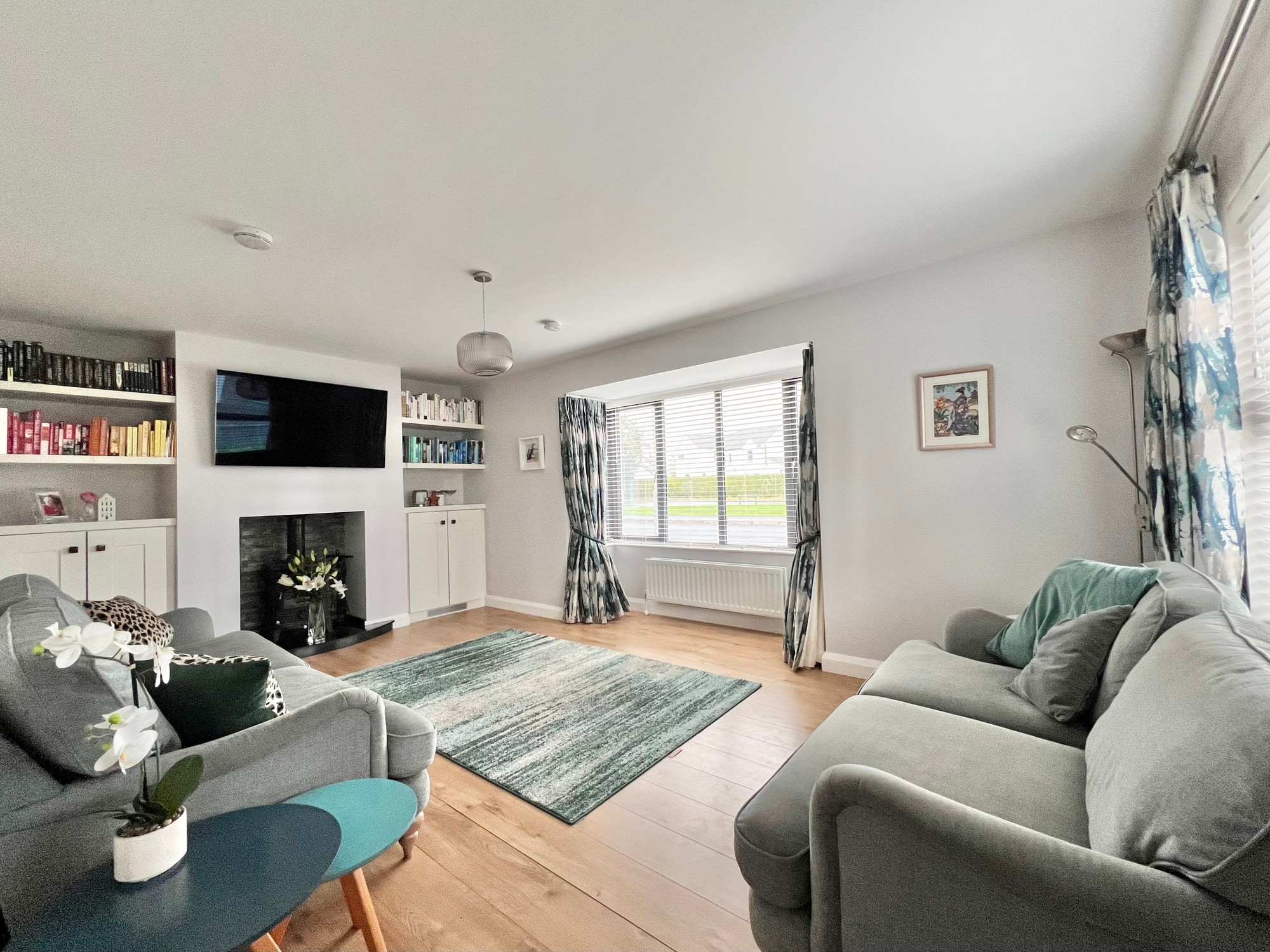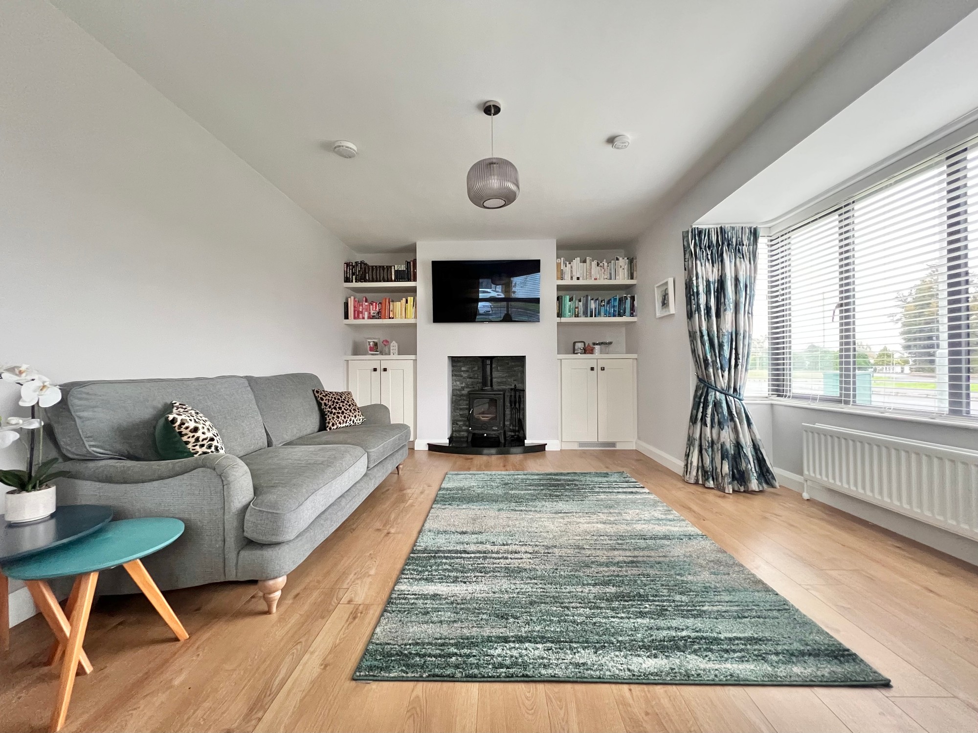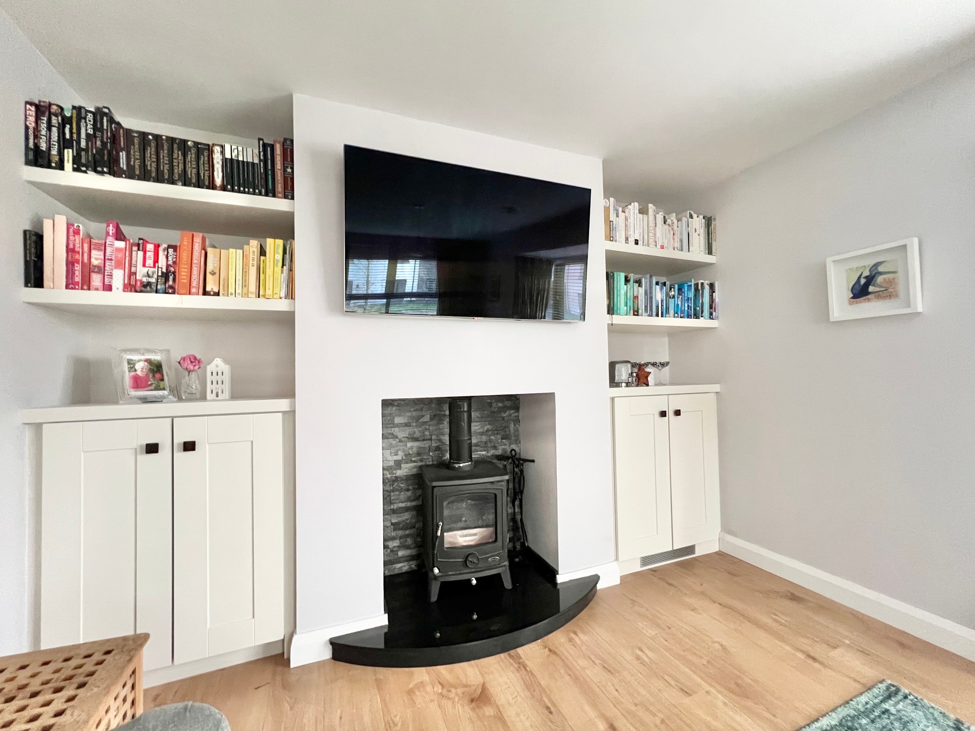 Built in wood burning stove with granite hearth, fitted storage cupboards and shelving, laminate wood floor, eye level tv point above stove, bay window.
