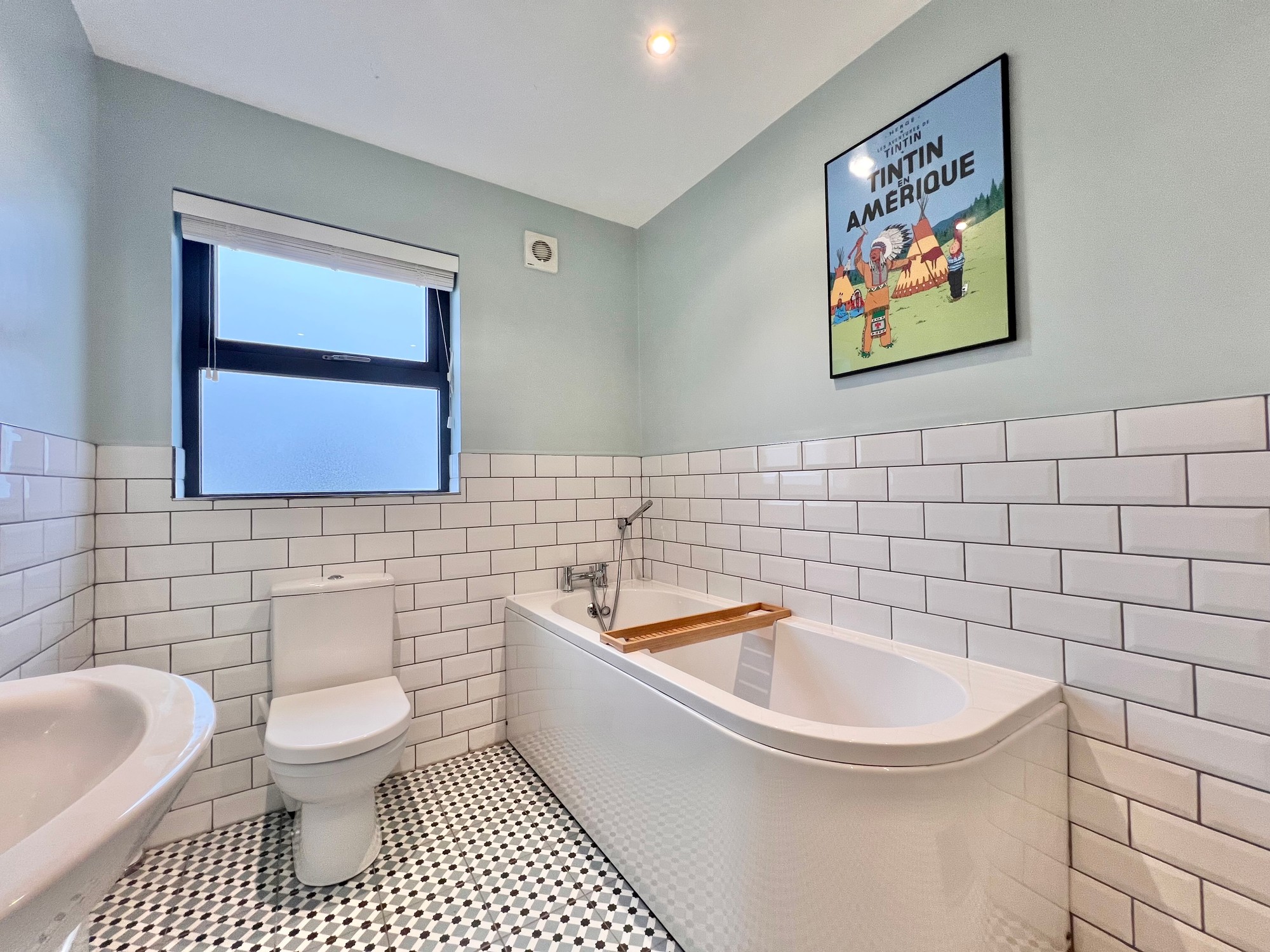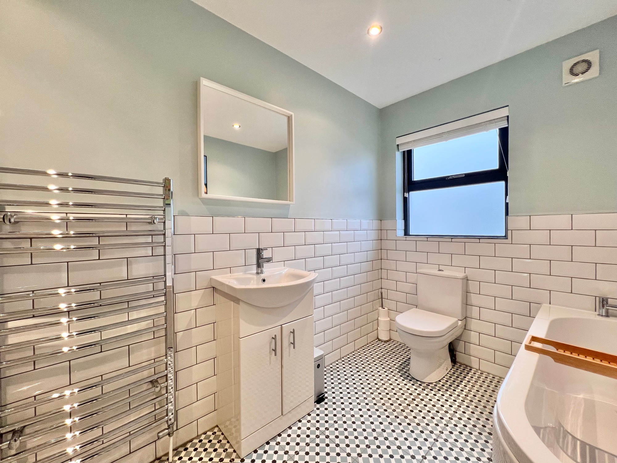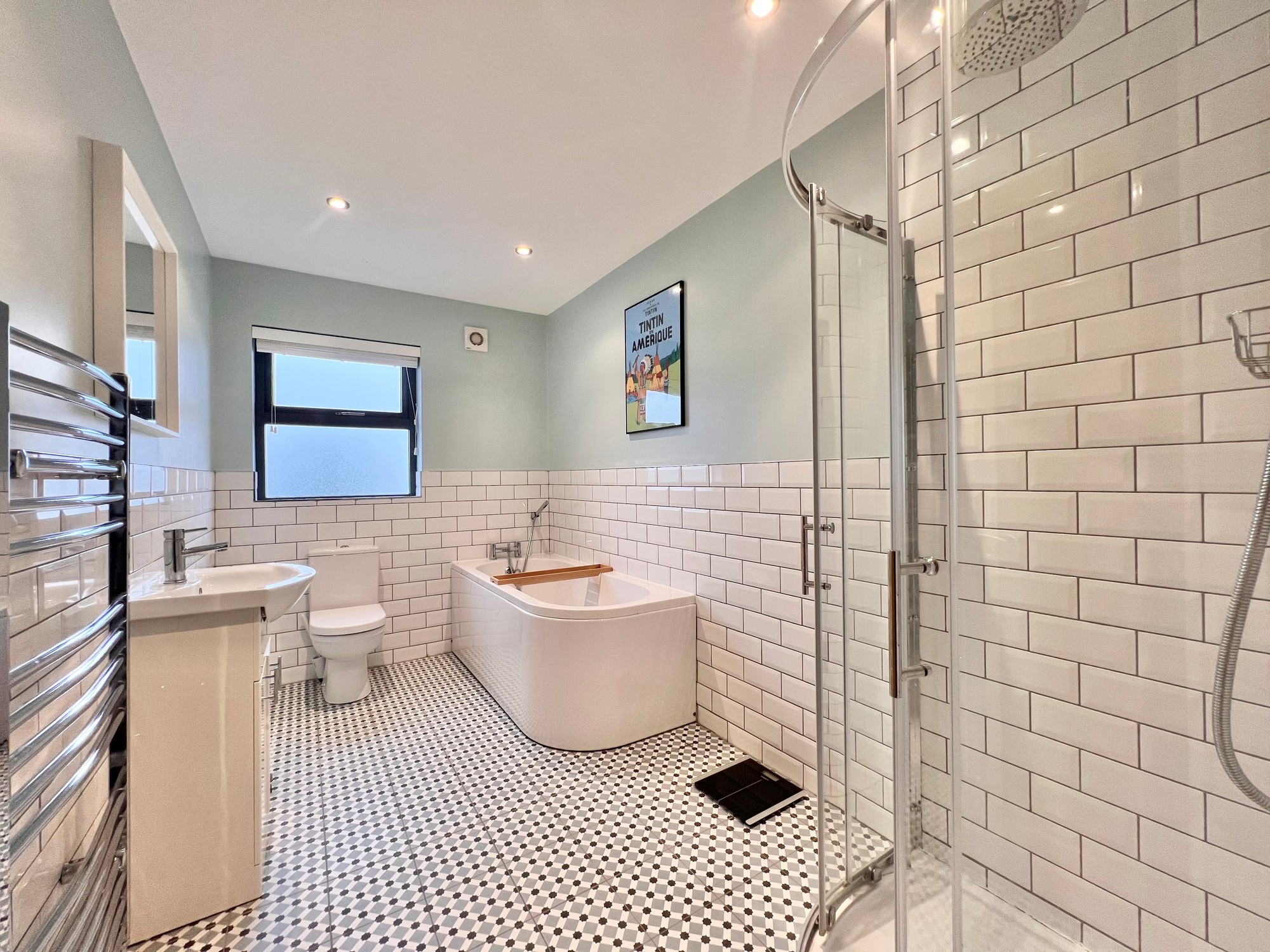 Contemporary four piece white suite comprising of wc, whb and vanity unit, bath, power shower with rainfall shower head, chrome towel rail, recessed lights, walls part tiled, floor fully tiled.