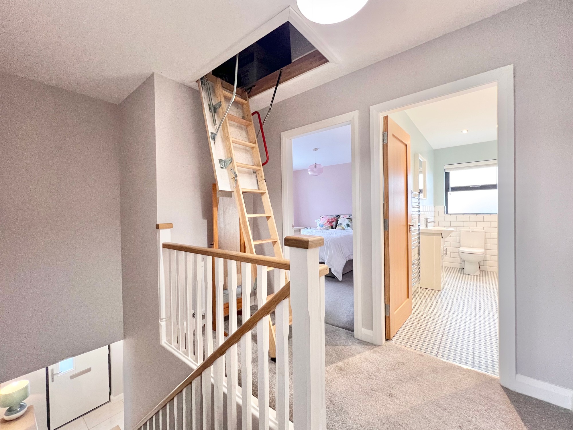 En-suite: Contemporary four piece white suite comprising of wc, whb and vanity unit, power shower, mirrored bathroom storage cabinet, recessed lights, walls part tiled, floor fully tiled.