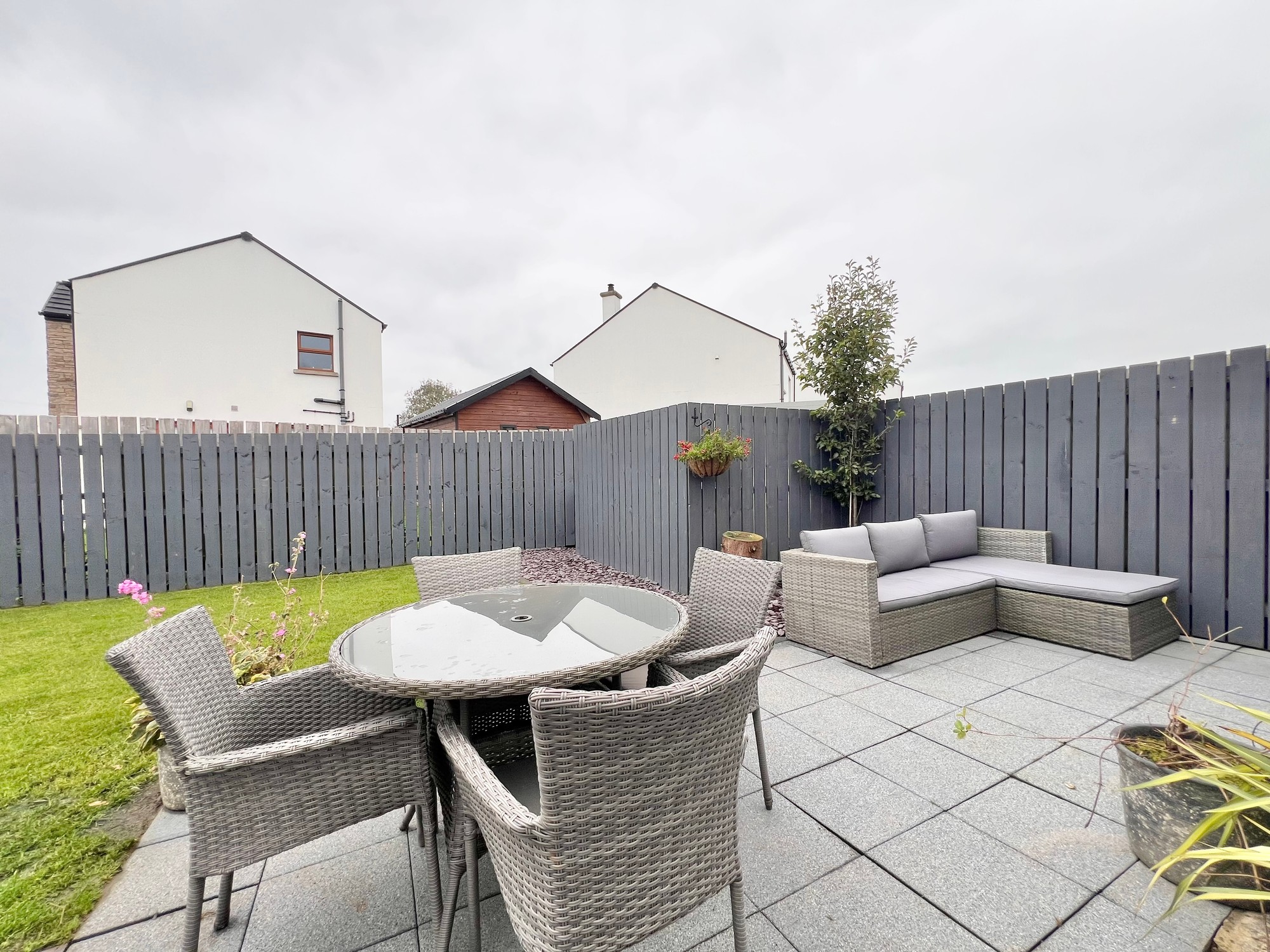 Fully enclosed garden to the side of property laid in lawn with paved outdoor area.