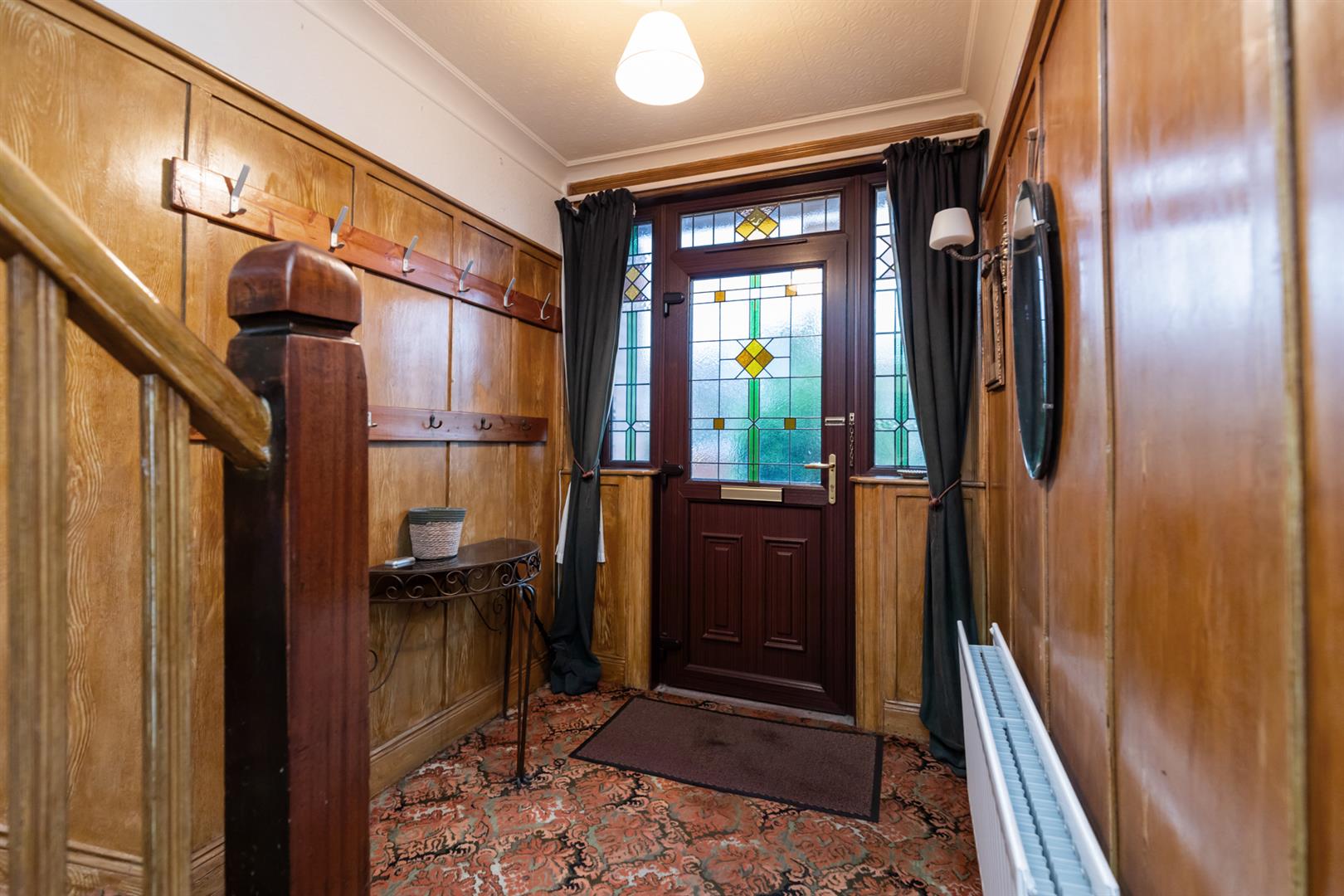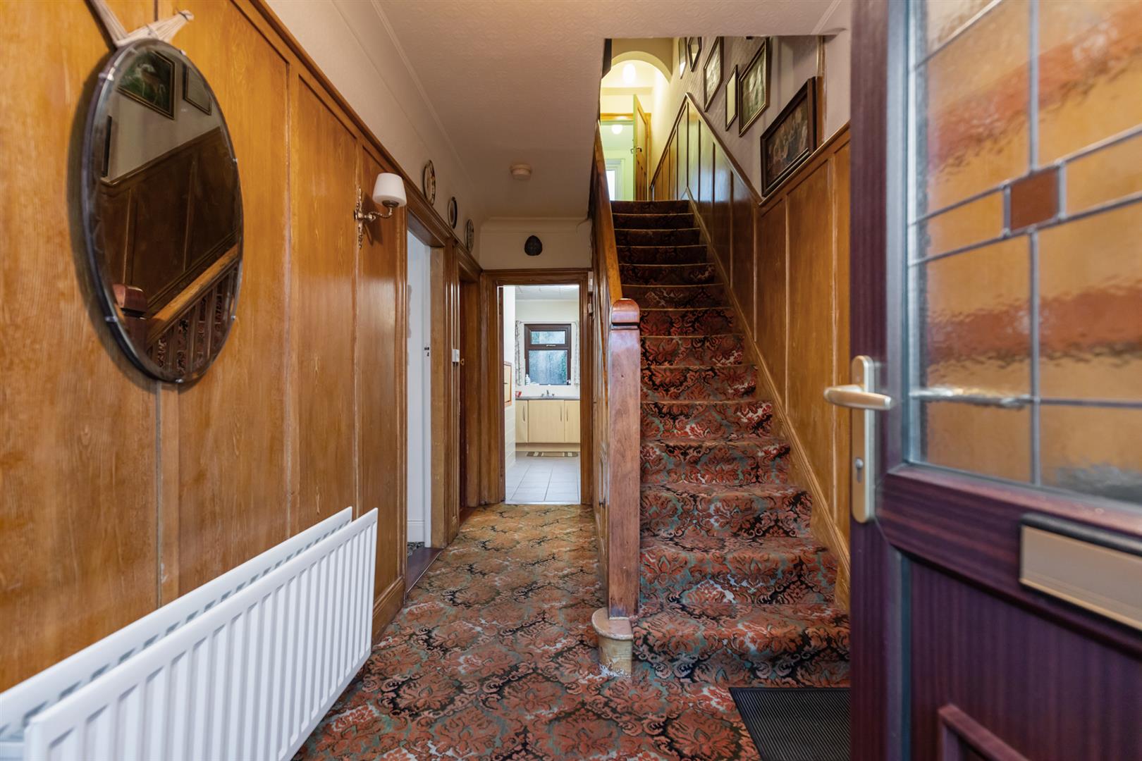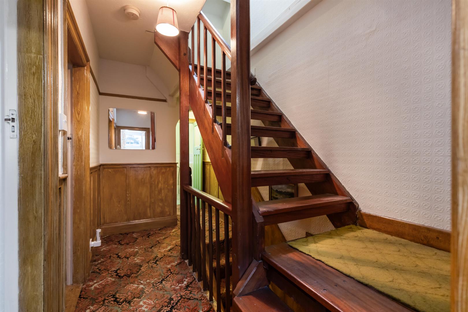 Cornicing, wood panelling, storage understairs.