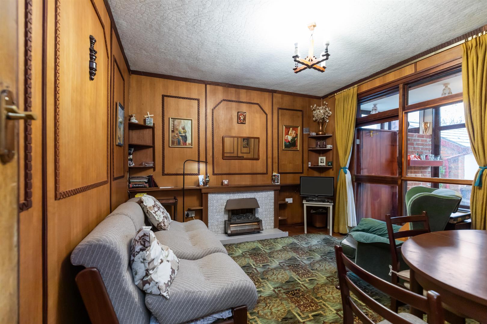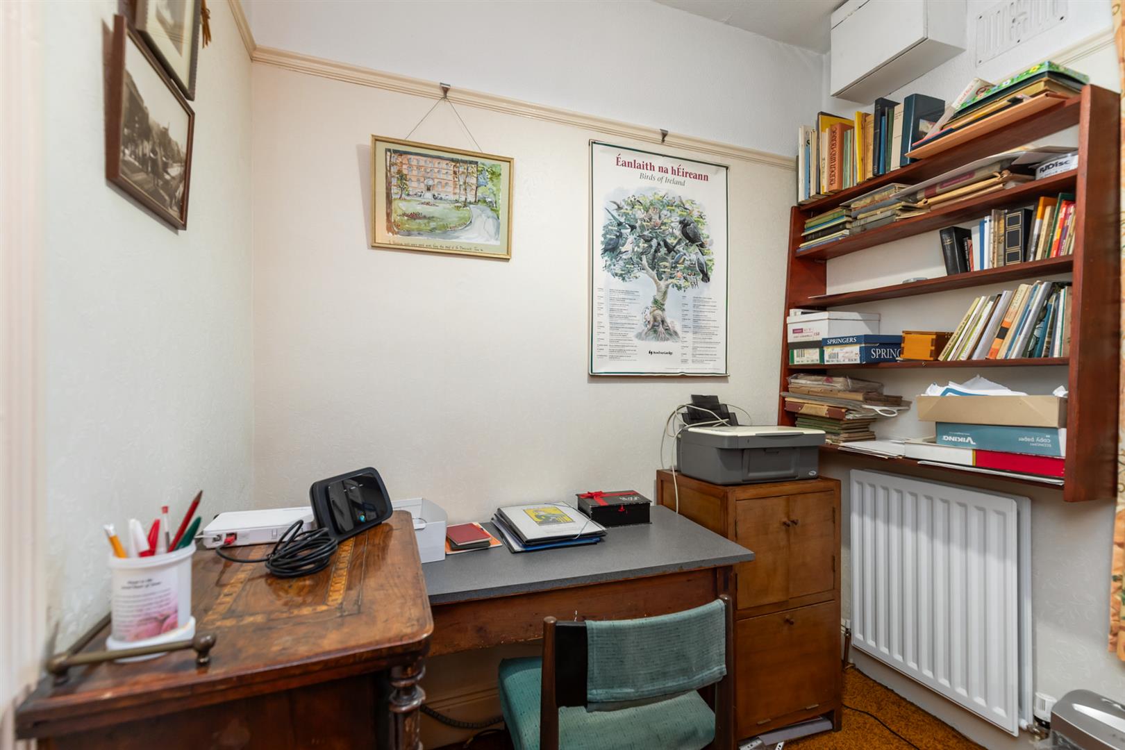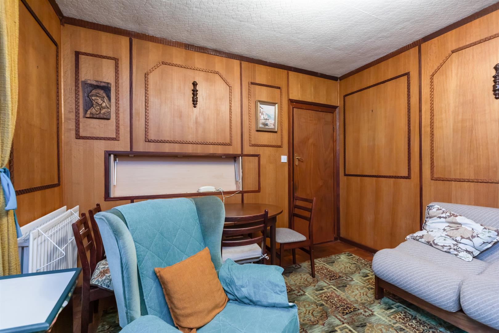 Cornicing, wood panelling, storage understairs.