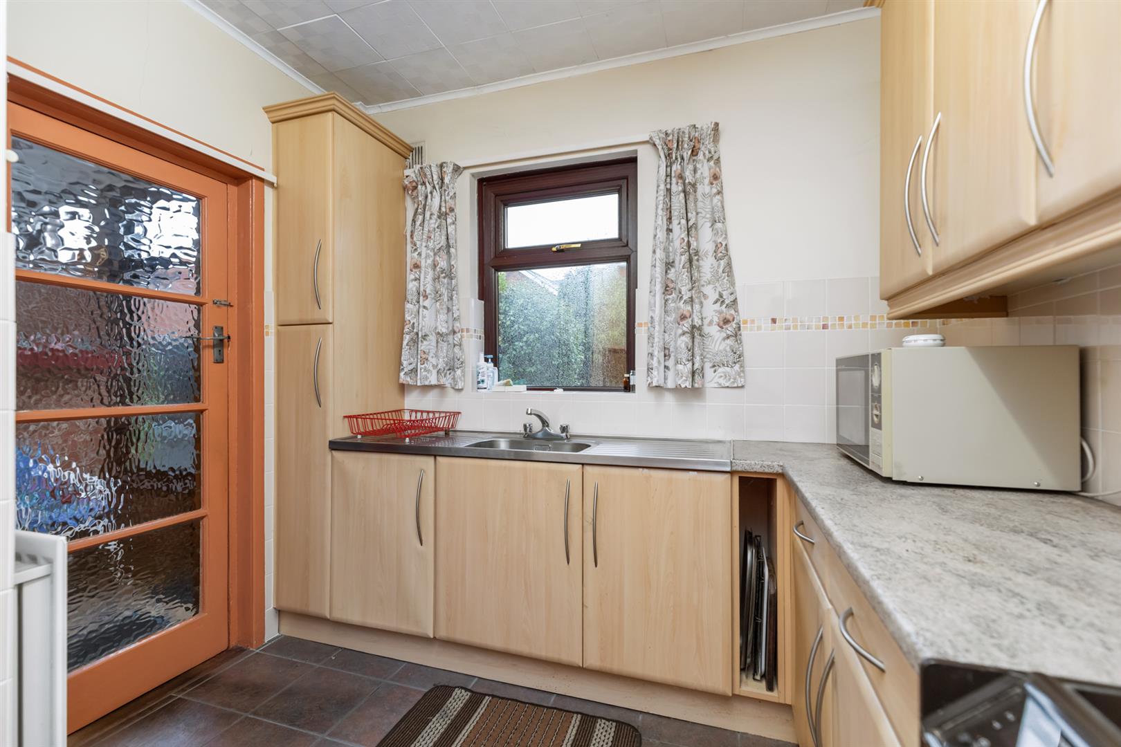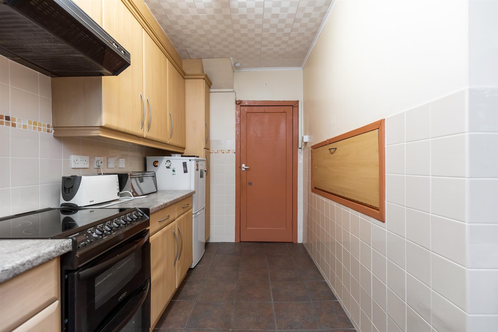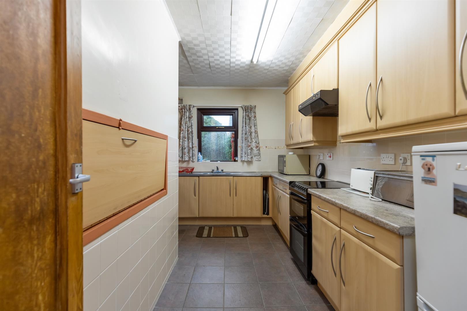 Range of high and low level units, single drainer stainless steel sink unit, tiled floor, partially tiled walls, access from kitchen to;