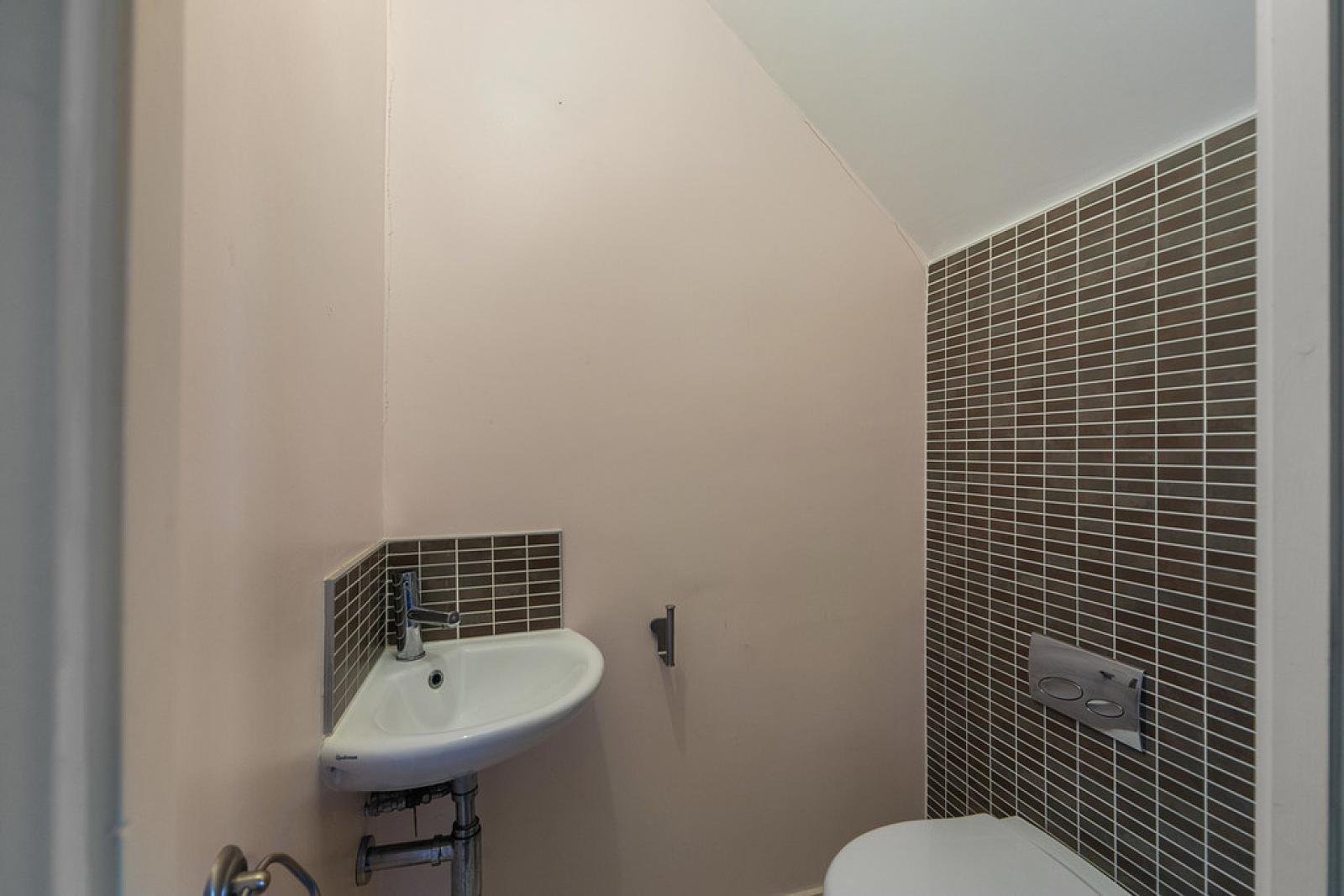 CLOAKROOM White suite comprising WC, wash hand basin, tiled floor, part tiled walls.