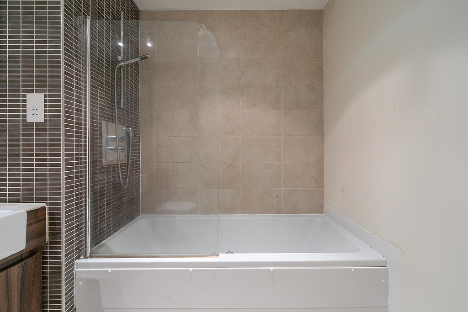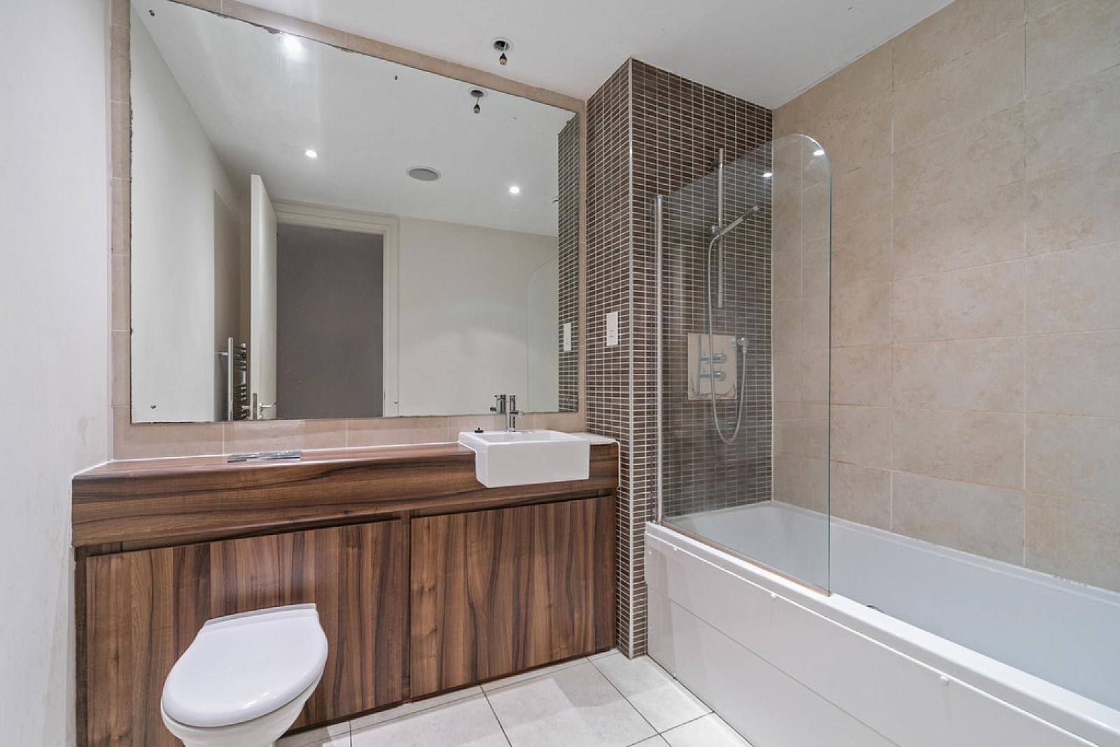 BATHROOM White suite comprising panelled bath with mixer tap and shower over, vanity unit, WC, integrated mirror, part tiled walls, tiled floor, low voltage spotlights, extractor fan.