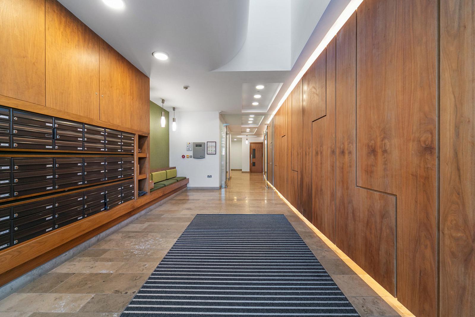 Secure communal front door to communal reception hall, front door to...