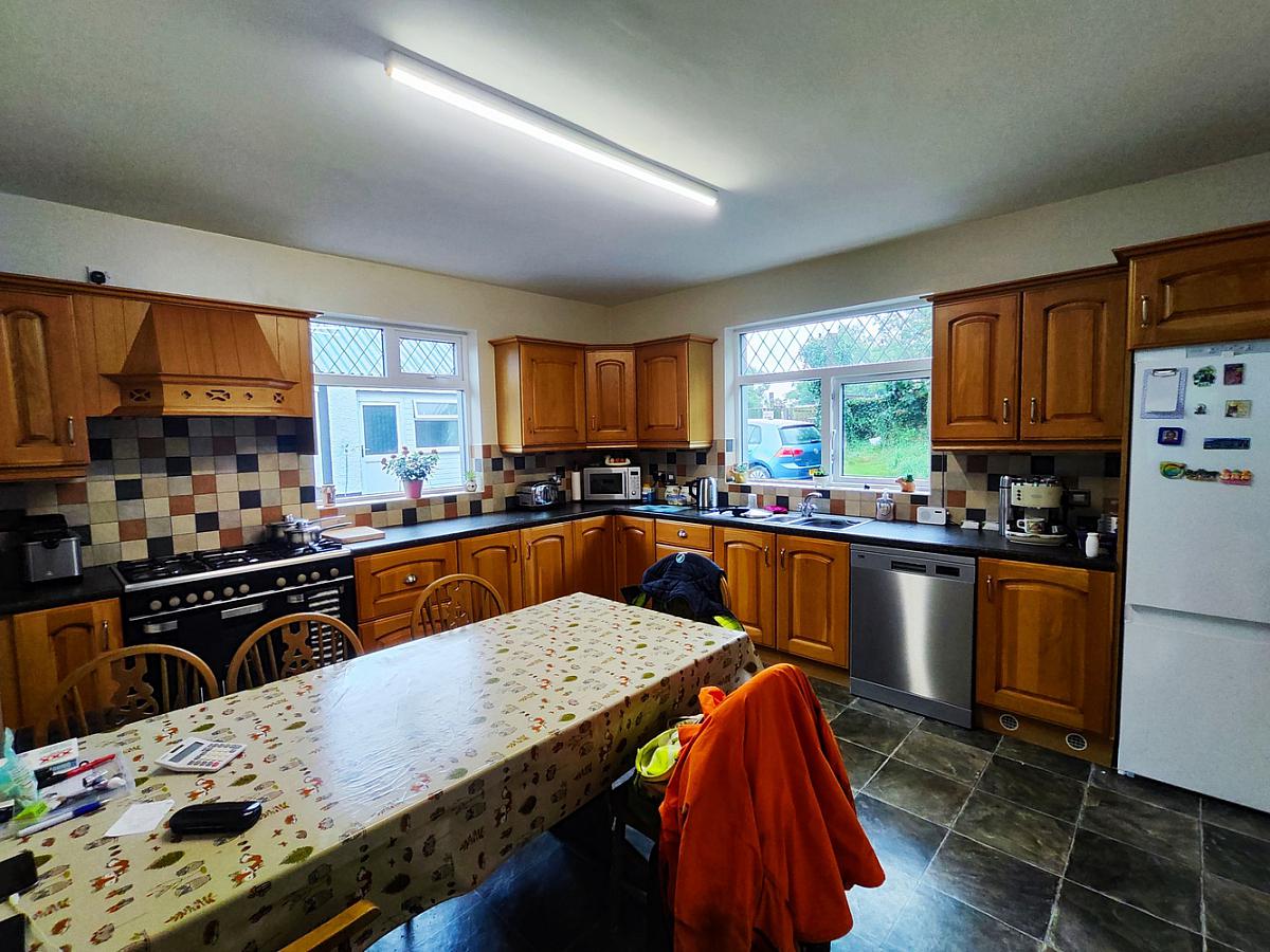 With a range of solid wood eye & low level units, 1/2 bowl stainless steel sink unit with mixer tap, concealed low level lighting, tiling around worktops, space for fridge freezer, dishwasher and range style cooker with built in extractor fan.