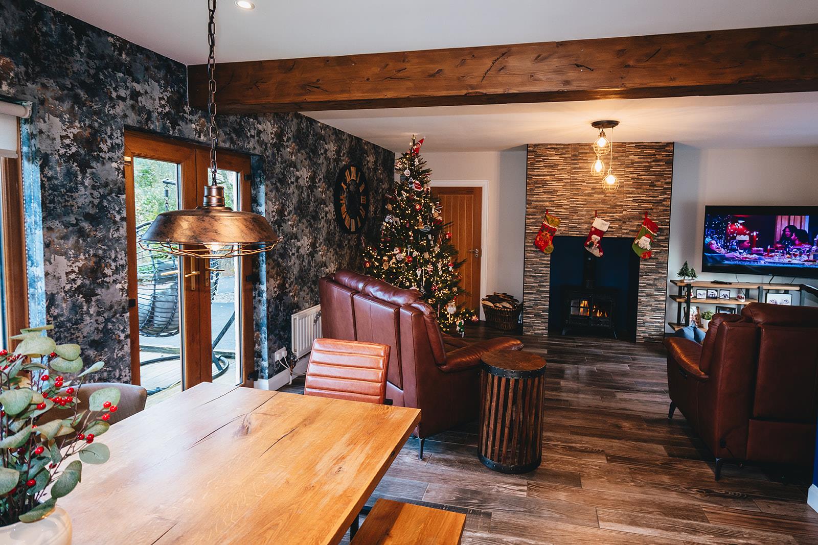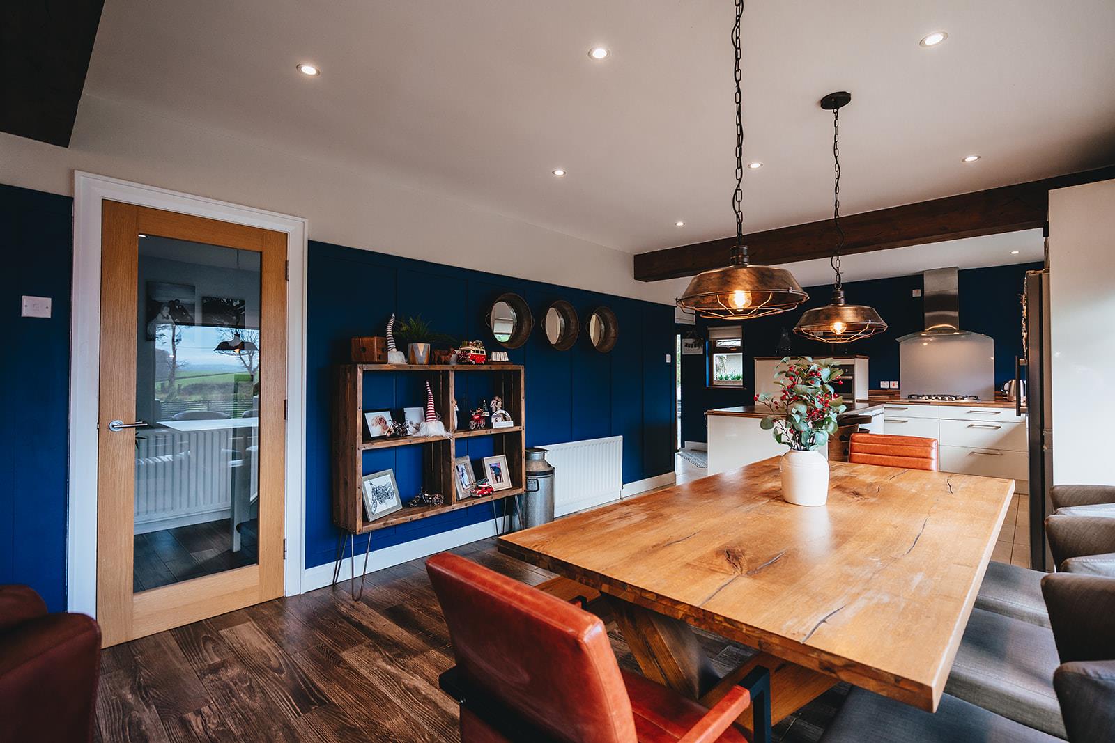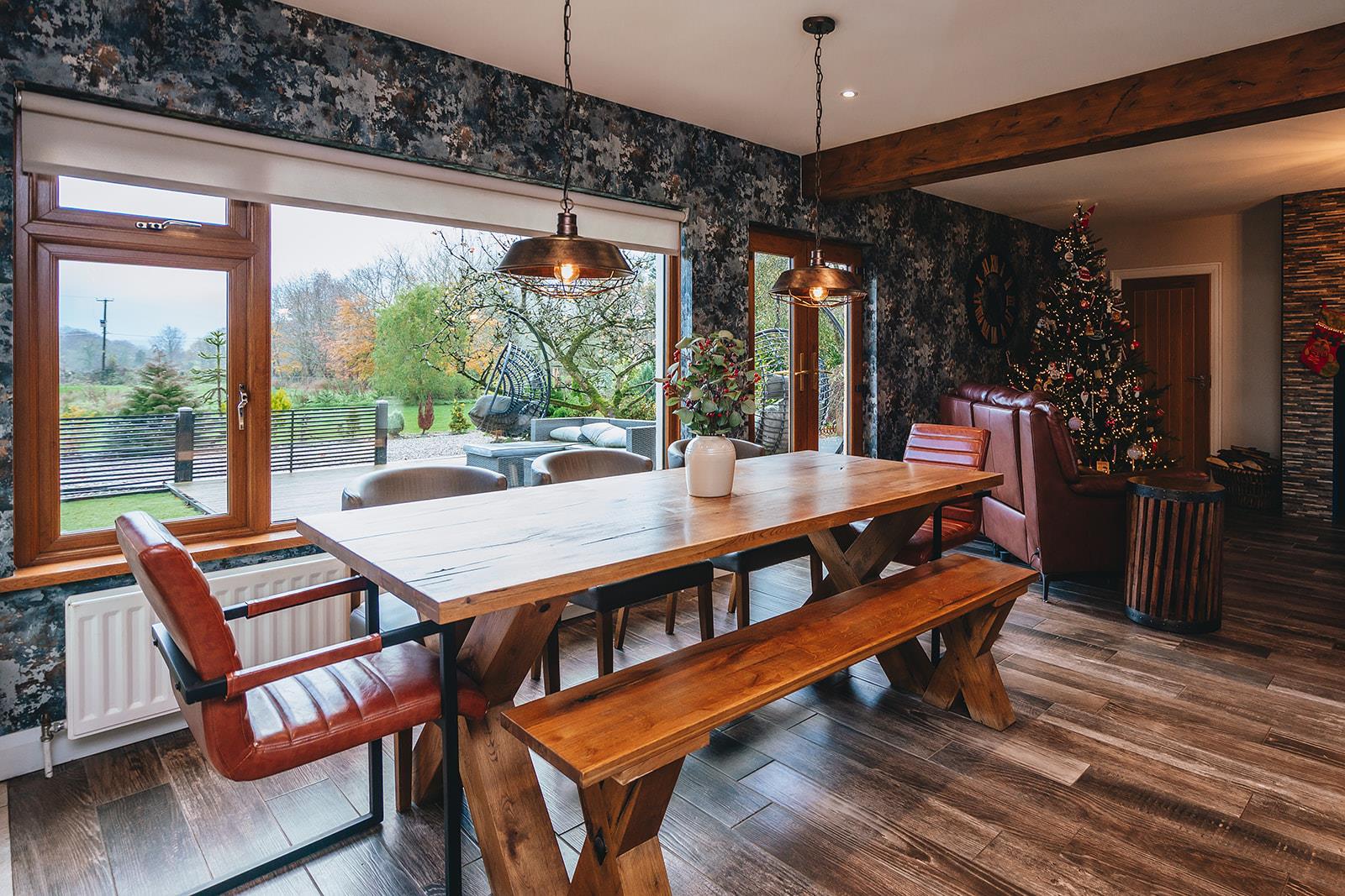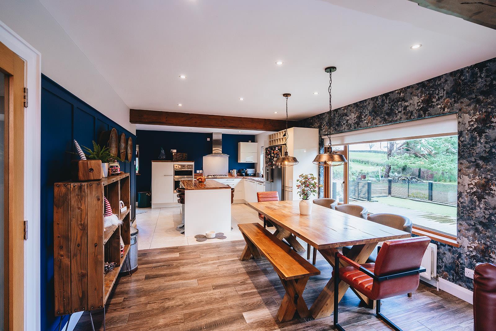 The lounge, dining and kitchen are all open plan providing a great entertaining space. The lounge has a multi-fuel stove in a decorative tiled chimney breast, feature wooden panelled walls and tiled floor. Steps to side hallway.