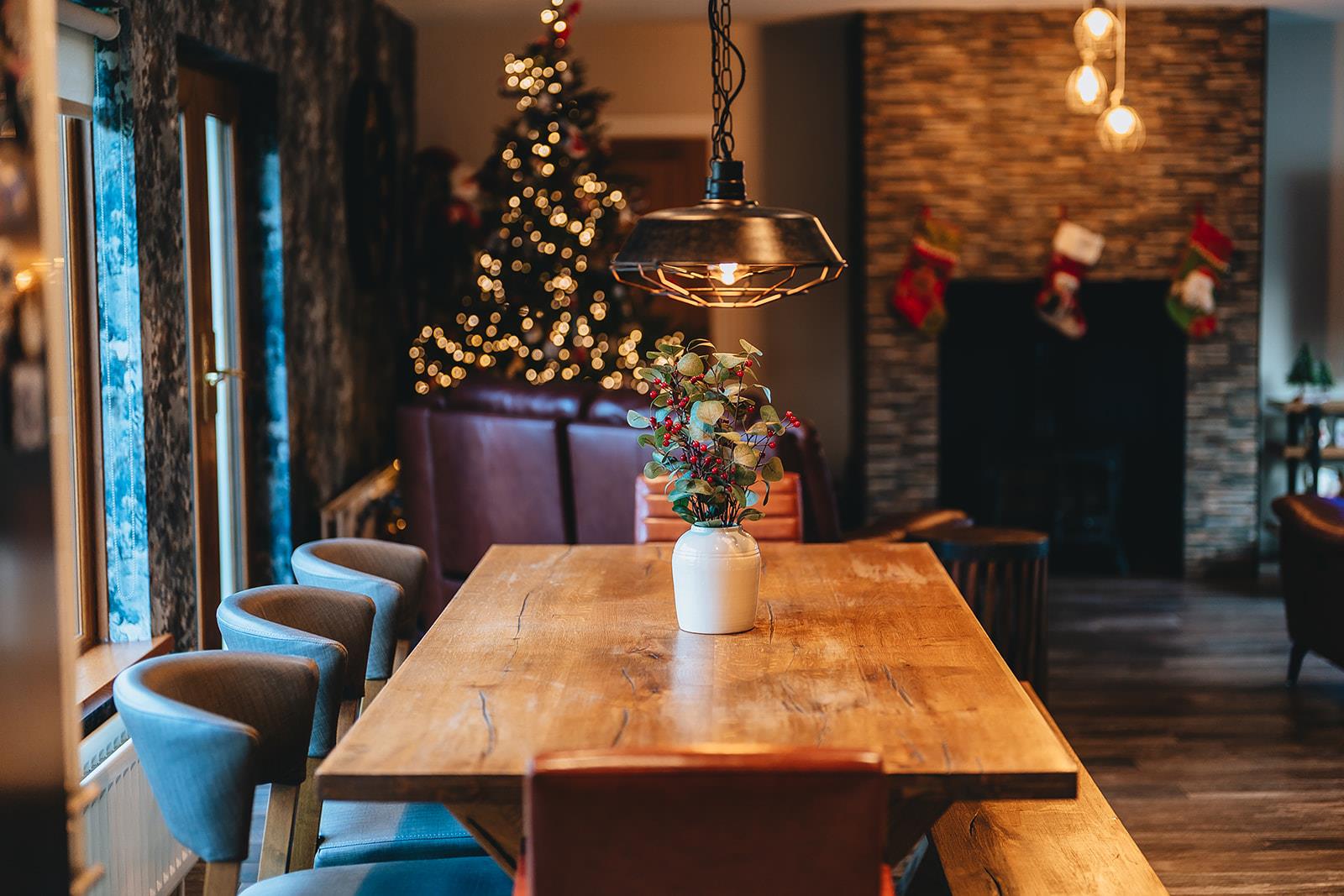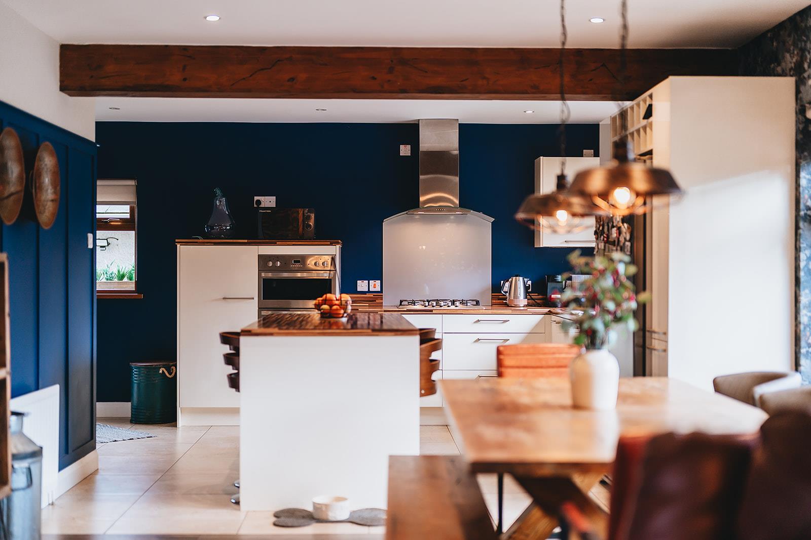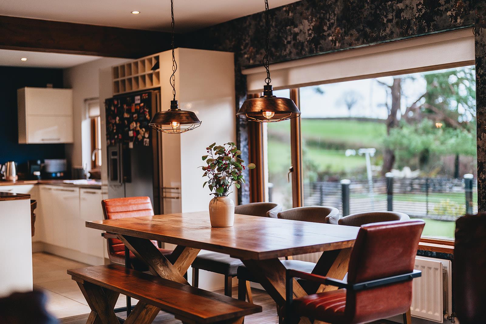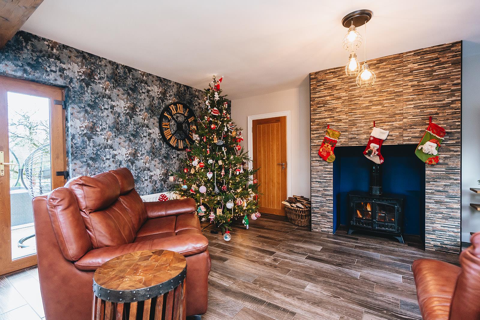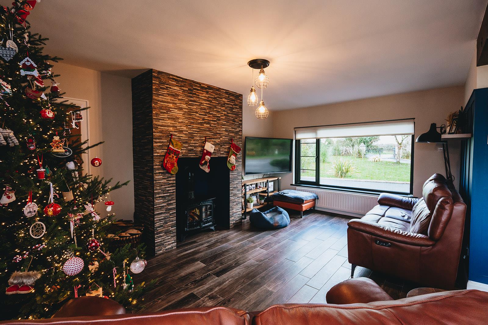 The lounge, dining and kitchen are all open plan providing a great entertaining space. The lounge has a multi-fuel stove in a decorative tiled chimney breast, feature wooden panelled walls and tiled floor. Steps to side hallway.