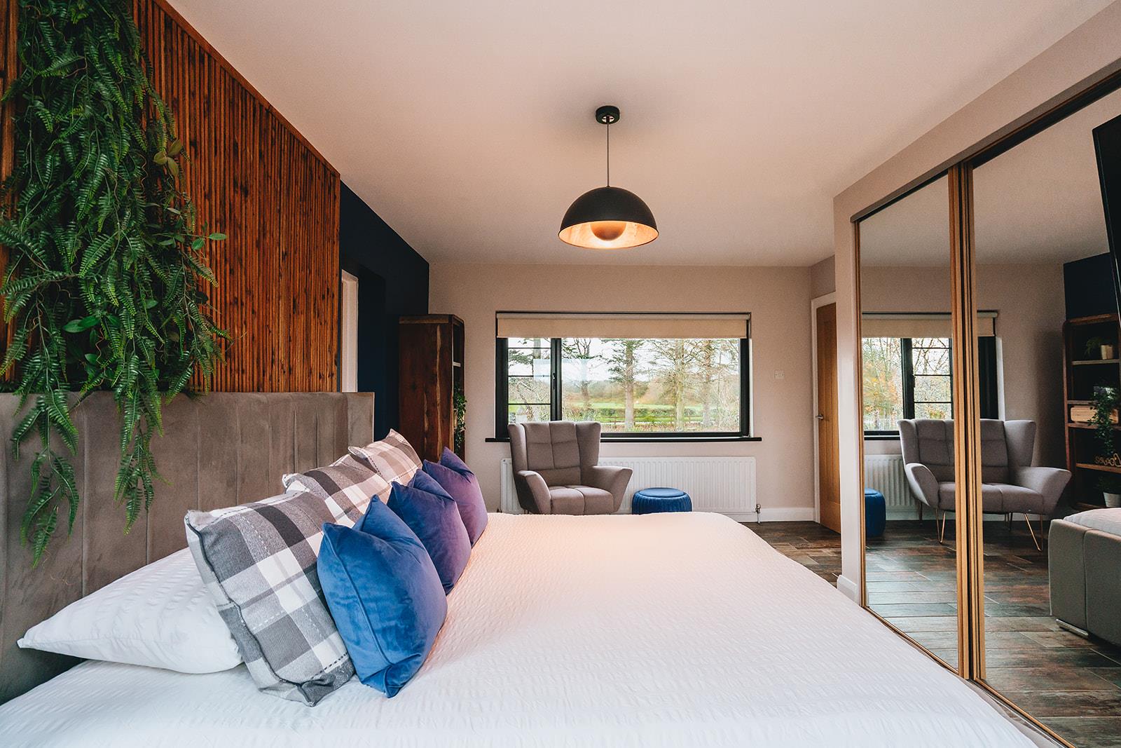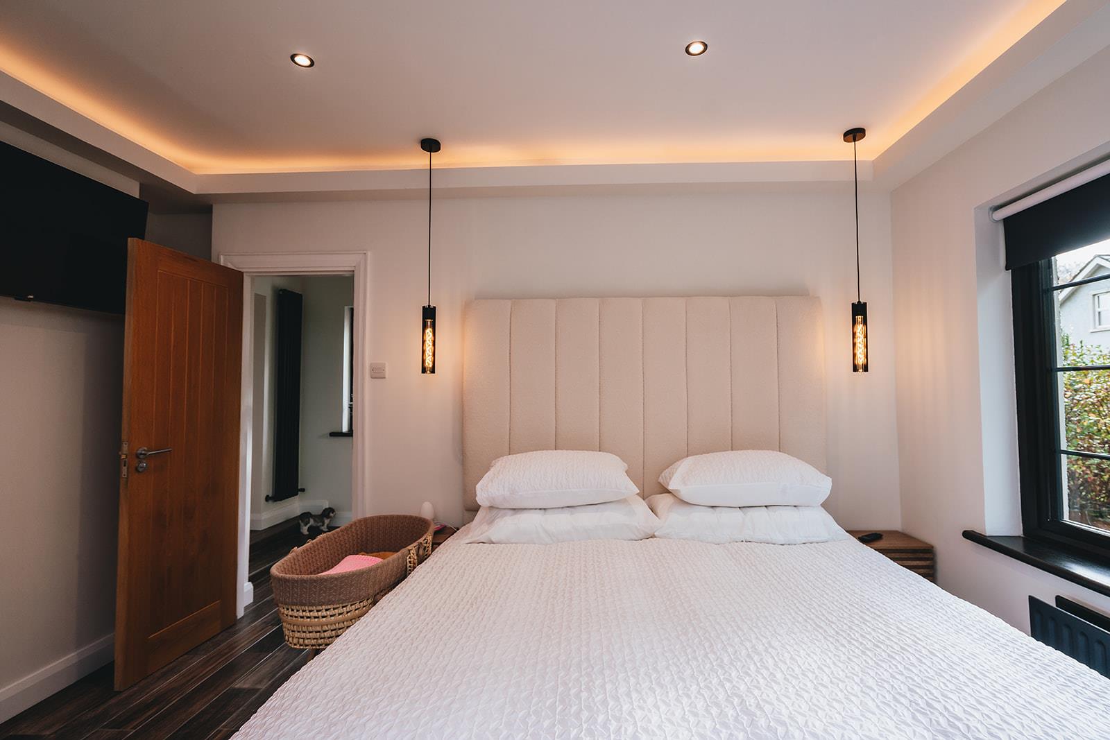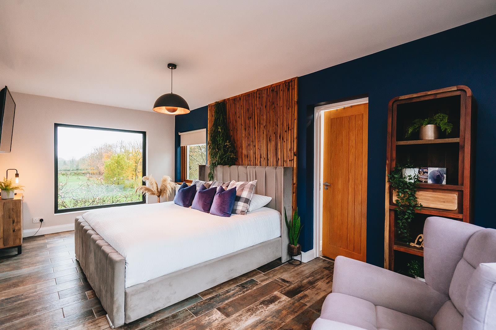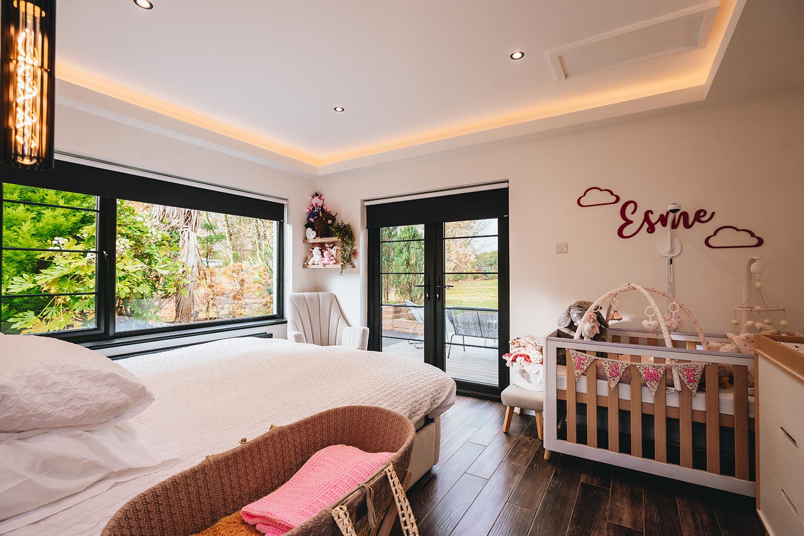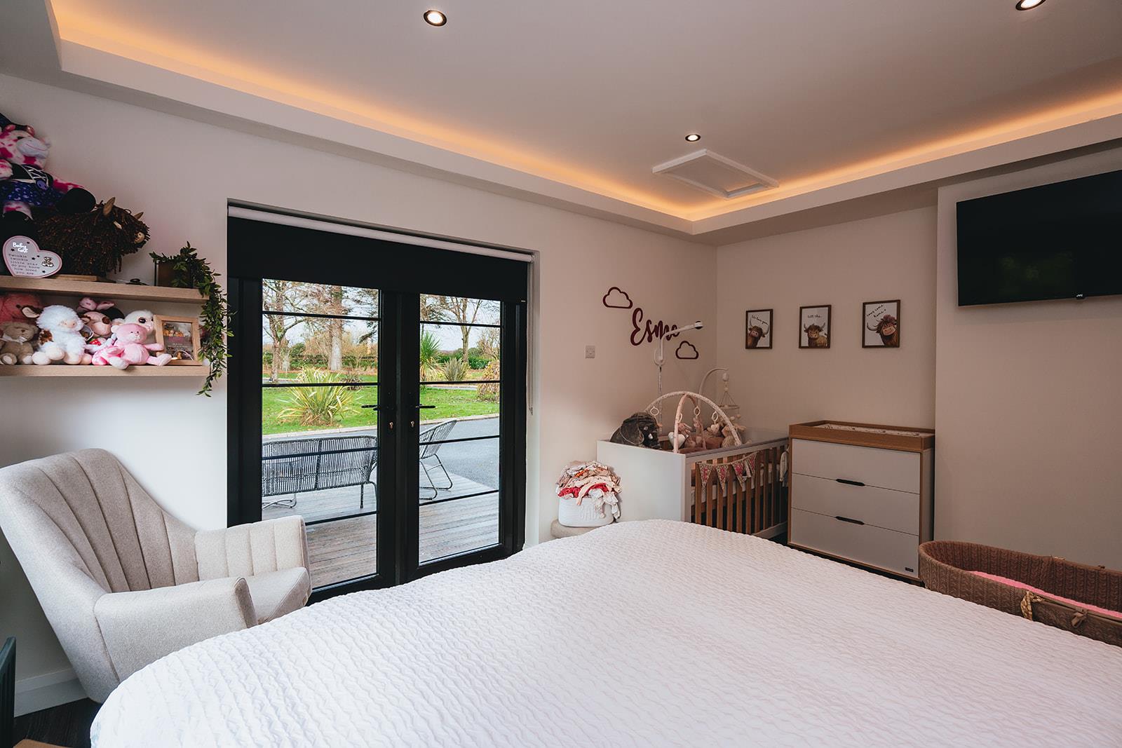 Stunning bedroom which has recently been refurbished to include a dropped ceiling with concealed lighting, tiled floor, low voltage spotlighting and French doors to decking area.