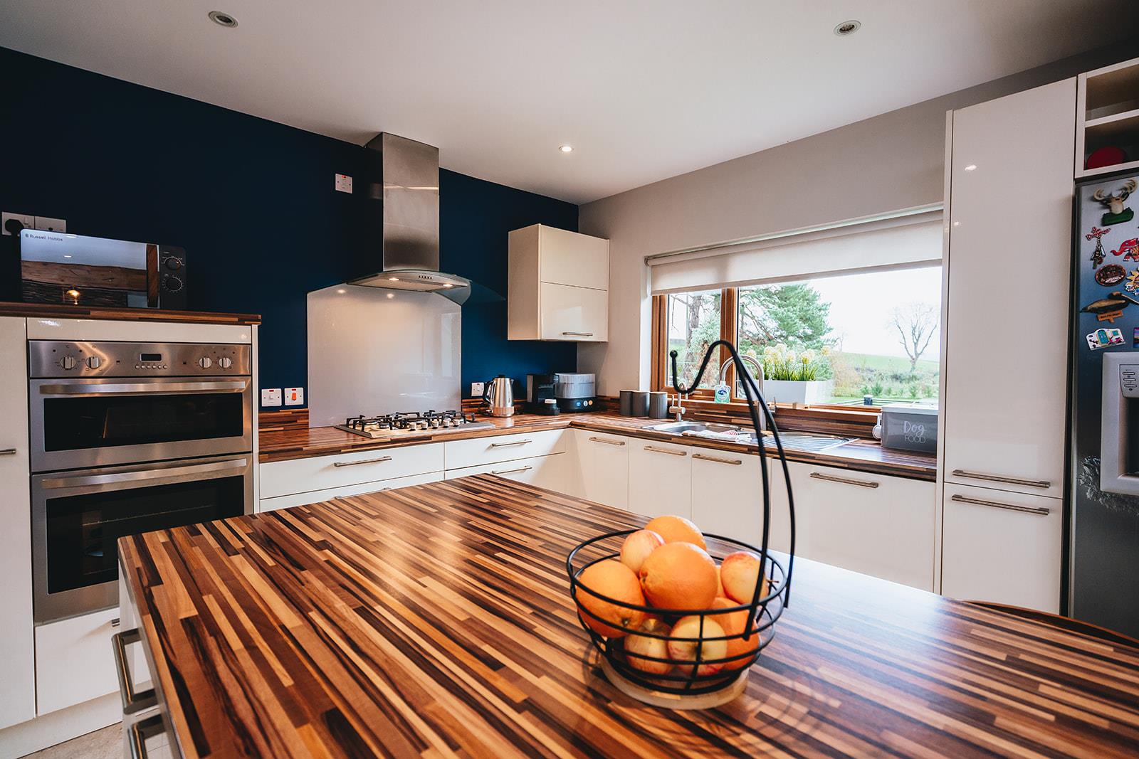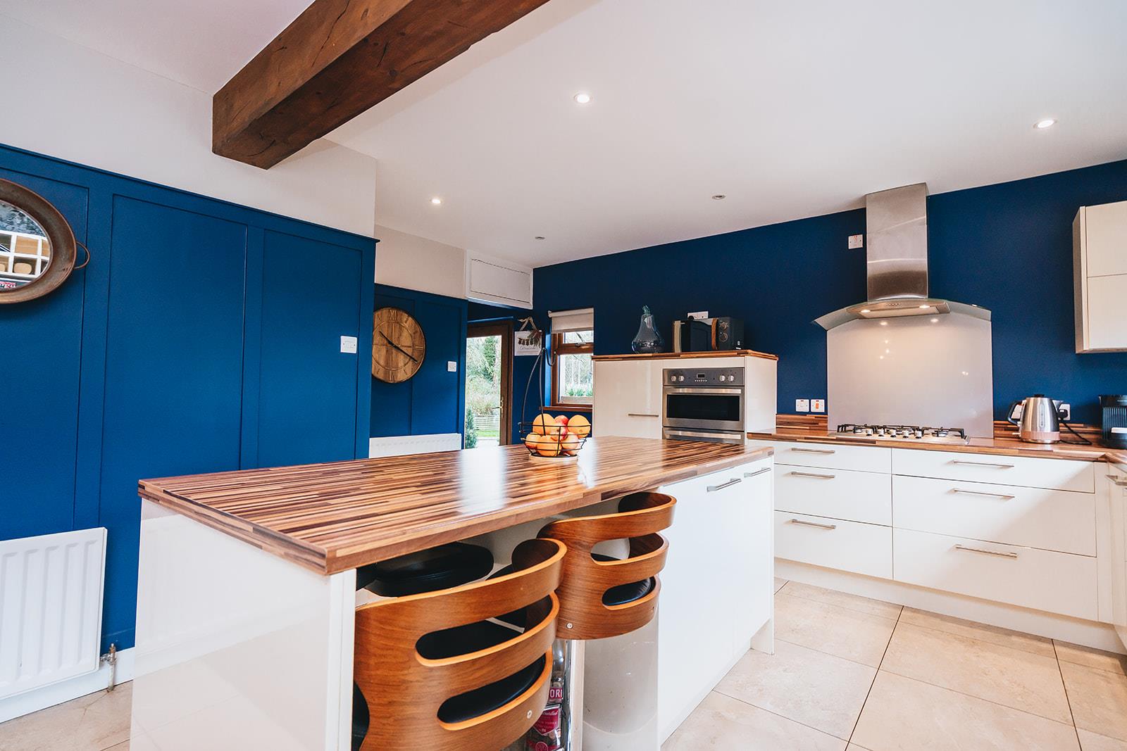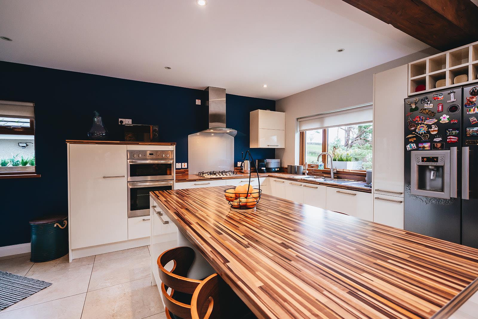 The kitchen comprises a range of gloss high and low level units incorporating double electric oven, gas 5 ring hob with extractor canopy with glass splashback, laminated worksurface with 1 1/2 bowl stainless steel sink inset, pull-out larder, American fridge freezer in housing with wine rack, integrated dishwasher, centre island with low level units and seating space, tiled floor, low voltage spotlighting and feature wooden panelled walls.