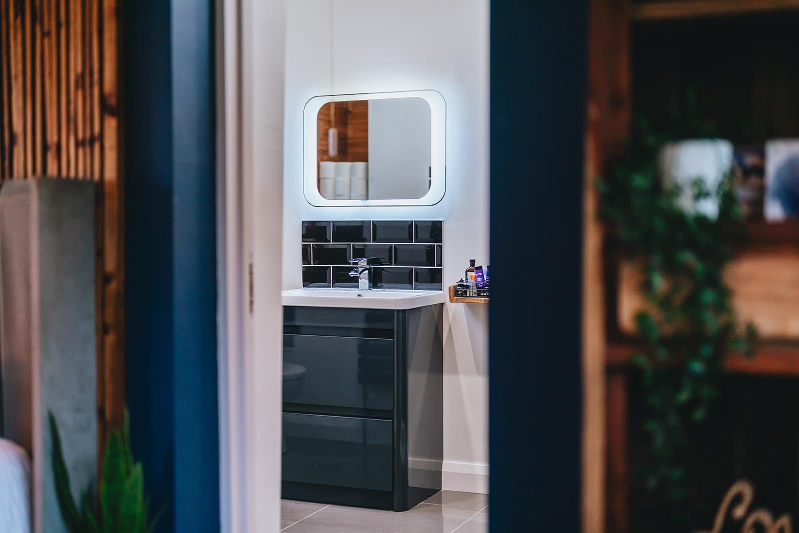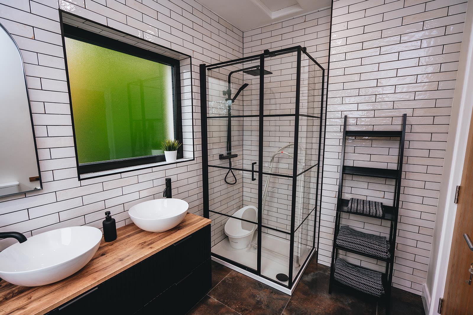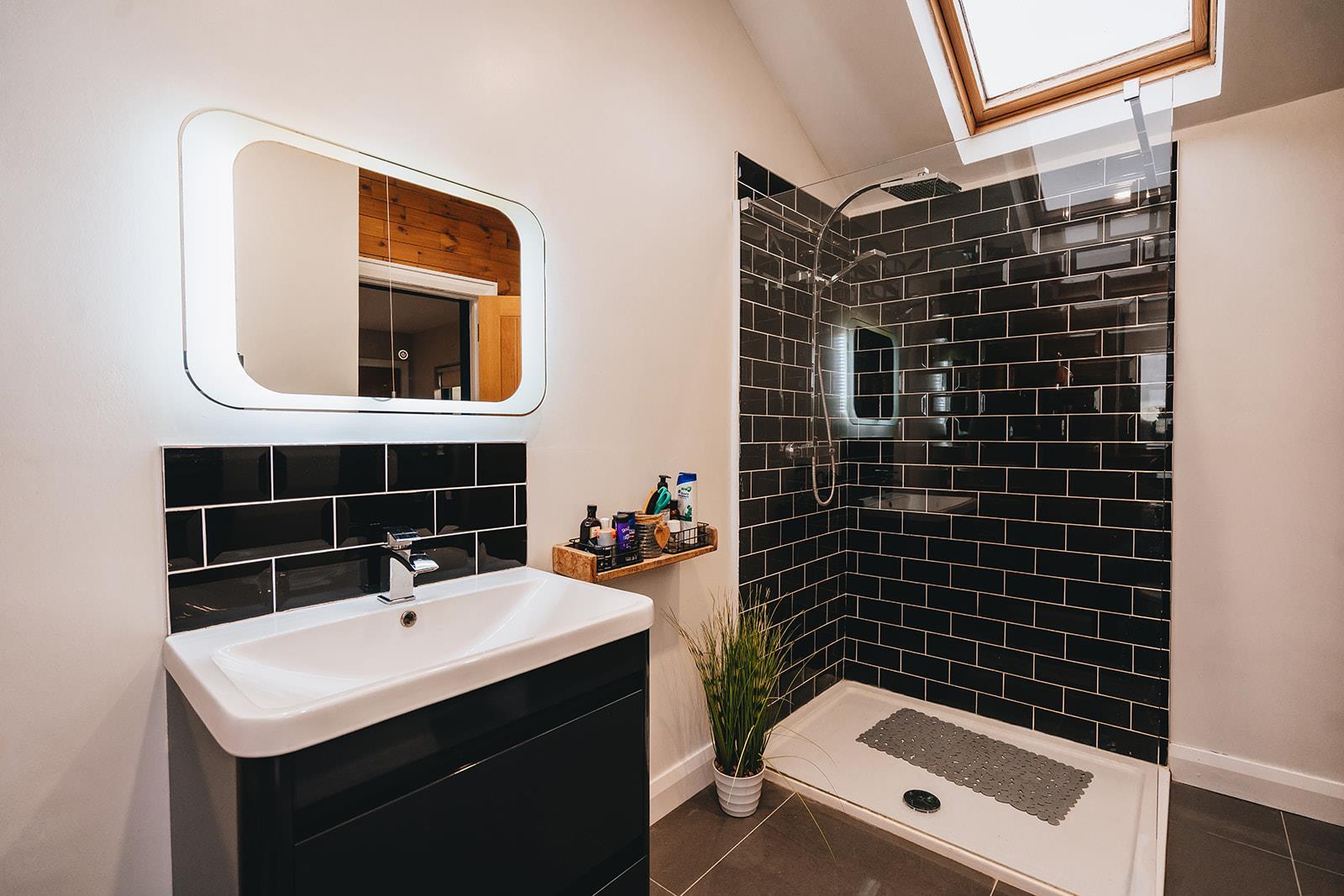Recently fitted shower room comprising tiled shower cubicle with thermostatic shower with rainfall shower head and hand attachment, double vanity unit with twin sinks and mixer taps, low flush wc, heated towel rail, part tiled walls, tiled floor and touch panel lighting.