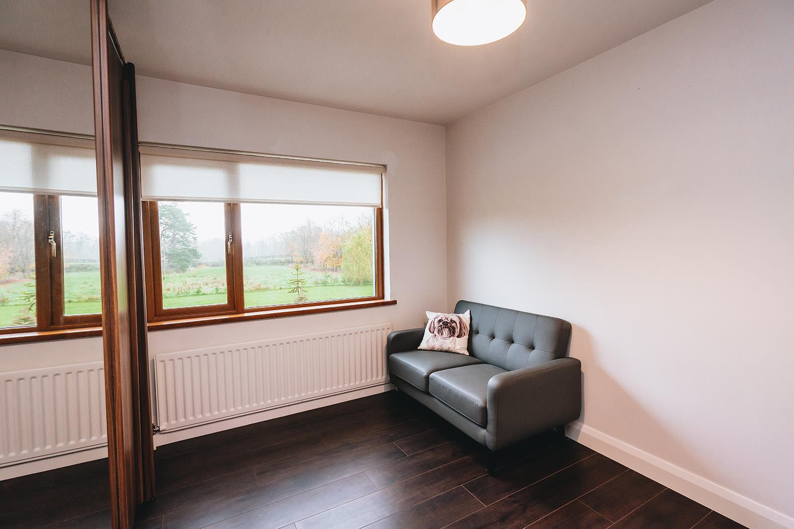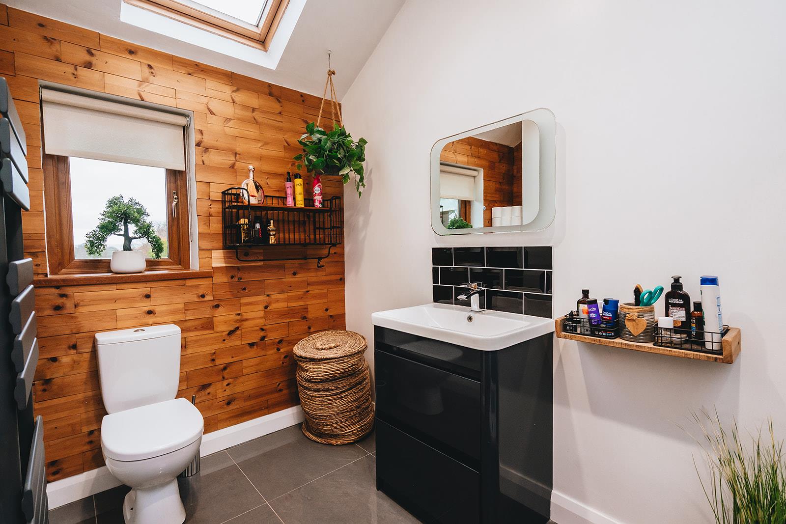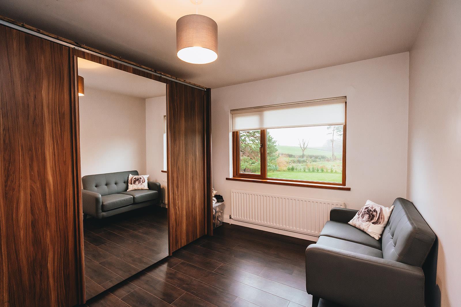 This master bedroom enjoys a triple aspect over the gardens and benefits from built-in slide robes, tiled floor and feature wood panelling. En-suite comprising walk-in tiled shower cubicle with thermostatic shower incorporating a rainfall shower head and hand shower attachment, vanity basin with mixer tap and tiled splashback, low flush wc, light-up bluetooth touch mirror, heated towel rail, tiled floor, 2 x Velux windows, feature wood panelling, low voltage spotlighting.