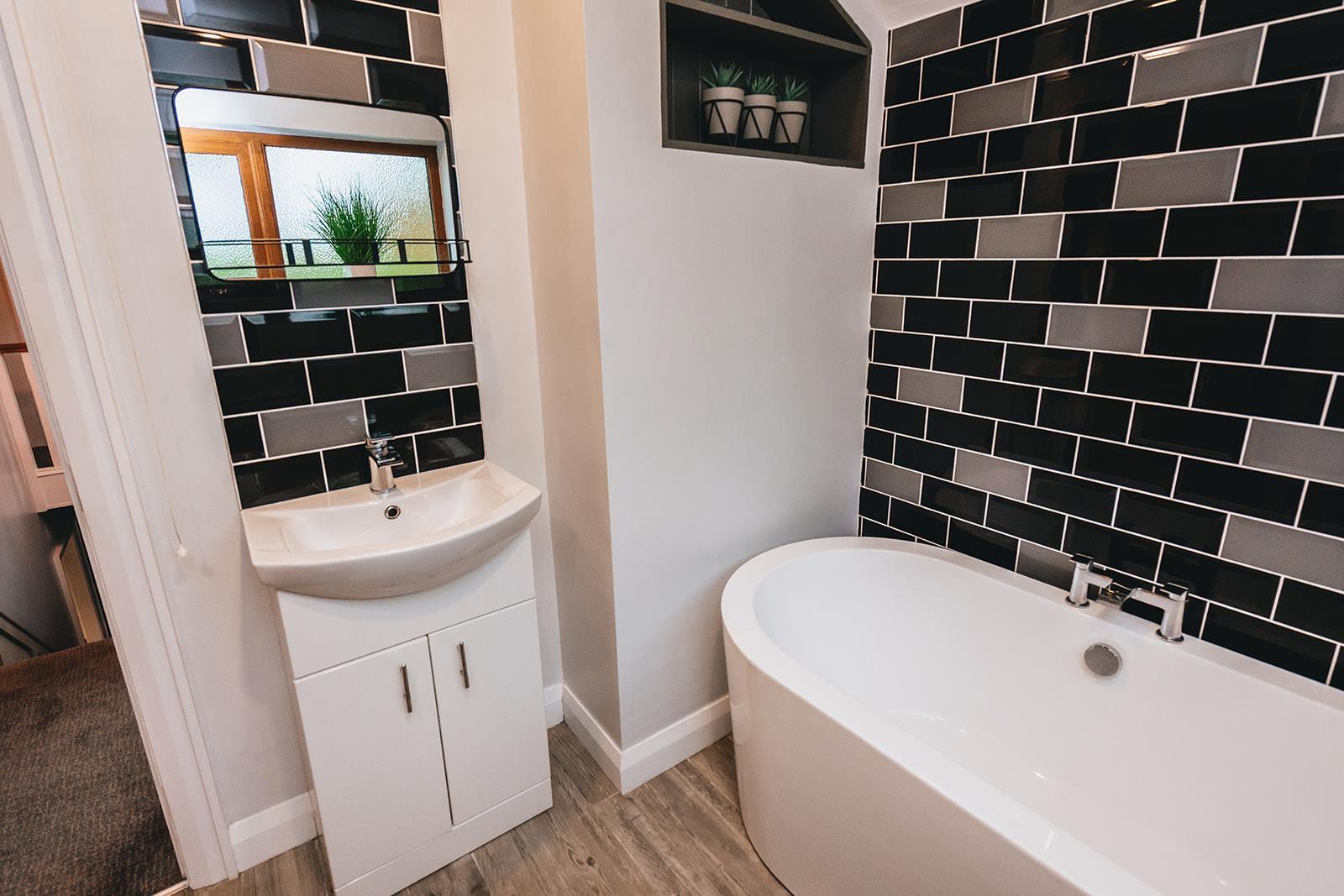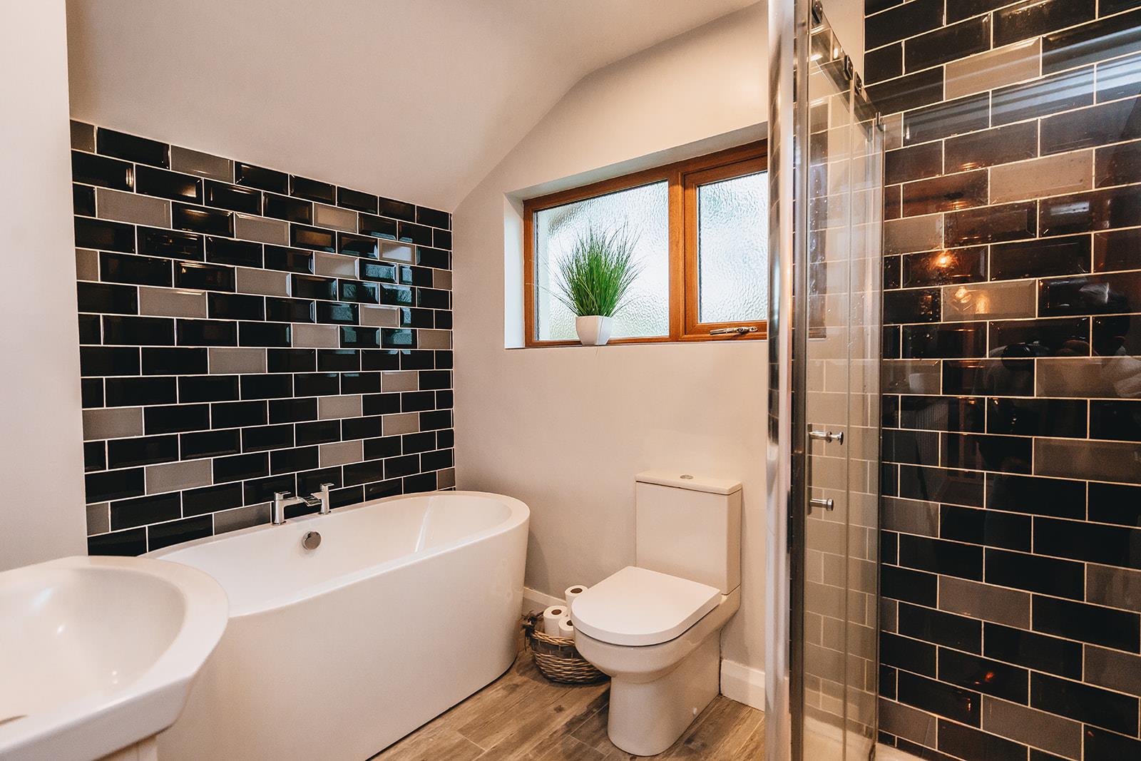 Family bathroom comprising freestanding bath with mixer tap, low flush wc,, vanity basin with mixer tap and tiled splashback, tiled shower cubicle with Mira Sport electric shower, heated towel rail, part tiled walls, tiled floor and low voltage spotlighting.