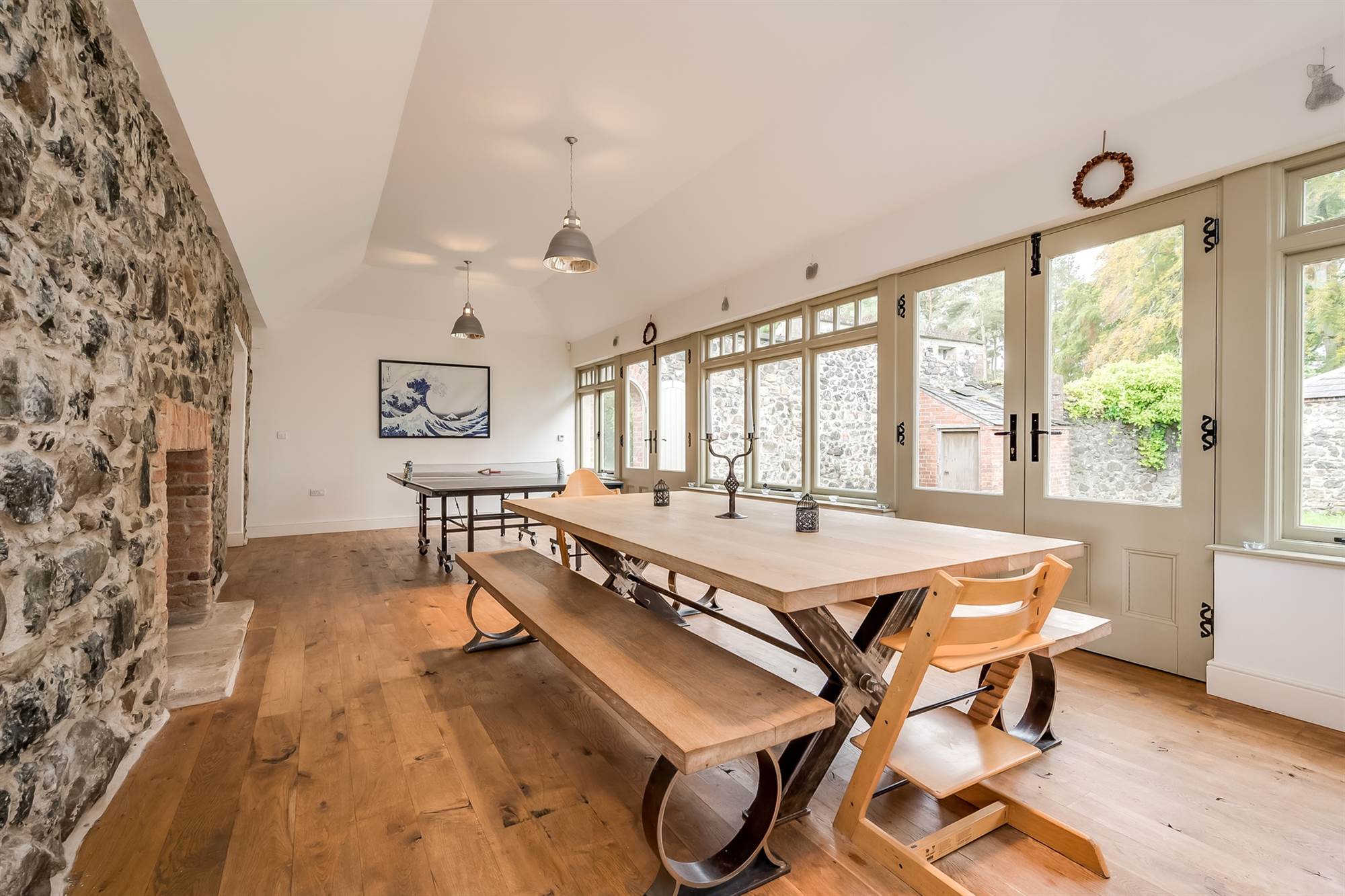 Casual Dining Area Open Plan to Modern Fully Equipped Hand Painted Kitchen with Oil Fired Aga. Separate Utility Room